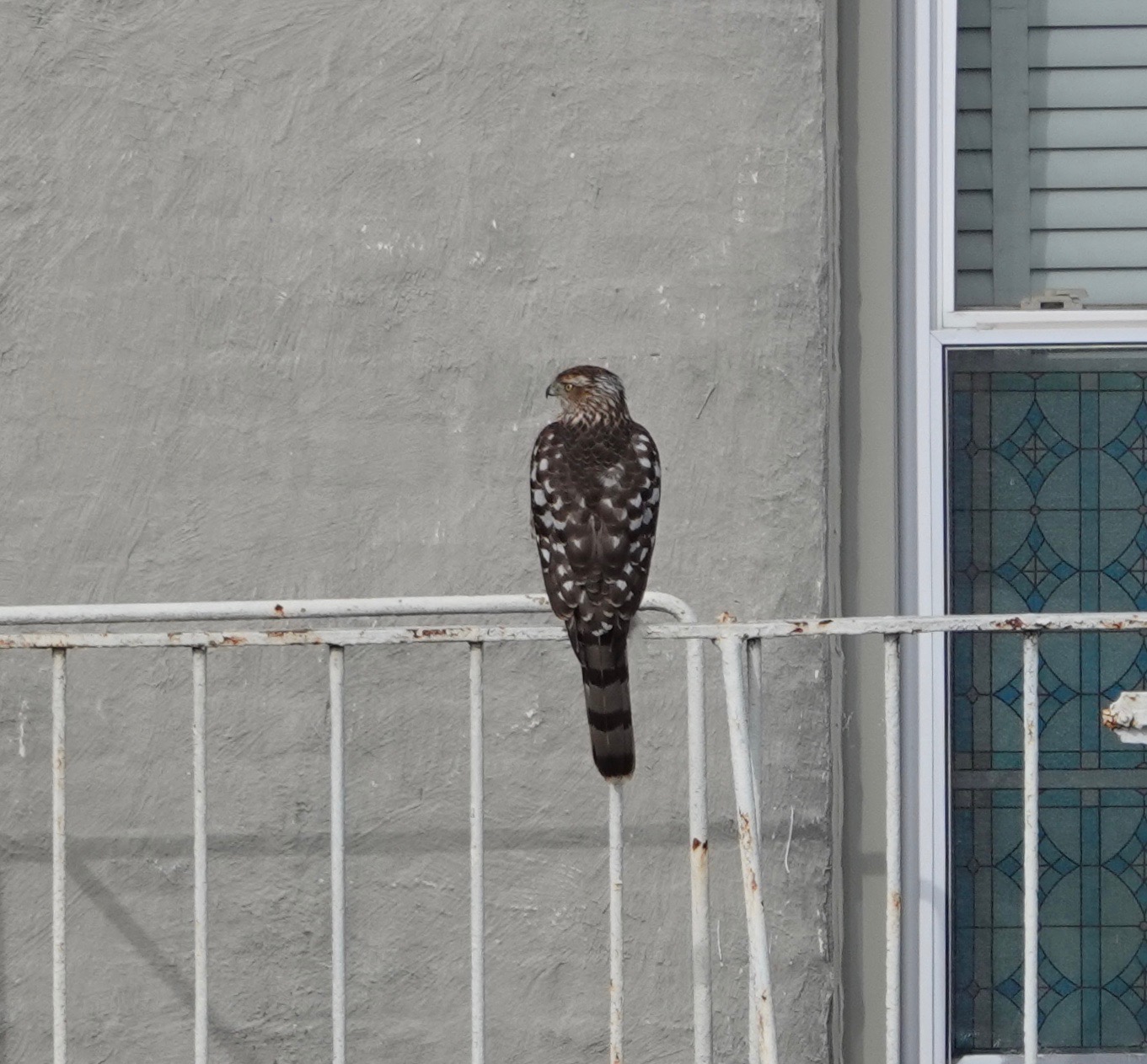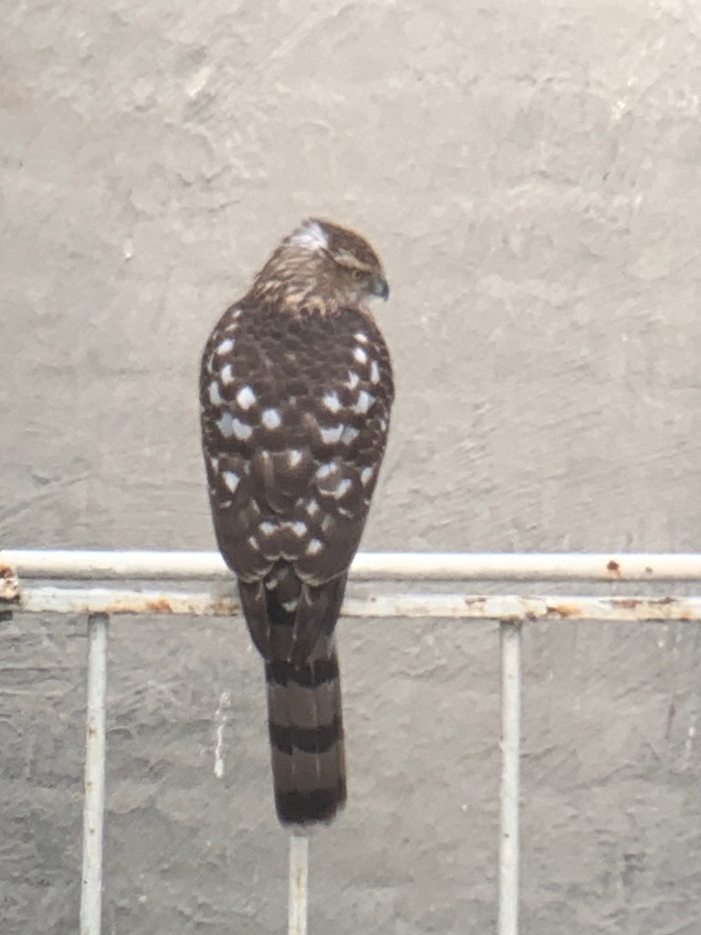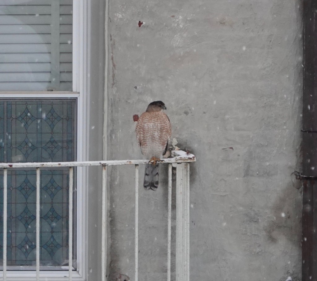 Definitely not the same Cooper’s. This is an adult is perched on the same fire escape as the juvenile pictured first above and below. This fire escape is a few yards (quite literally back yards) from the apple tree of the second juvenile Cooper’s photo.