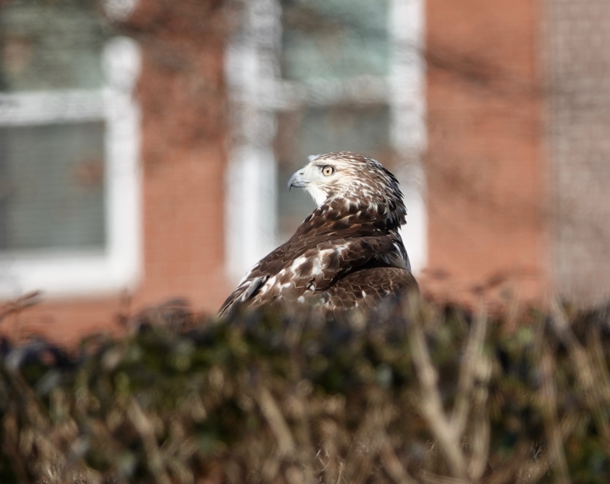 Two different Red-tailed Hawks eye-balling each other. The one on the ground has a couple of red feathers in its tail, on the way to full adult plumage.