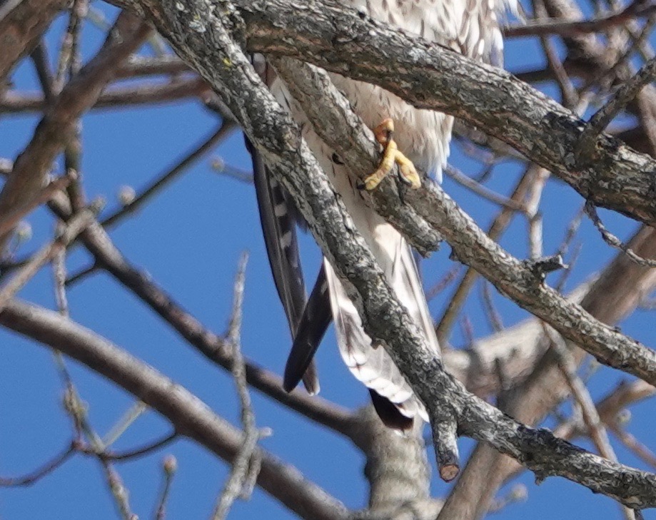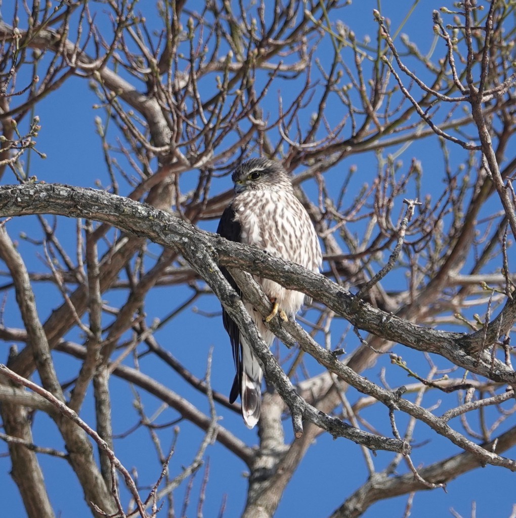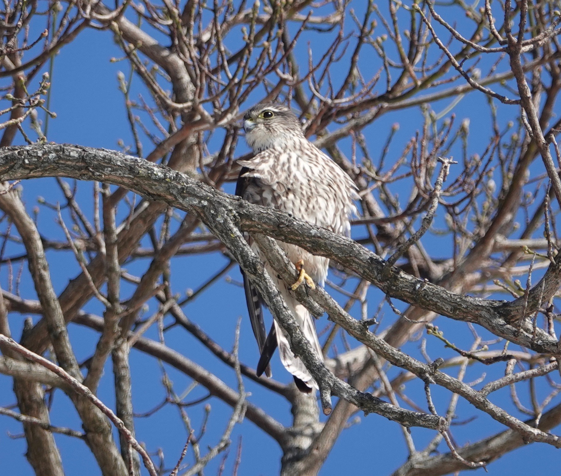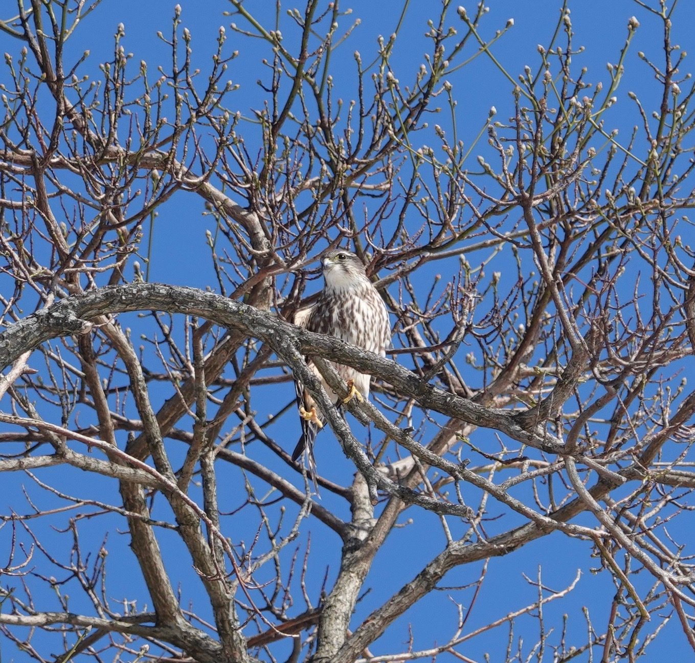 She was looking this way and that, that way and this. Down below, in the same tree, a squirrel moved about. Merlins mostly eat birds. “Pigeon Hawk” is an old name for them; the binomial Falco columbarius nods also to the pigeons. Prey can include anything from kinglets and gnatcatchers to woodcock and green-winged teal. Chimney Swifts have even been recorded! Bats, toads, grasshoppers, dragonflies, pocket gophers… squirrels — Bent doesn’t specify what species of squirrels.