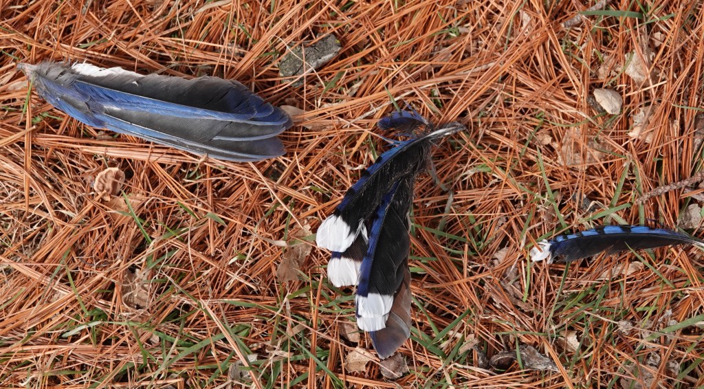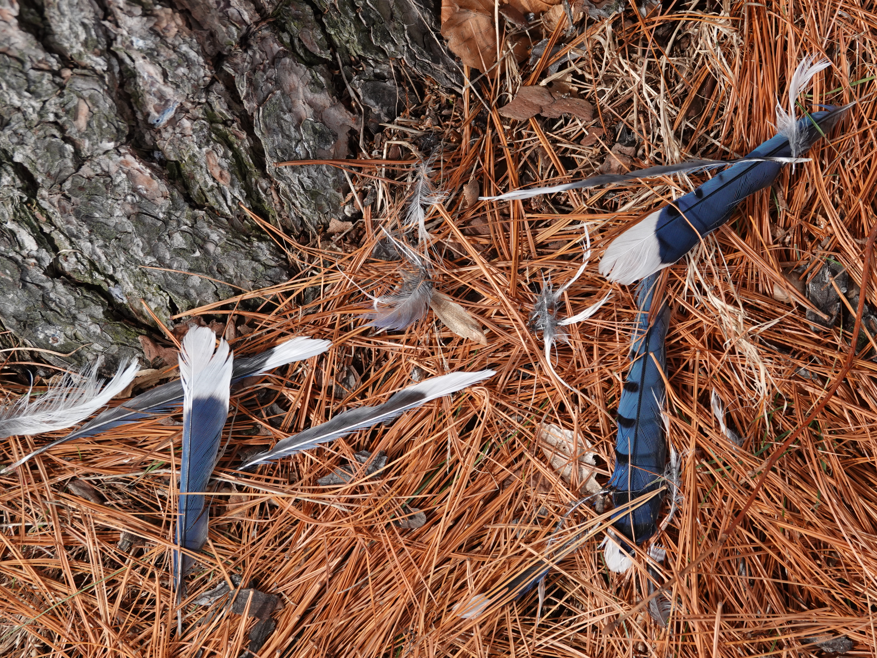 They aren’t just doing it for kicks. They know who eats them. These feathers were the remains of one under a pine.