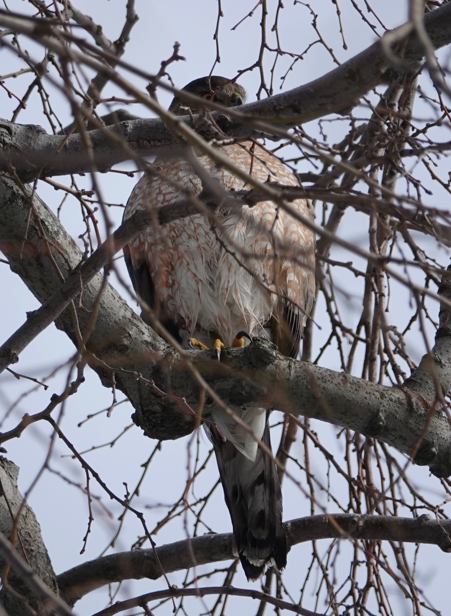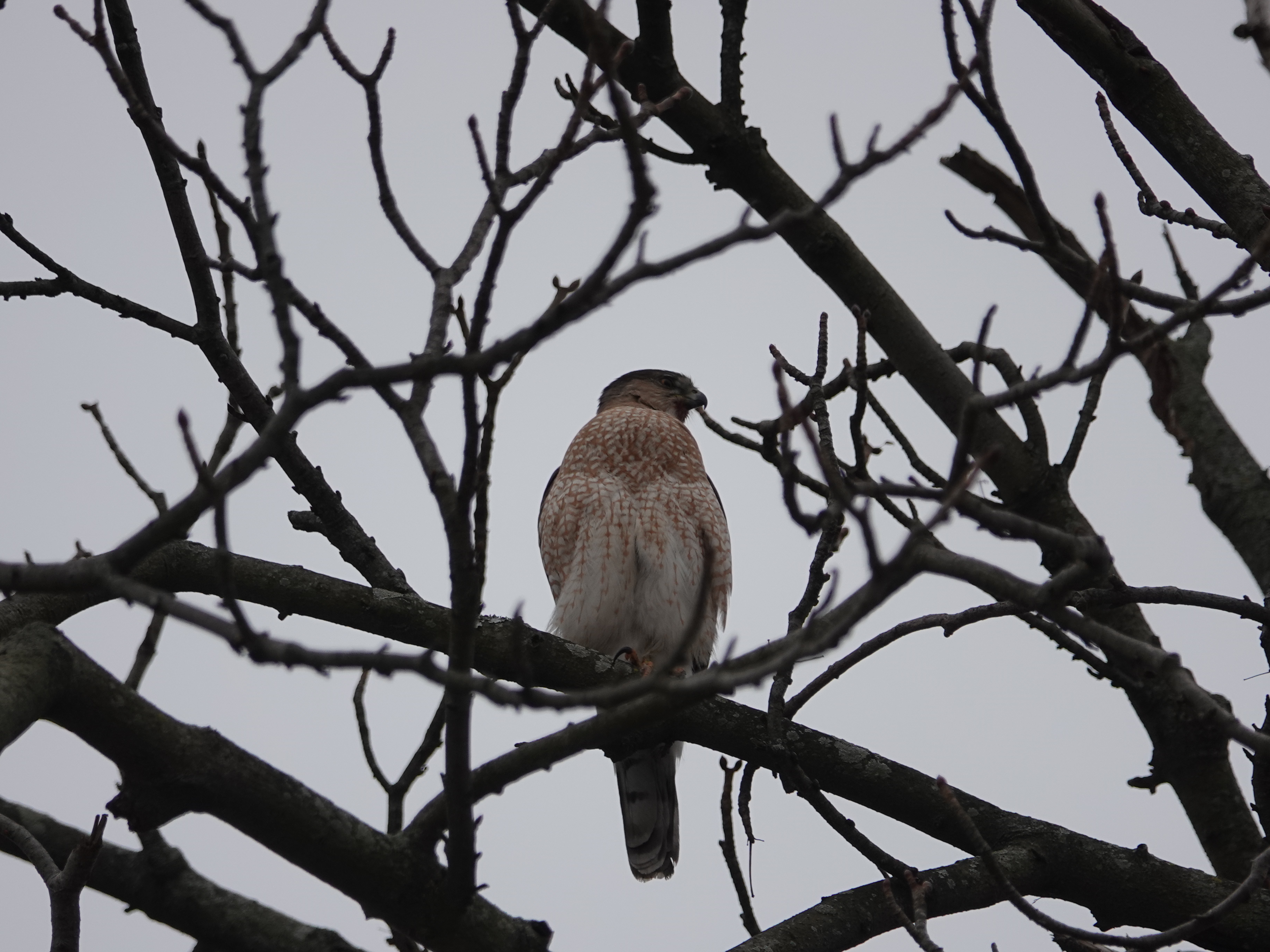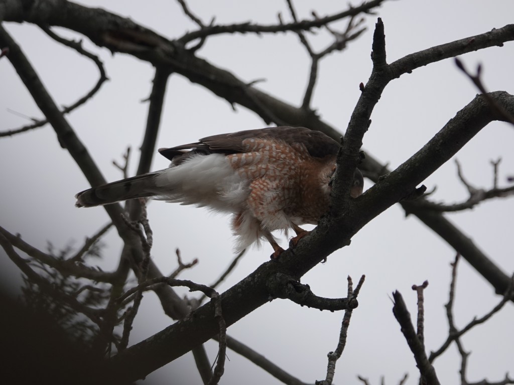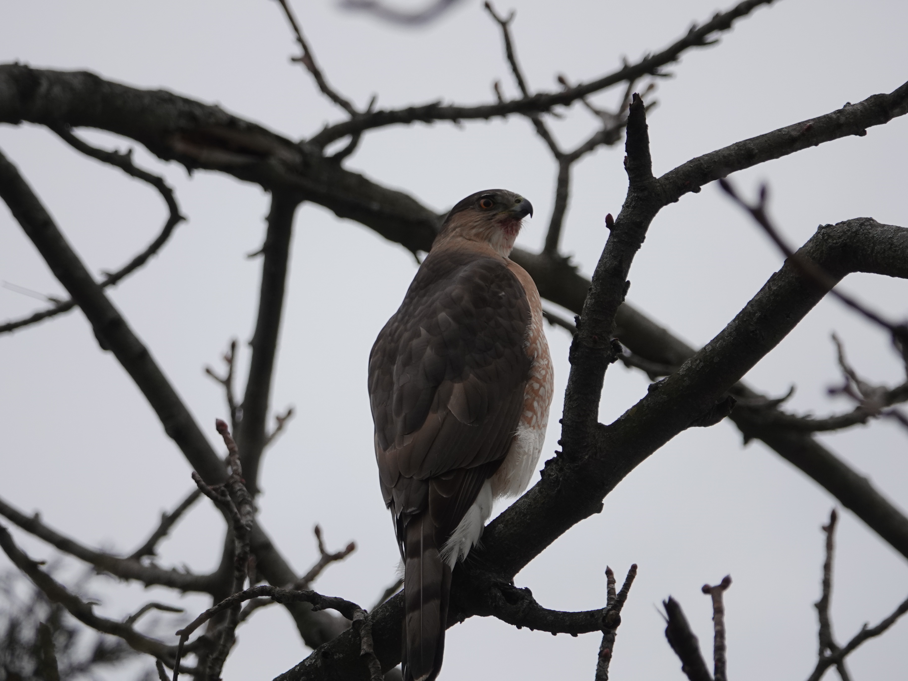 A couple of days later, in the same tree. The bird’s crop was bulging with a meal, and there was blood under the chin.