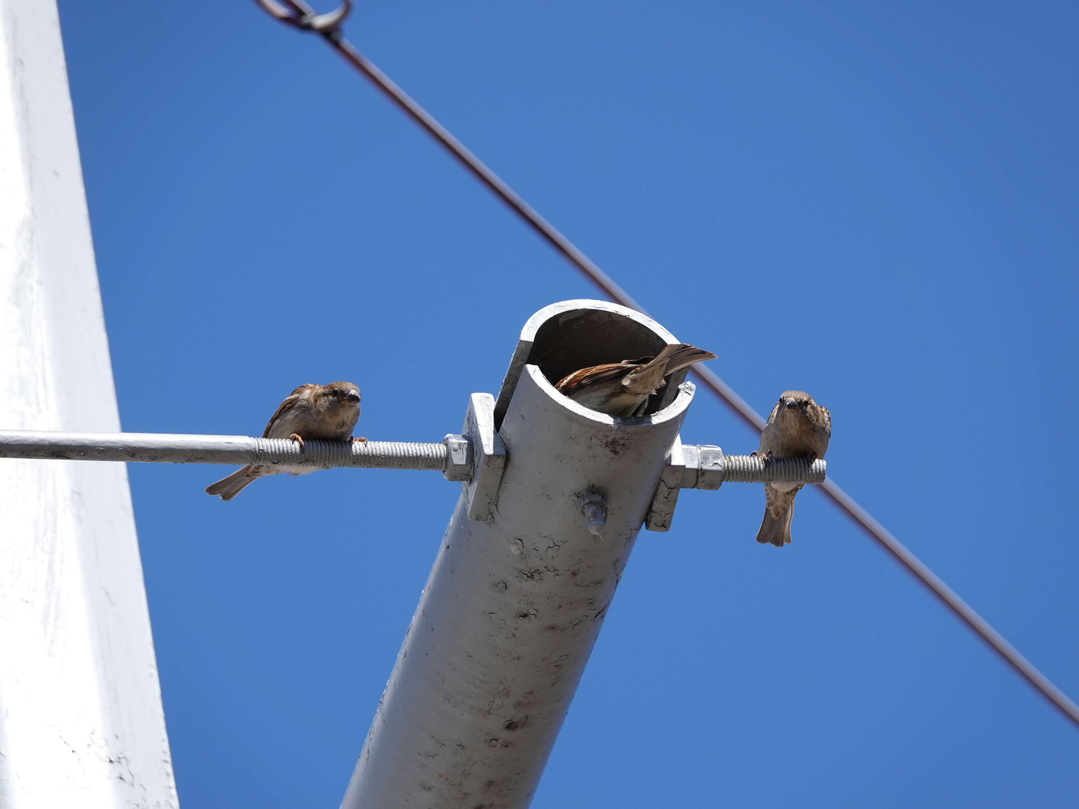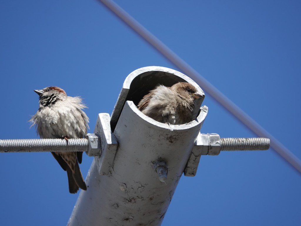 I’ve posted pictures of these traffic light support poles before. Practically every single one has a House Sparrow nest at both ends. And the birds are staking their claims over them now, actively! See also yesterday’s post.