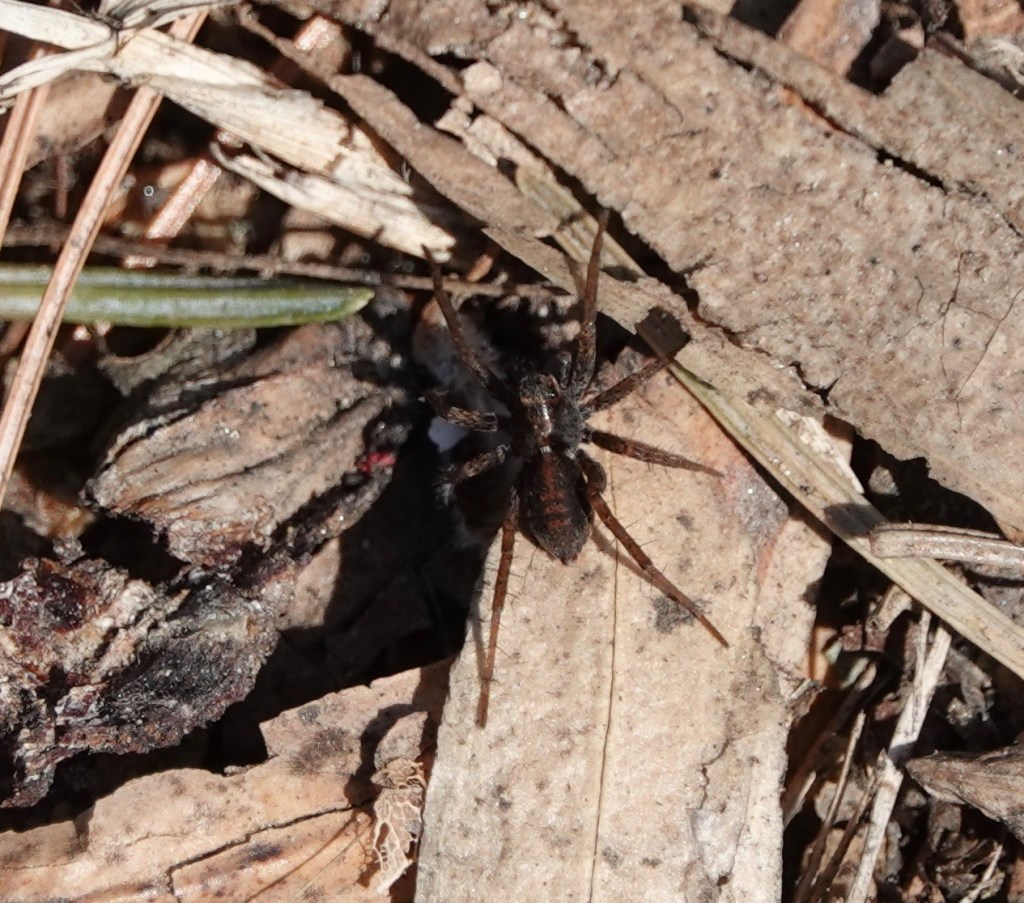 There are places where the ground is crawling with what I think are thin-legged wolf spiders.
