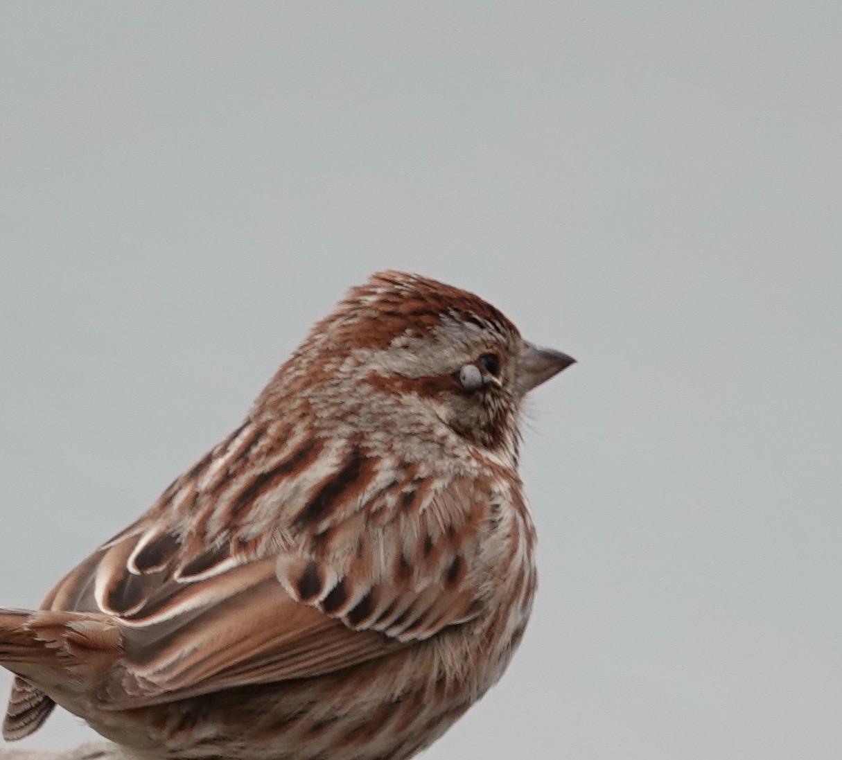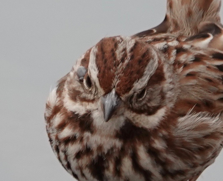 A Song Sparrow with what looks like a tick attached to the side of the eye. There are a few (at least) Ixodes genus bird ticks.