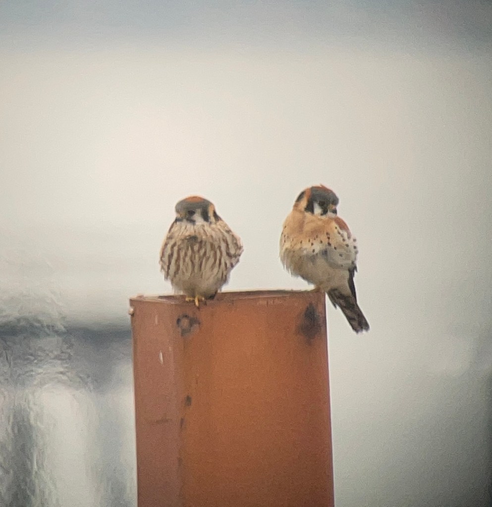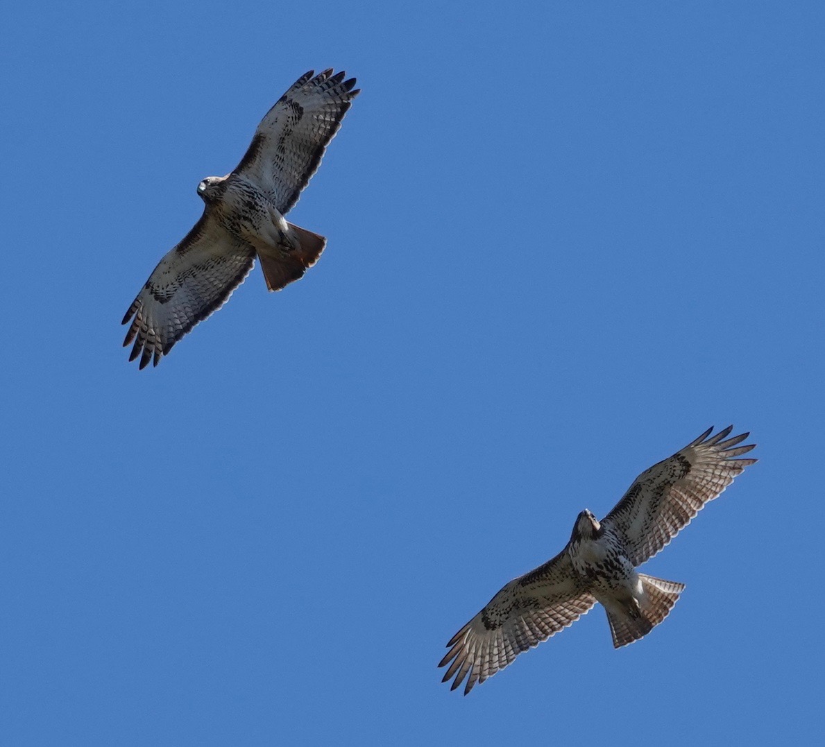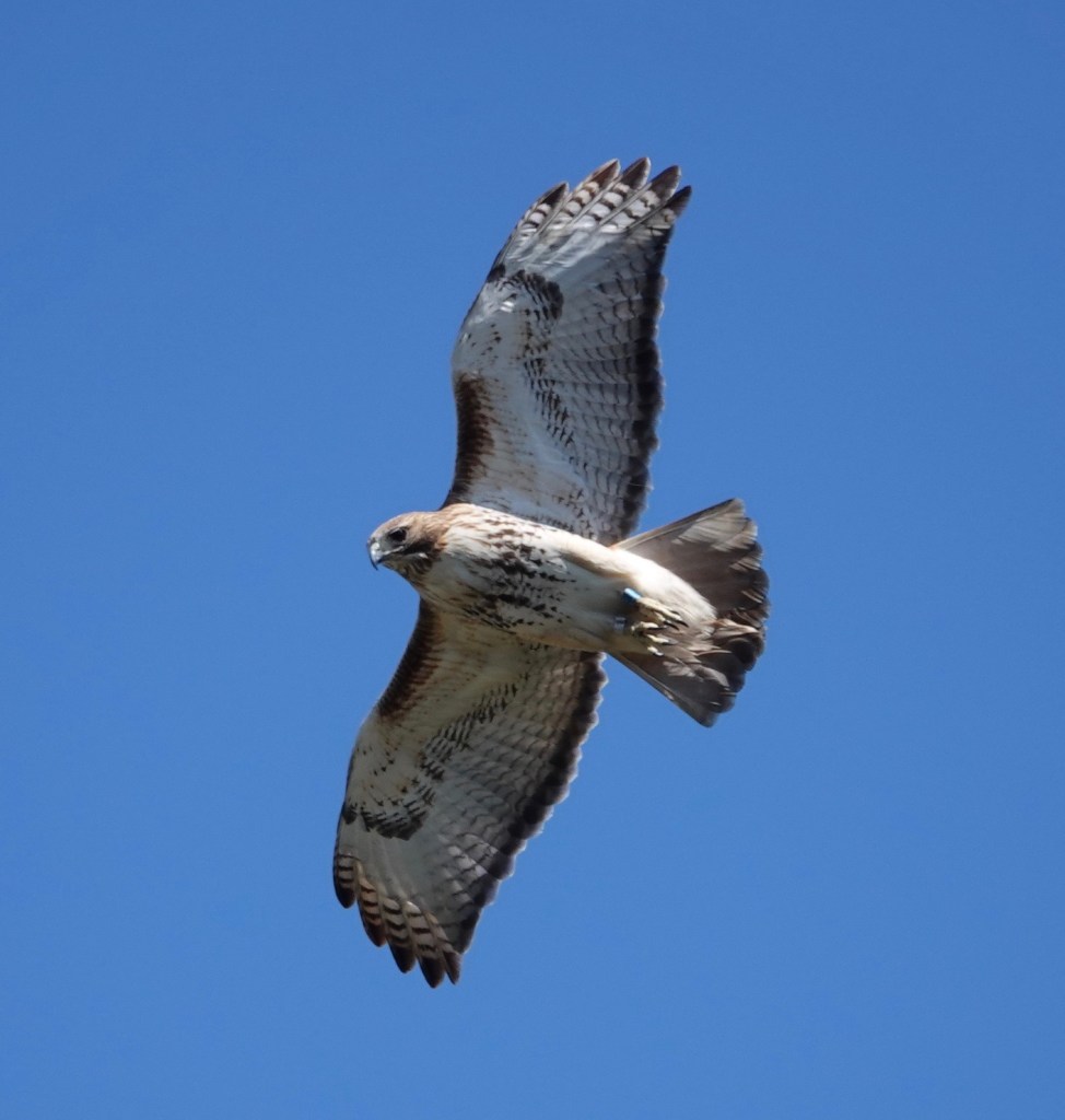 There’s a light blue band on this Red-tailed Hawk, in addition to the regular silver band on the other foot. Don’t see many banded hawks around here.
