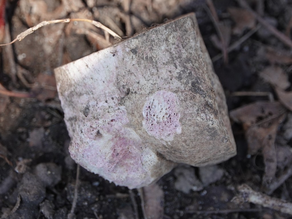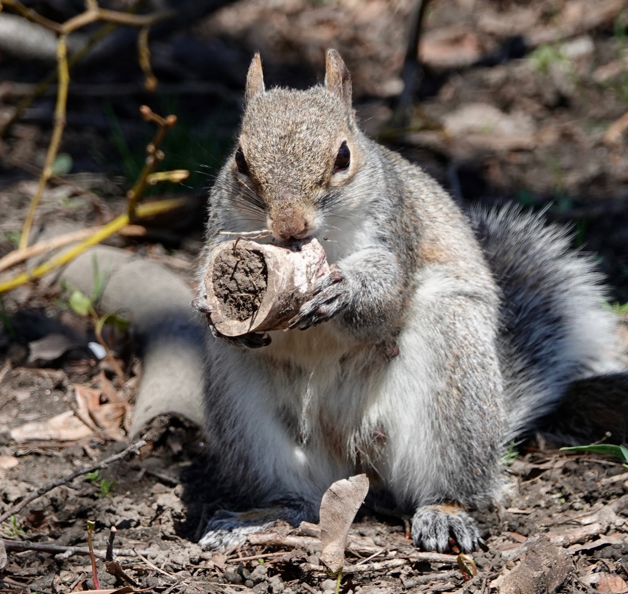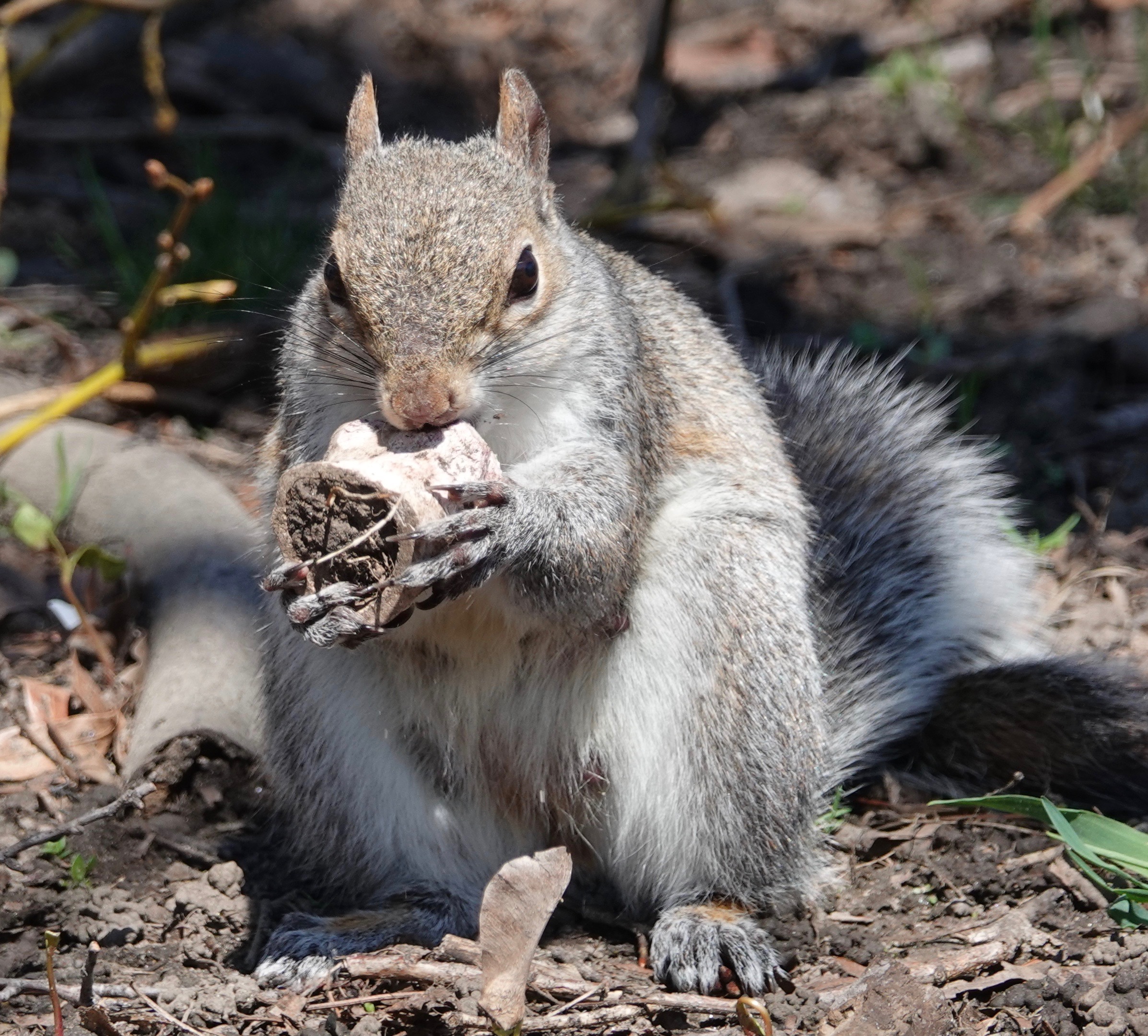 Grey Squirrel gnawing on a bone. You know, one of those bones you find downslope from the road where the garbage piles up…. I suspect this is like the recycling of deer antlers by mice and other mammals in the forest. Going for the calcium? This may well be the nesting female seen earlier this month.
