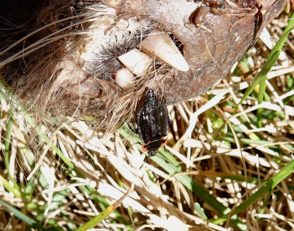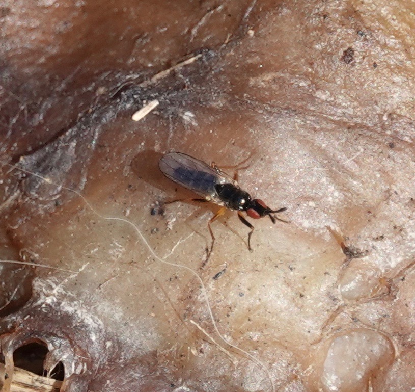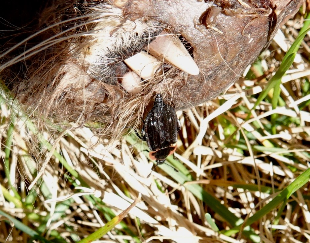 Same carcass: Waltzing Fly (Prochyliza xanthostoma). So named because when the males fight they supposedly look they’re dancing. The larvae will eat old meat, and stinking cheese. A name for the larvae is “cheese skipper” because they jump out of the cheese when startled. Pop! Reminds me of the tars knocking the weevils out of the hardtack in the Hornblower novels.