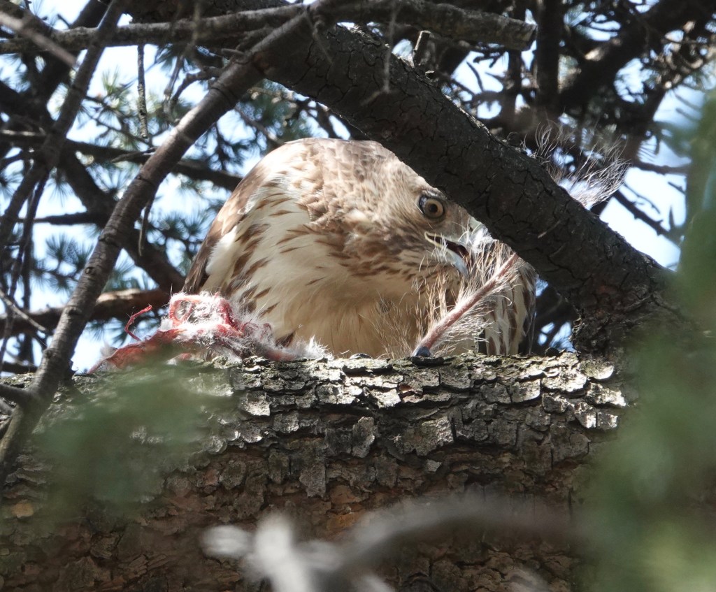 Uh-oh. Trouble. This Red-tailed Hawk cached the remains (Gray Squirrel, I think) in this Atlas cedar. I saw the bird fly in empty-taloned, clamber up a limb, and only then start in on the retrieved leftovers.