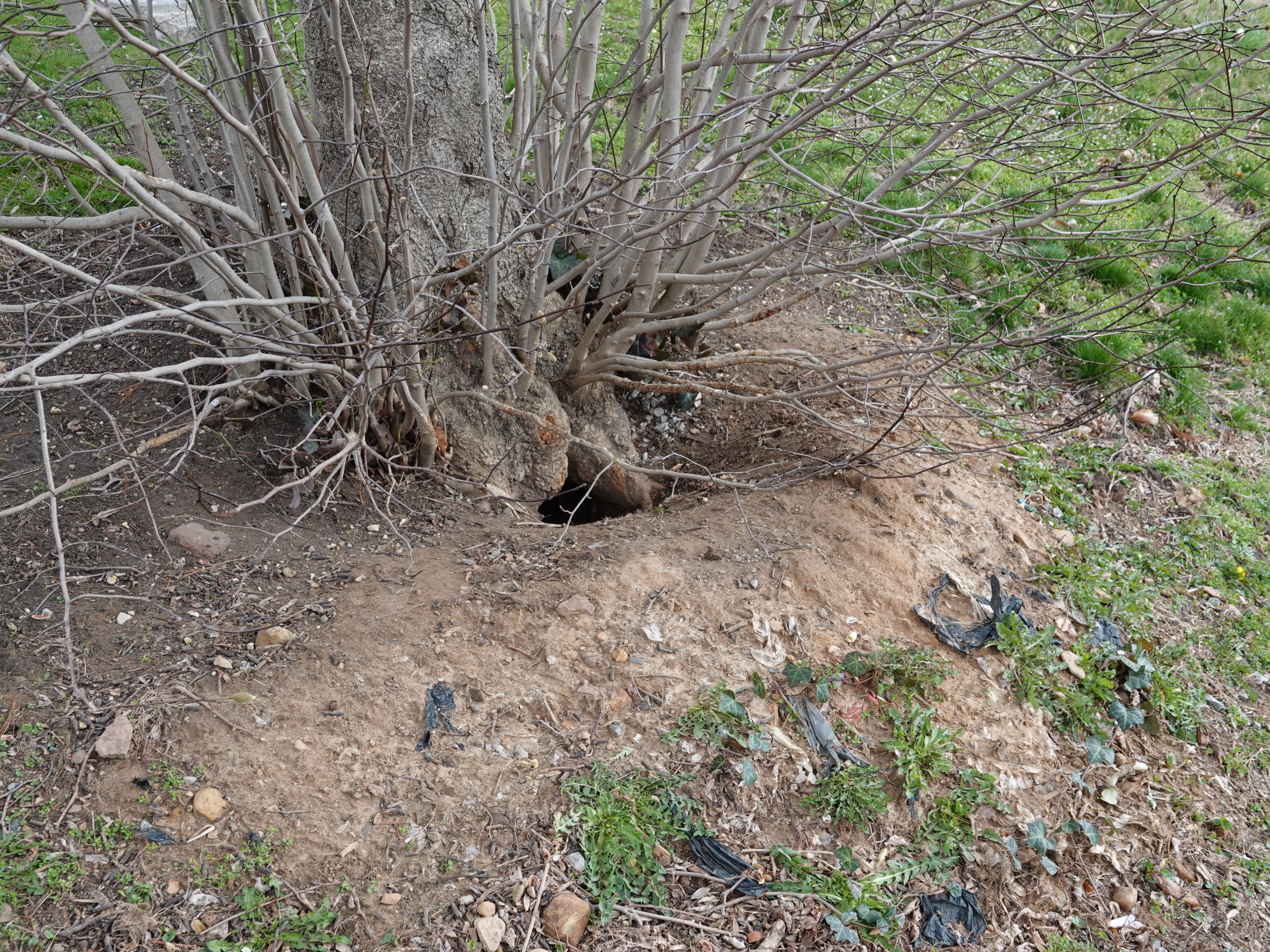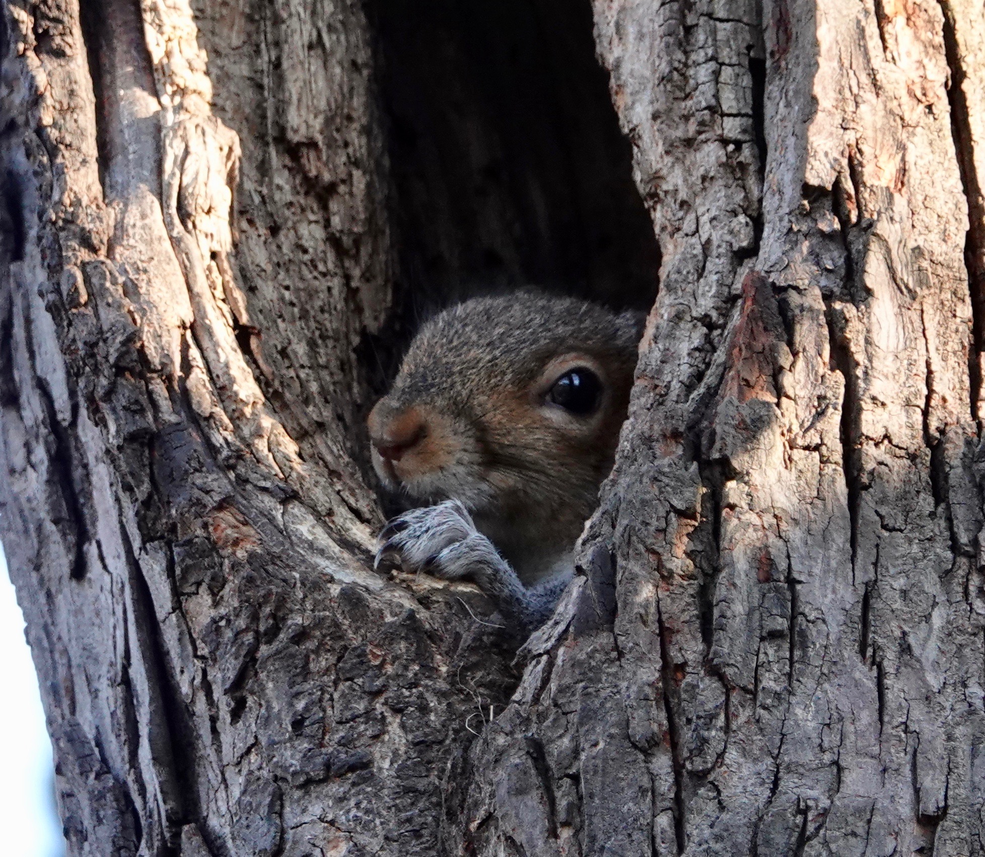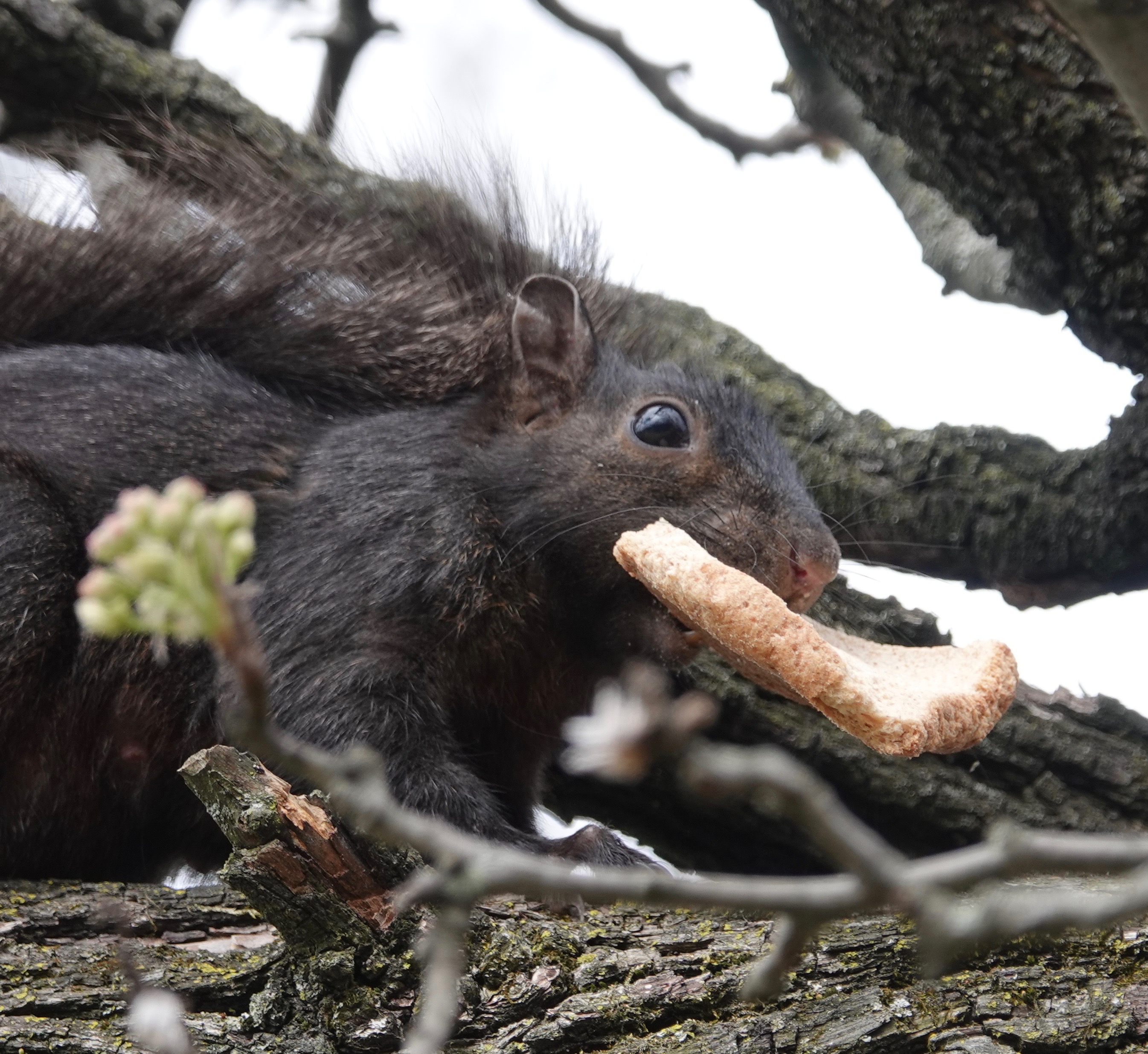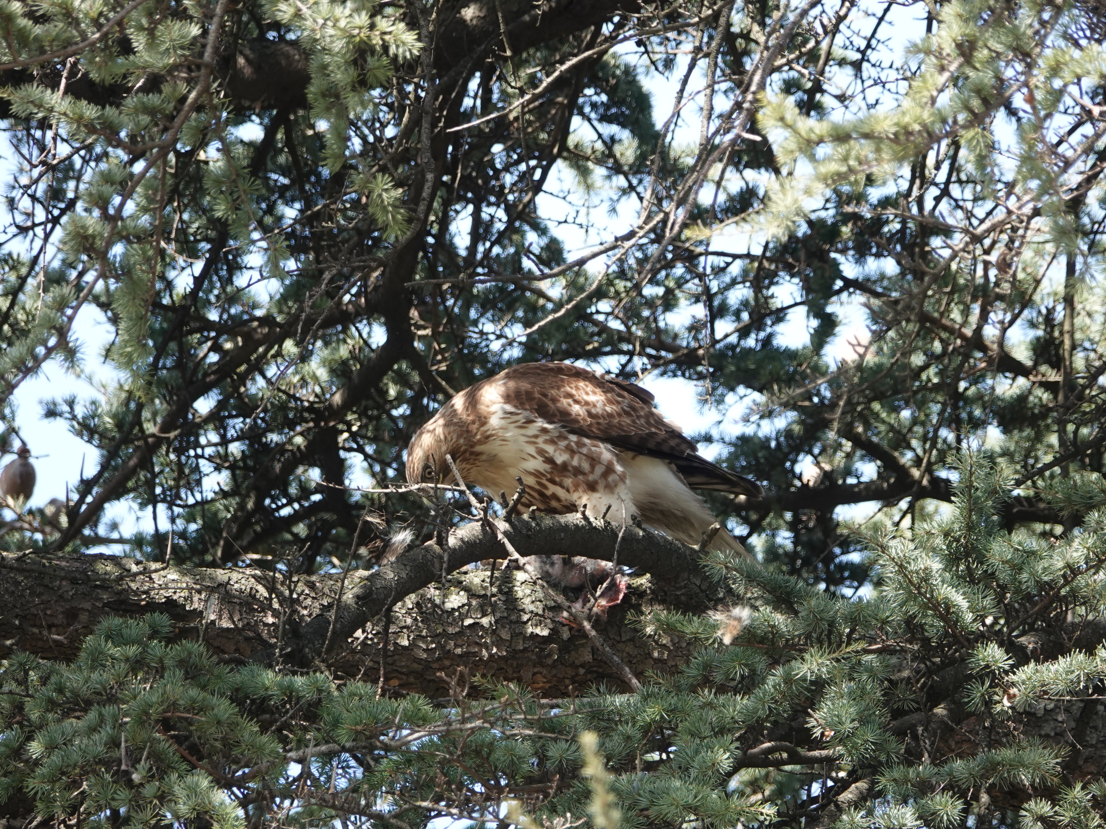 Uh-oh. Trouble. This Red-tailed Hawk cached the remains (Gray Squirrel, I think) in this Atlas cedar. I saw the bird fly in empty-taloned, clamber up a limb, and only then start in on the retrieved leftovers.