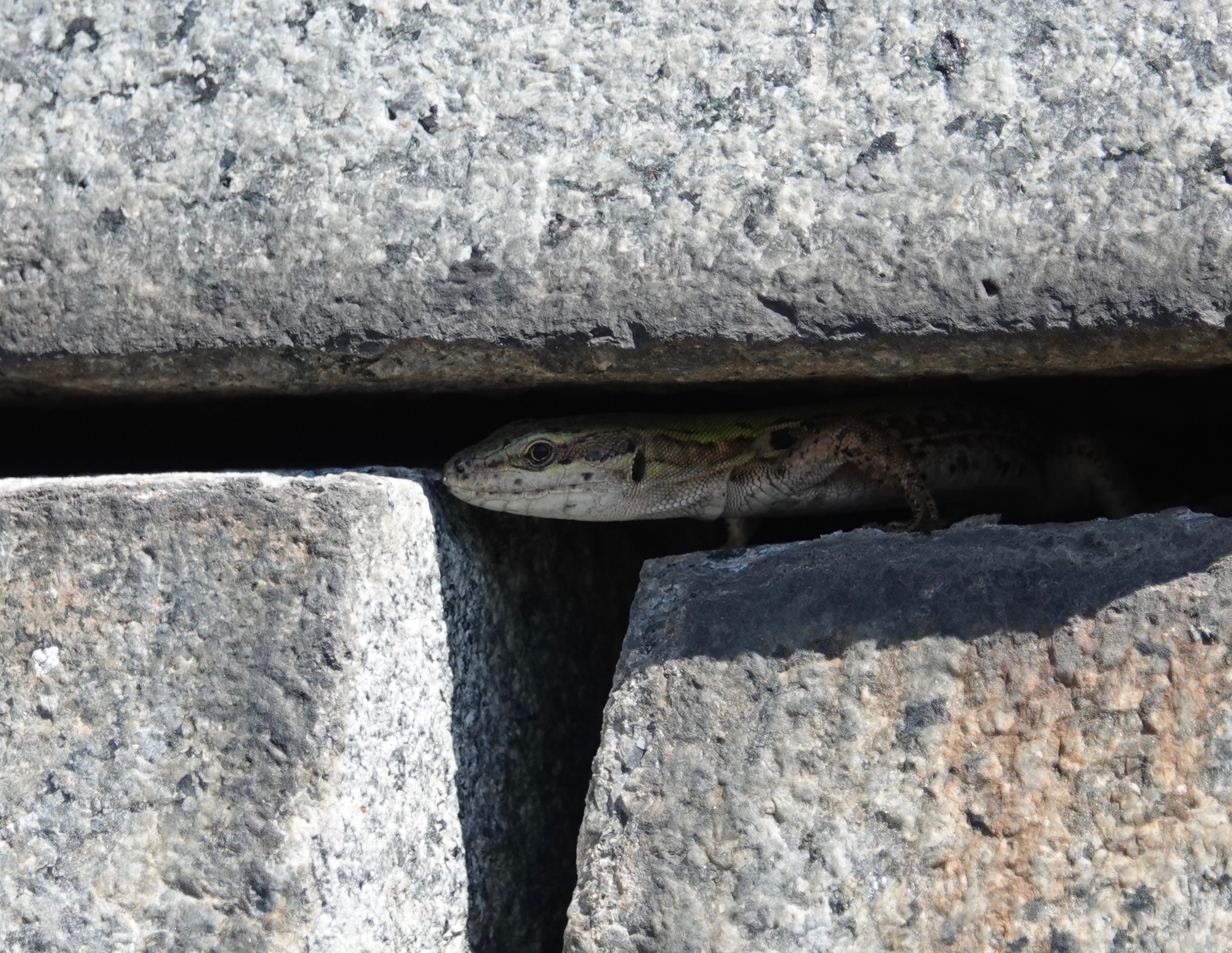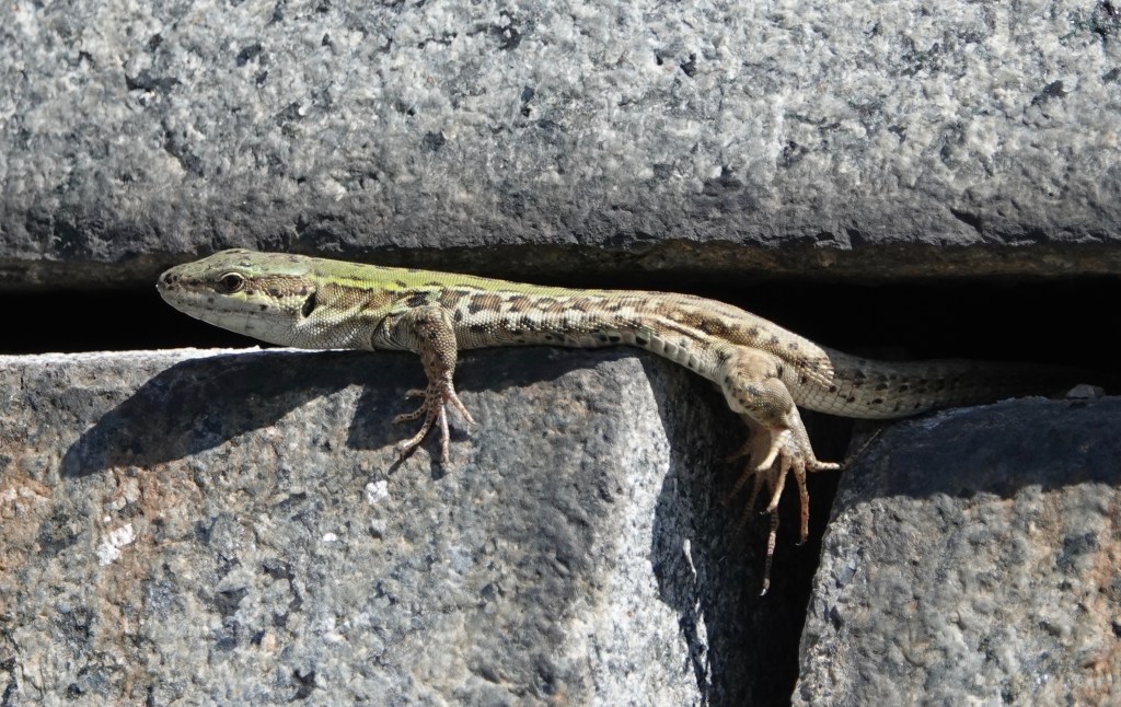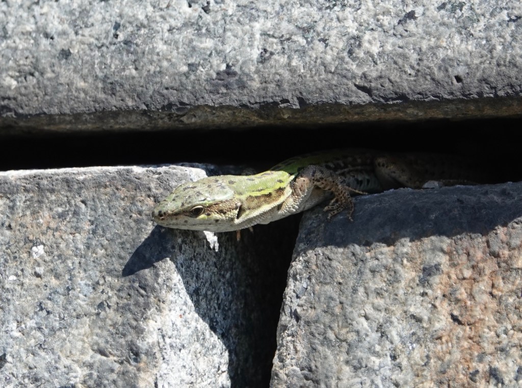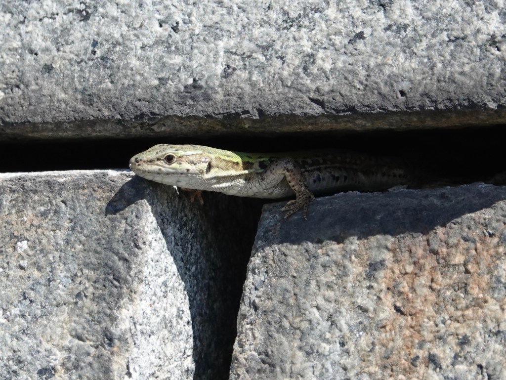 The Northern Italian Wall Lizards seem to be doing well. I counted eight the other day, including the one in the series of photos below, peeking out of a crevice in a pyramidal mausoleum.