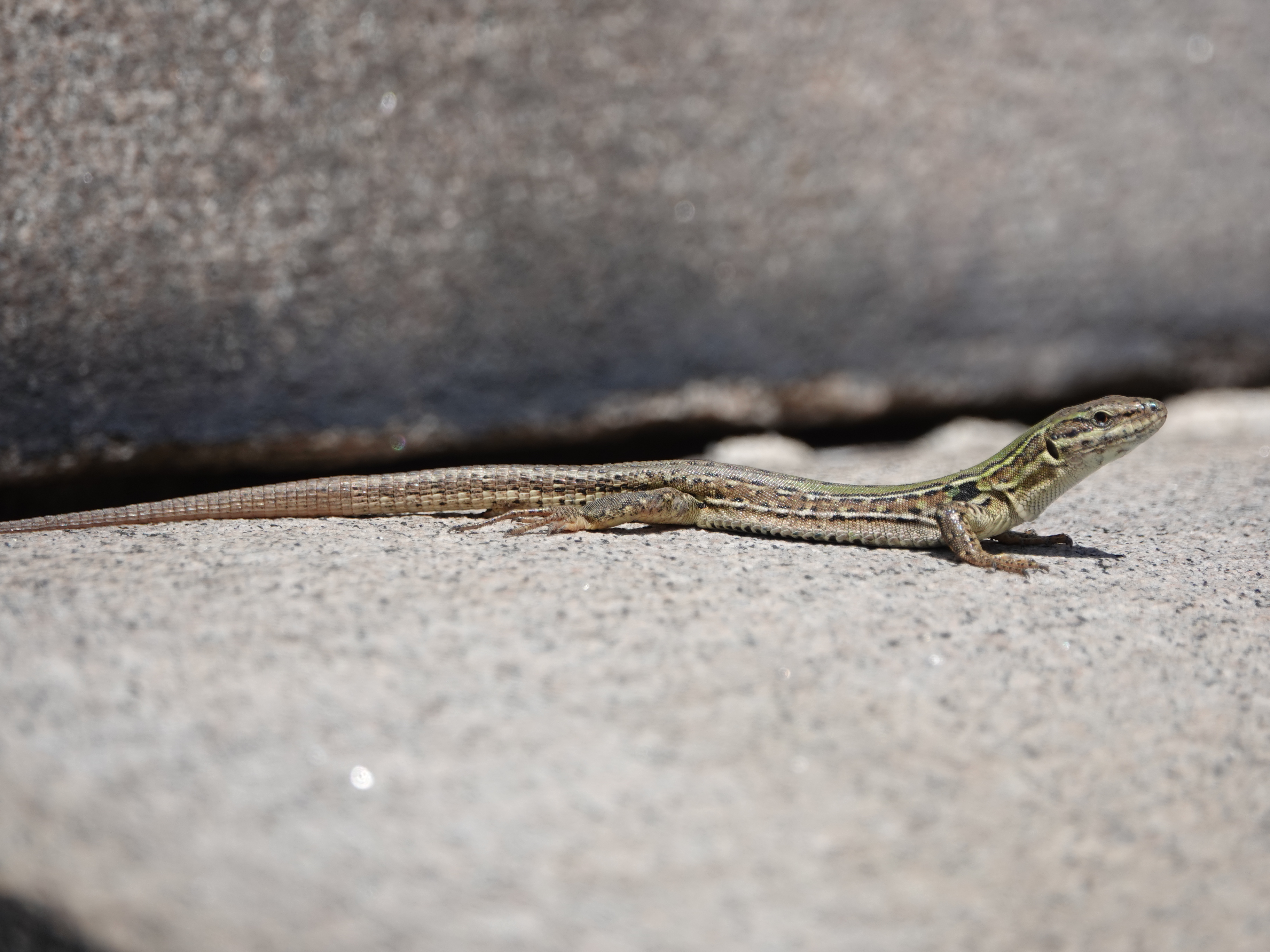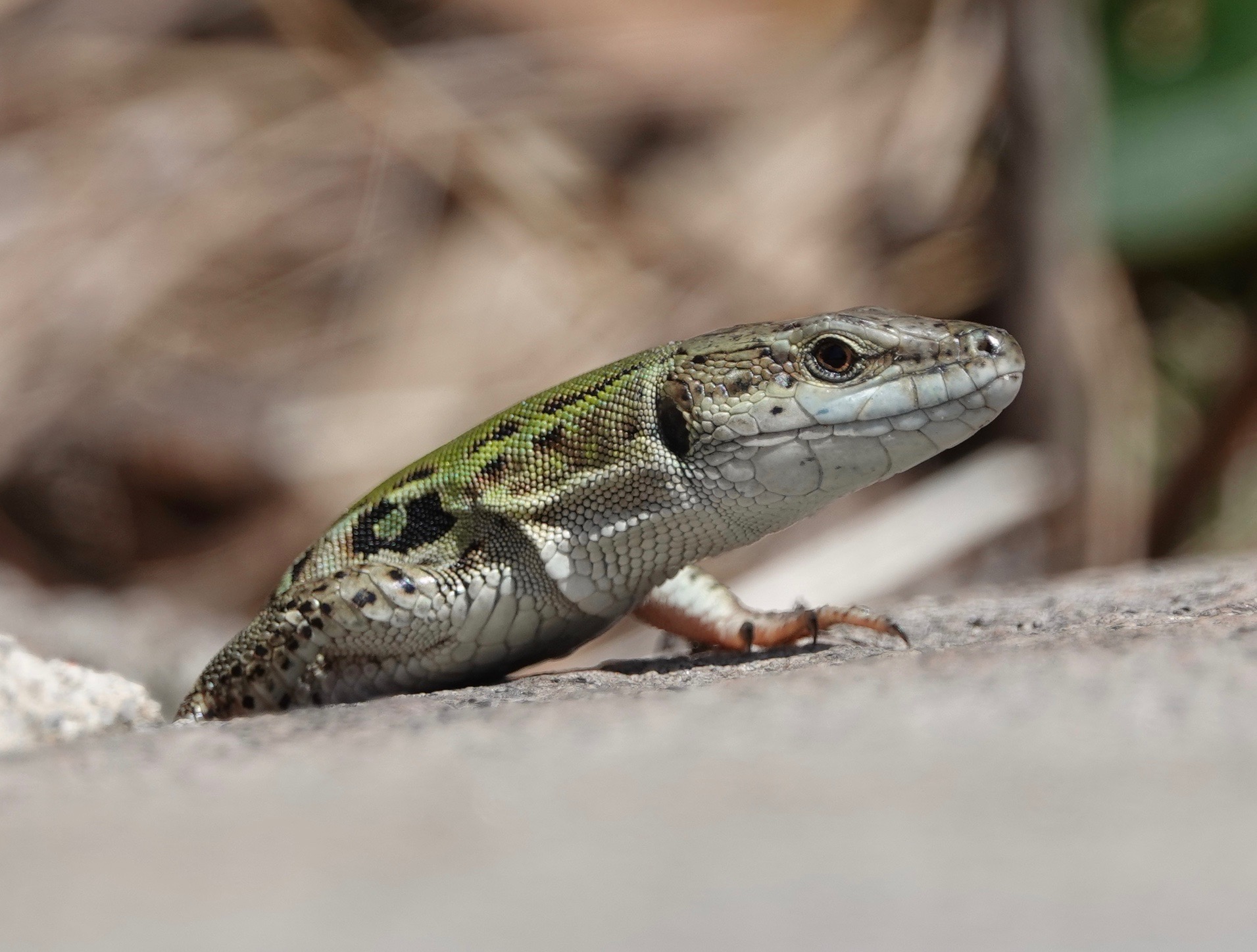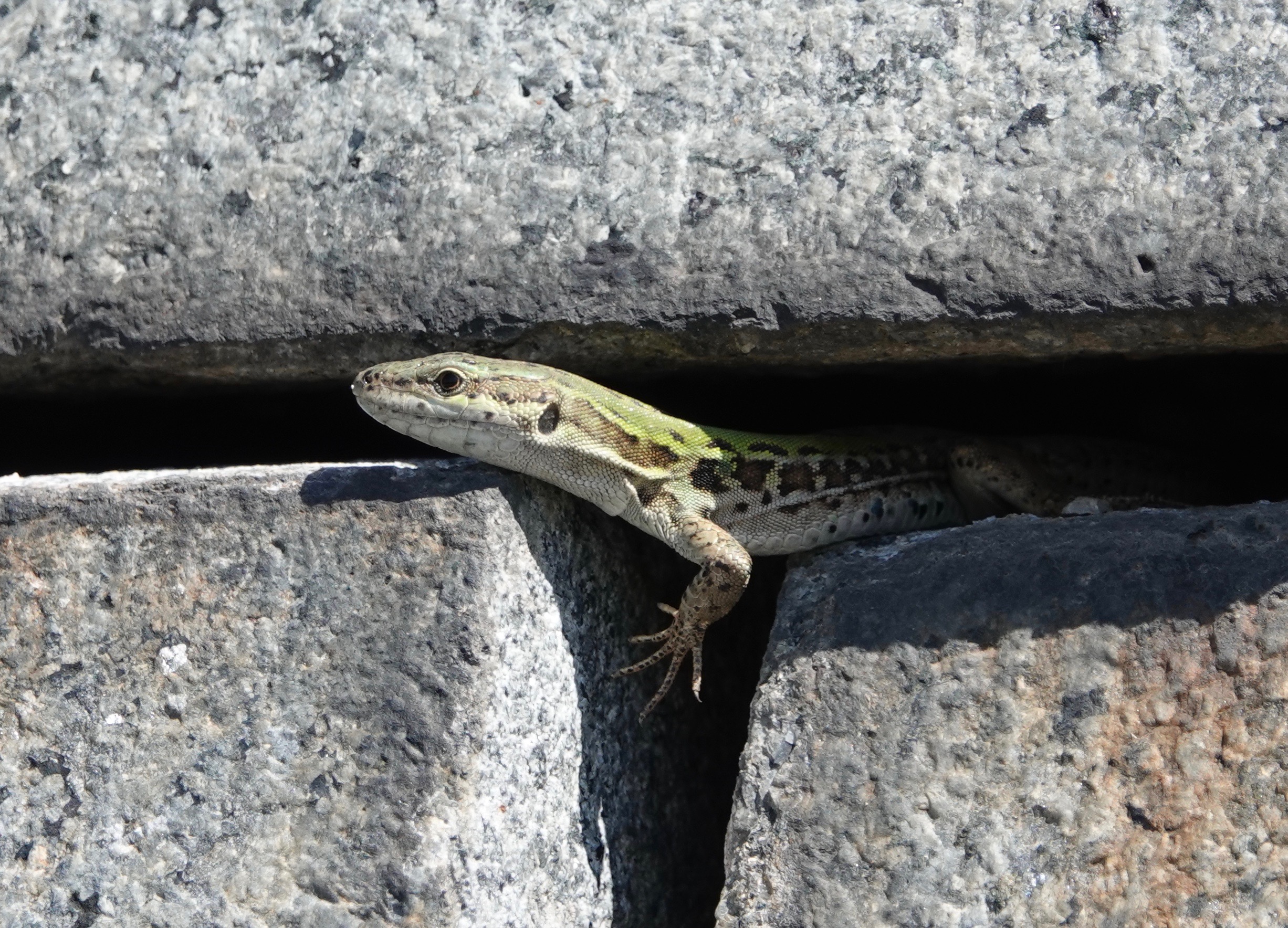 The Northern Italian Wall Lizards seem to be doing well. I counted eight the other day, including the one in the series of photos below, peeking out of a crevice in a pyramidal mausoleum.