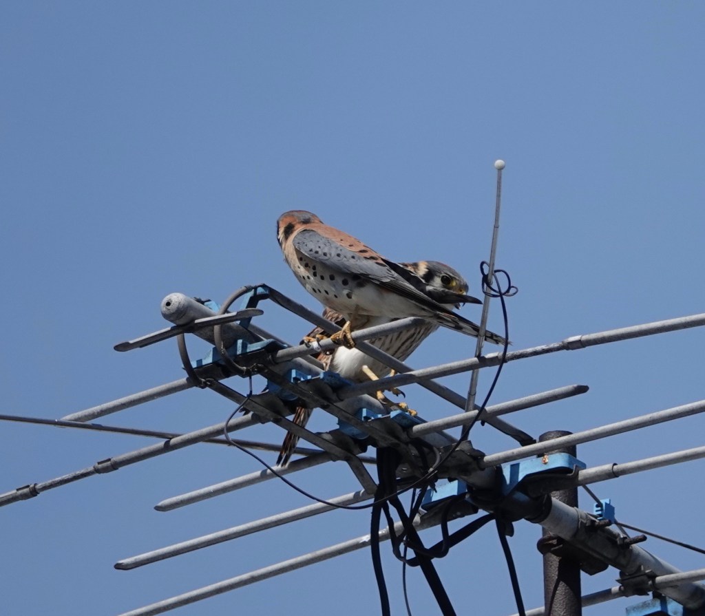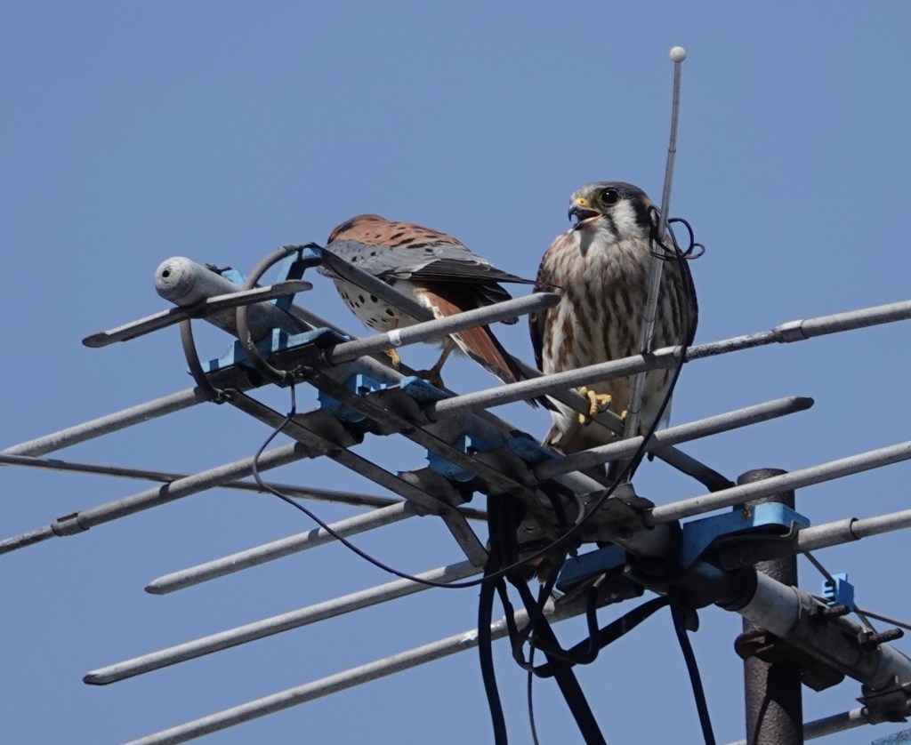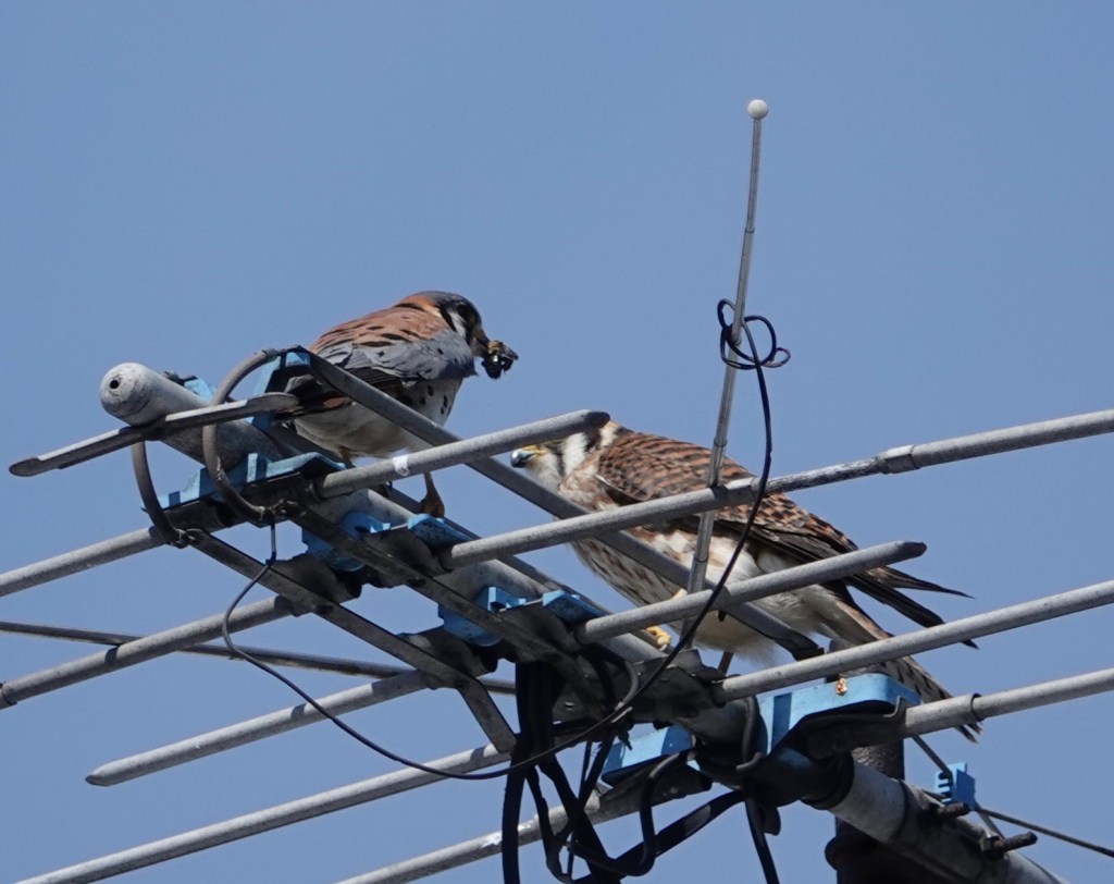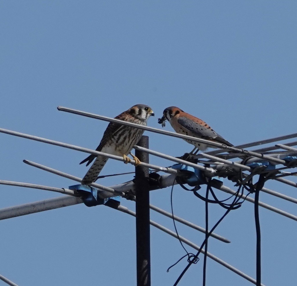The female came back out a few moments later and landed on a TV antenna the next block over. The male joined her. With food.