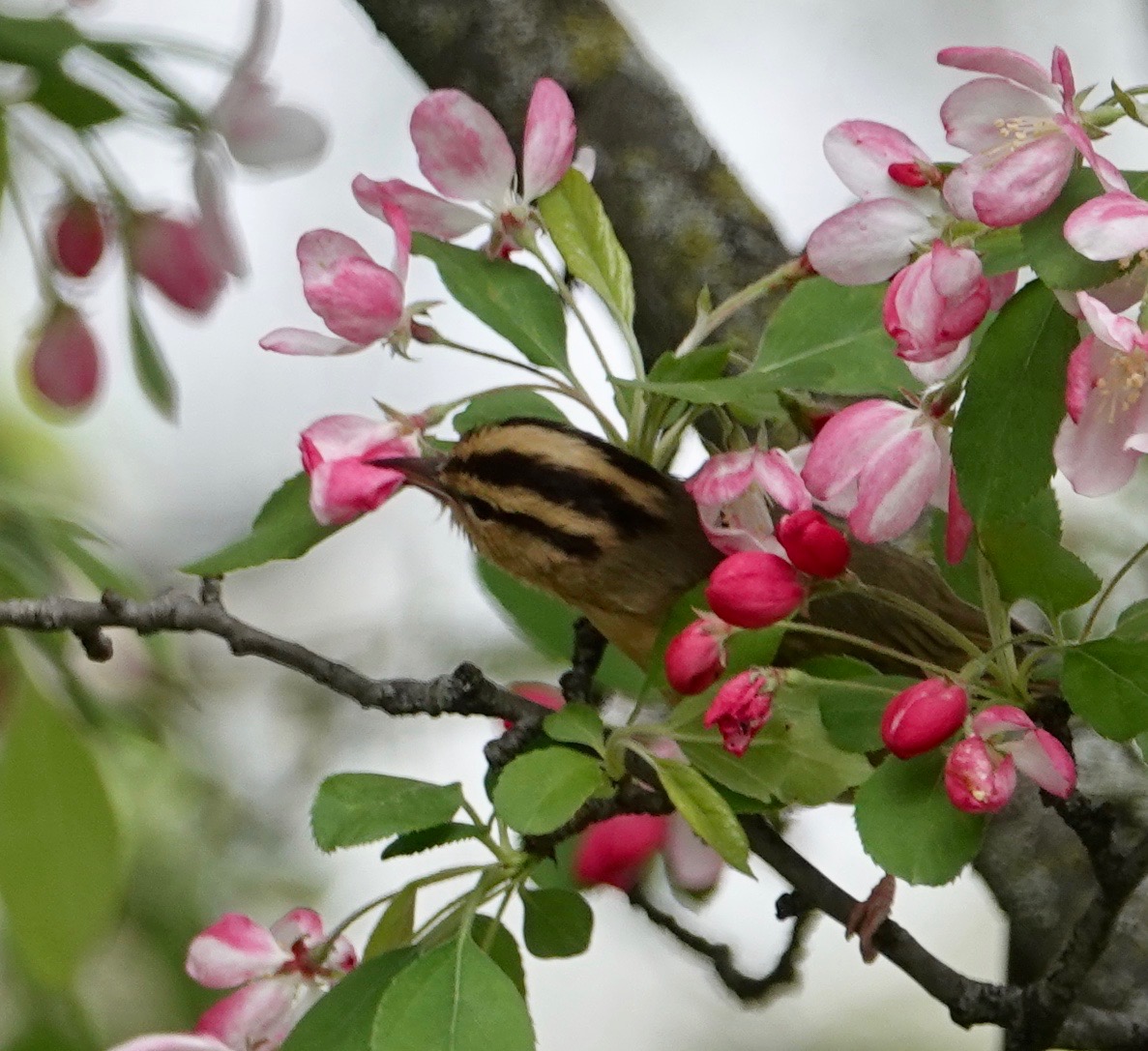I spent many years not knowing that every spring three dozen species of wood warblers come streaming up the east coast to gobble up insects on their way to breeding grounds further north. Here’s one of the rarer ones: a Worm-eating Warbler, ridiculously named. This particular one spent a few days in this and neighboring crabapples.