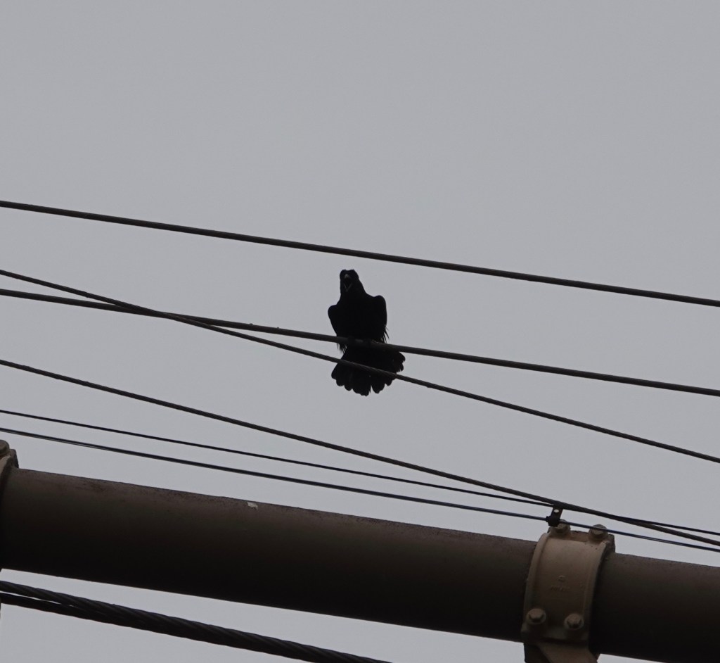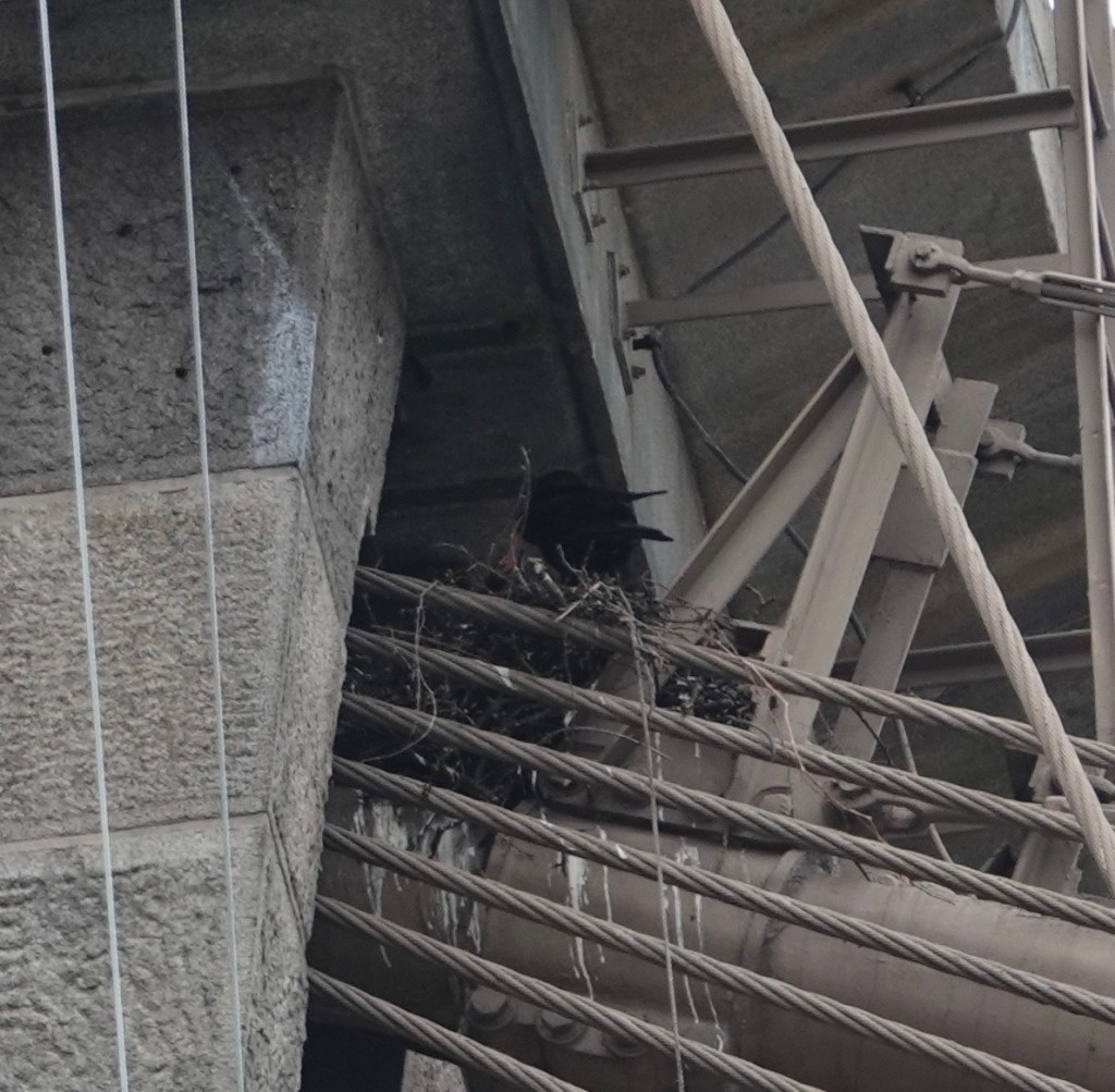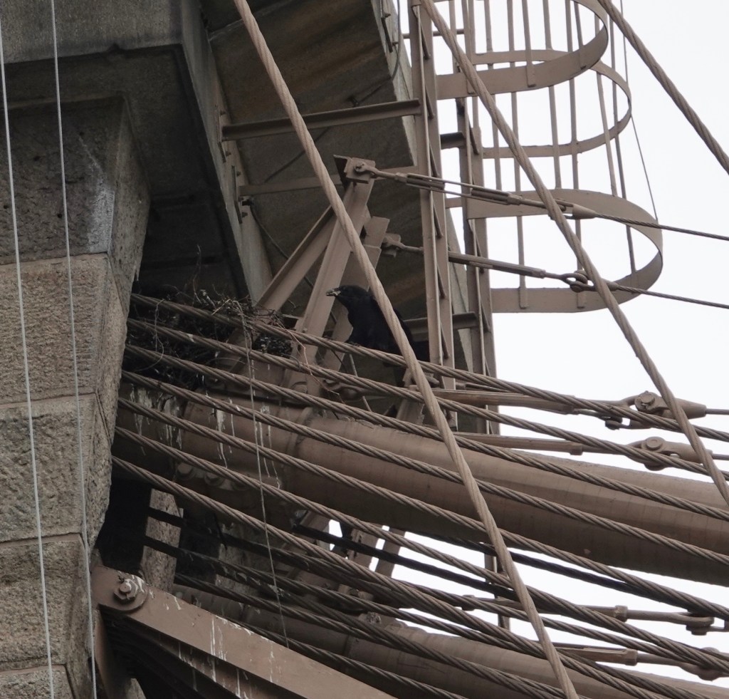 It’s so nosy on around the bridge, what with construction, traffic, more construction at Fulton Ferry, the harbor, etc., that I could barely hear the Raven calling from up on the wires. This one, on a near by building, was more audible.