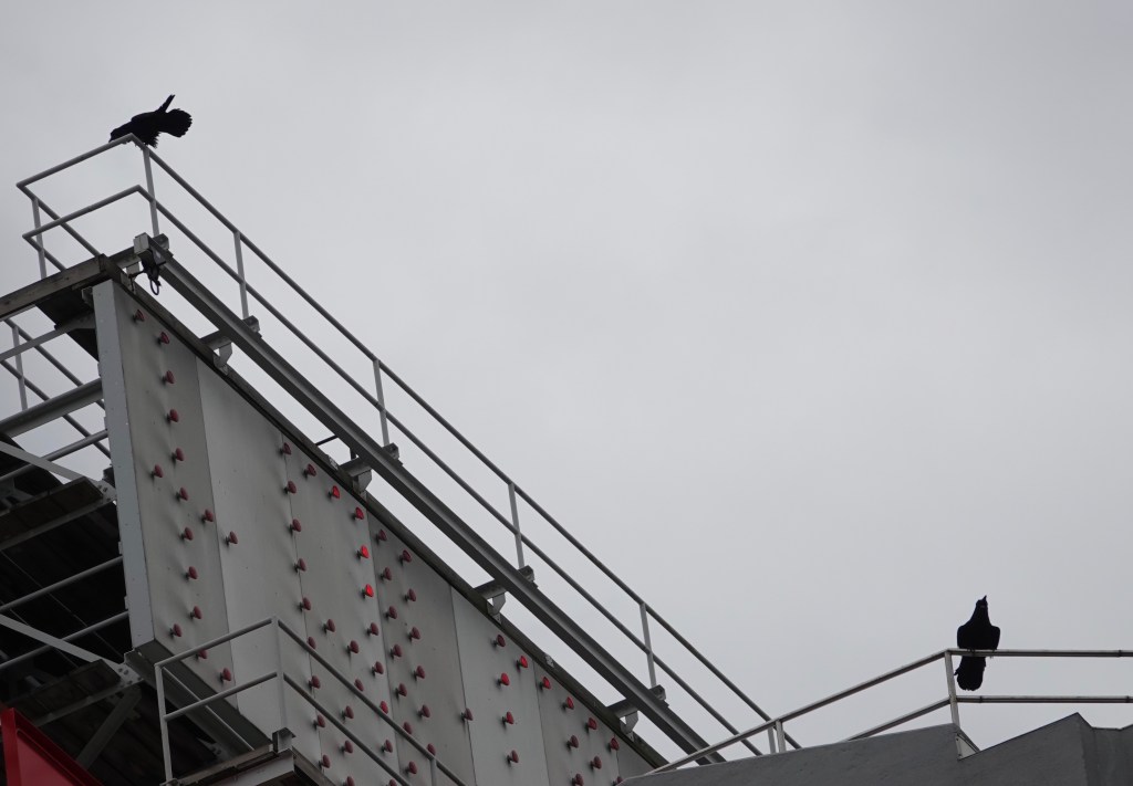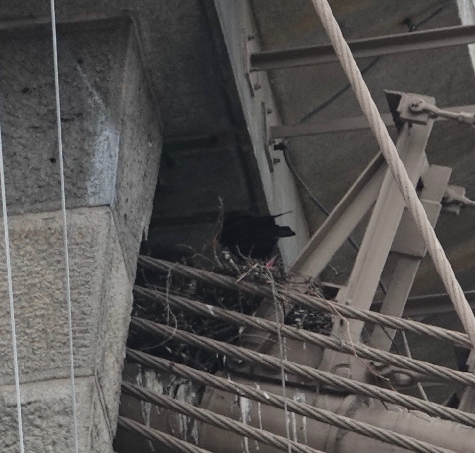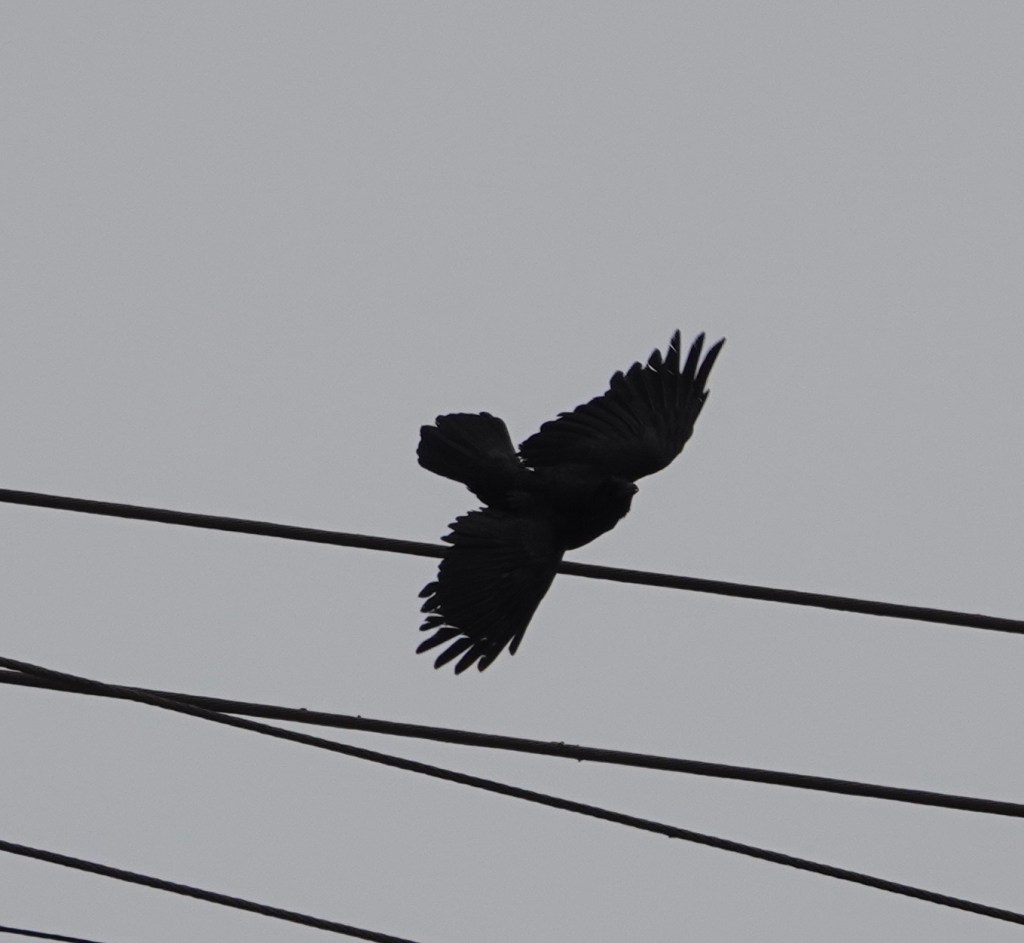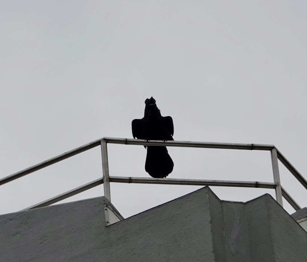 It’s so nosy on around the bridge, what with construction, traffic, more construction at Fulton Ferry, the harbor, etc., that I could barely hear the Raven calling from up on the wires. This one, on a near by building, was more audible.