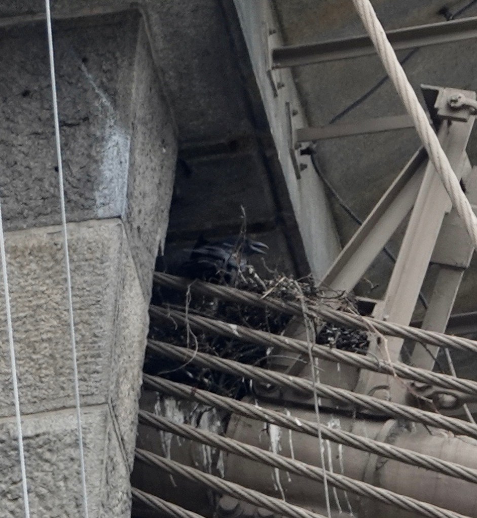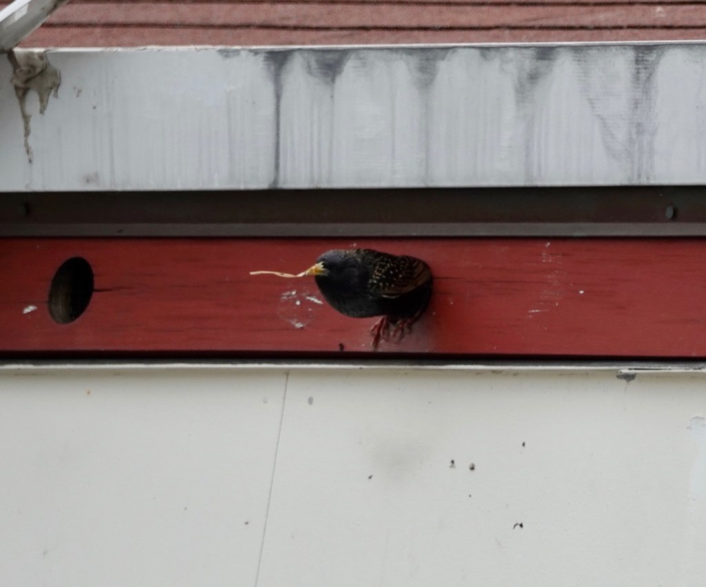 There were nests all around. Pigeons are probably also nesting on the bridge. Starlings are using these little holes in a small building. And that’s a Common Grackle in the awning of the Music Barge. Only thing I didn’t see any evidence of were Barn Swallows, who have nested under Pier 1 for years.
