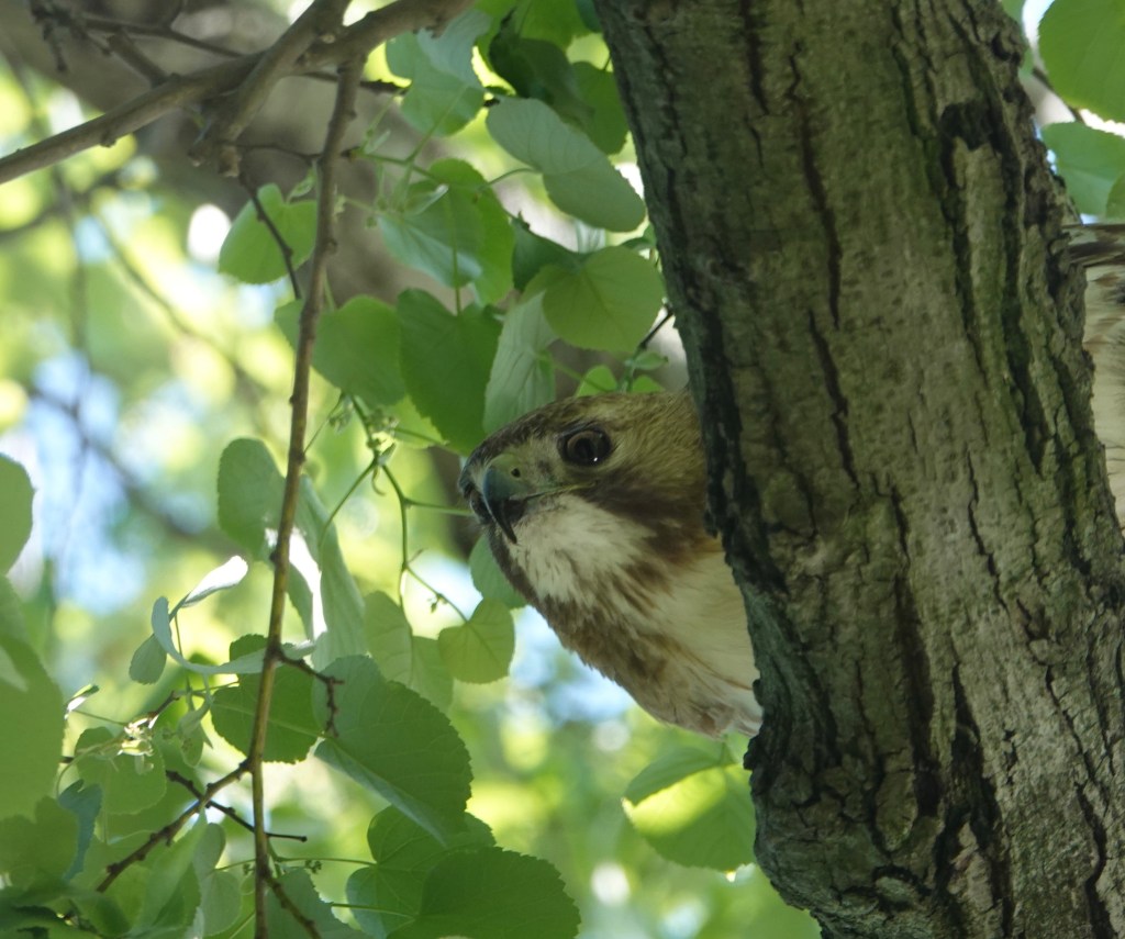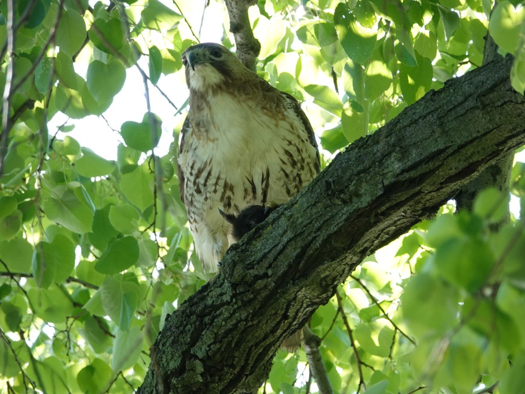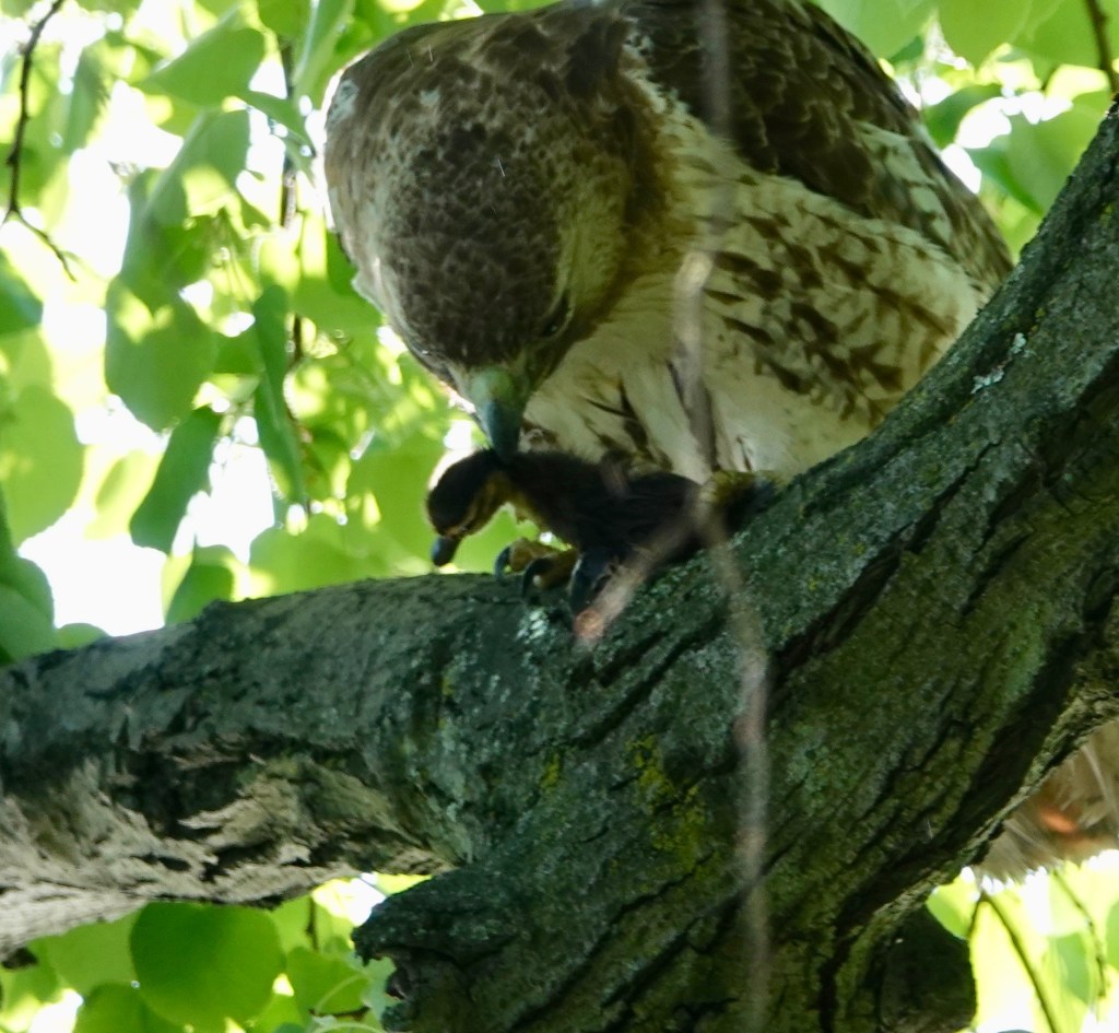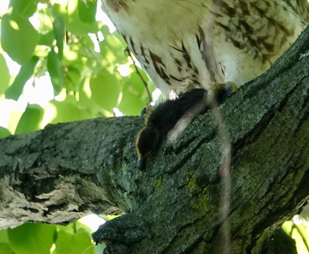 This was the other Red-tailed that showed up soon afterwards. No duckling on the menu for this one, at least while I was around. On Tuesday, I’d counted fourteen ducklings on Sylvan with a female Mallard. There were none after this incident on Thursday. On Wednesday, Green-Wood staff and an animal rescuer got a bunch of ducklings out of a storm drain and released them in Dell Water.