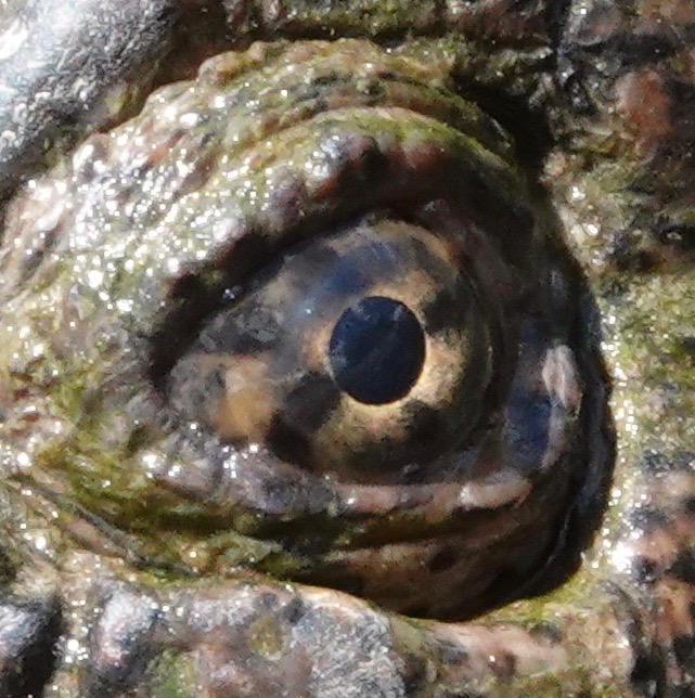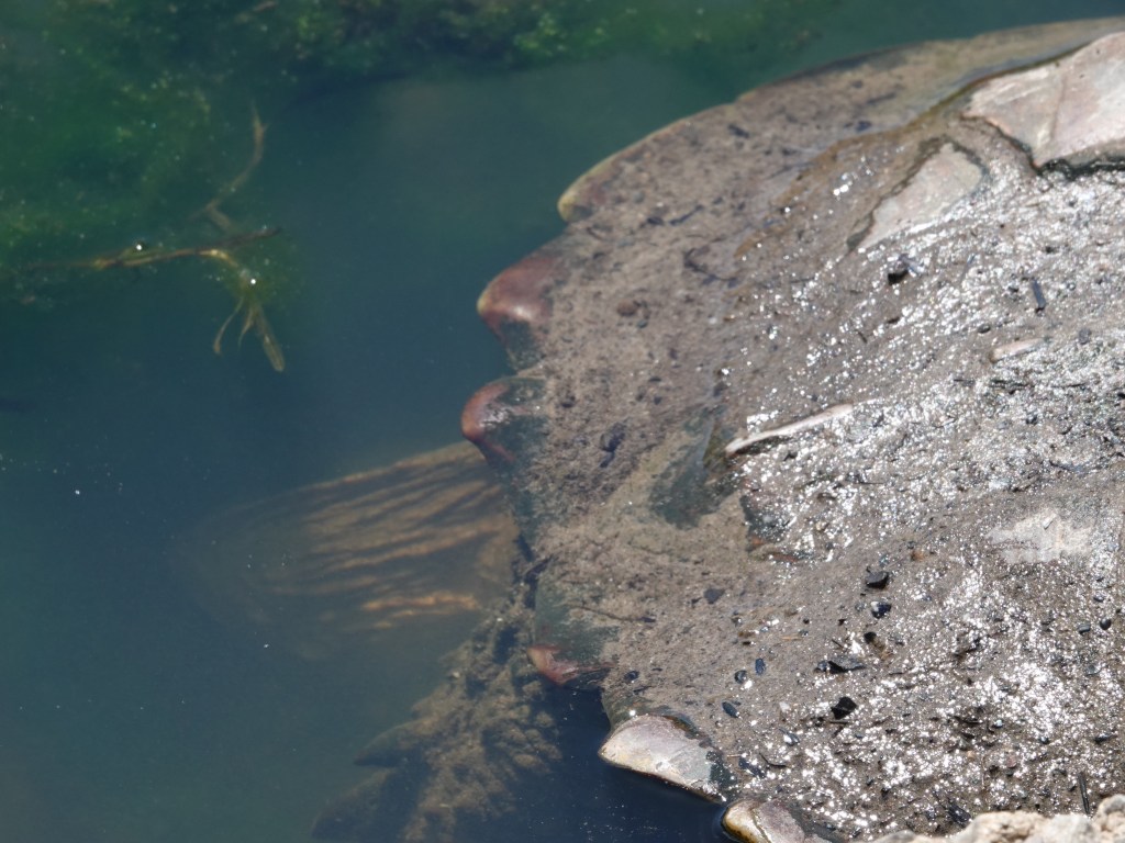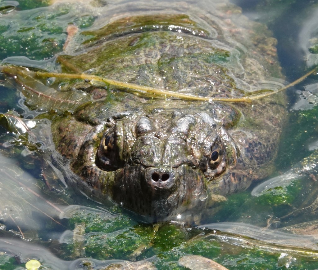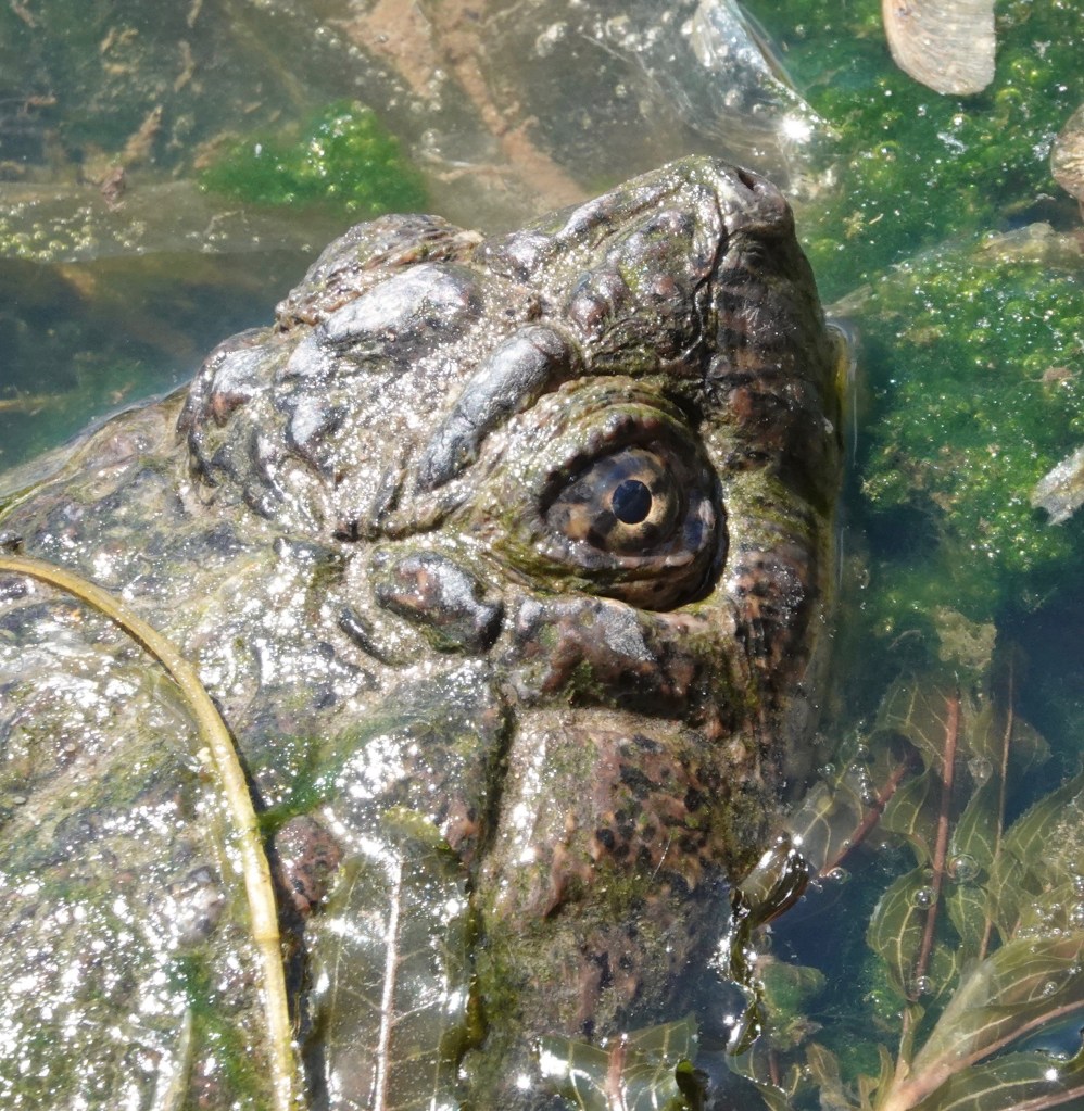 There are at least four Common Snappers in Green-Wood’s largest water body. This one is third-largest, the shell being about 18″ long. The creature’s neck is perhaps twice as thick as my wrist.