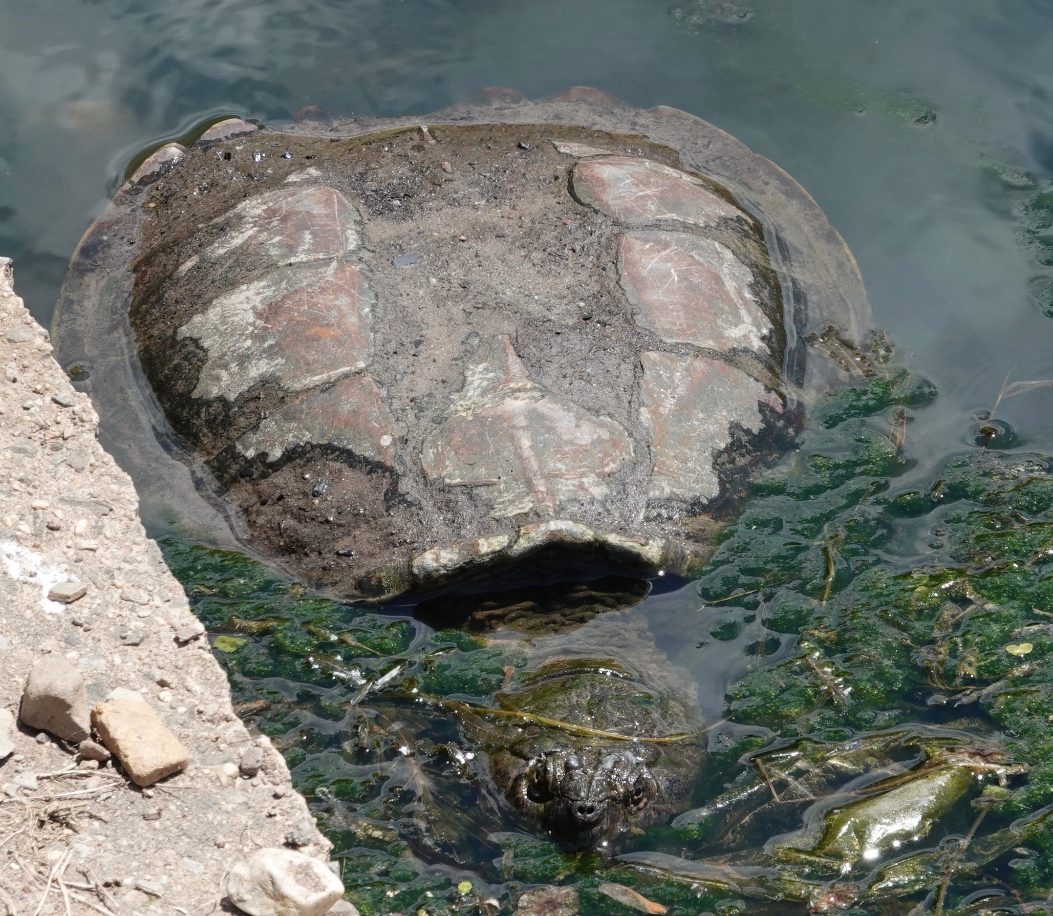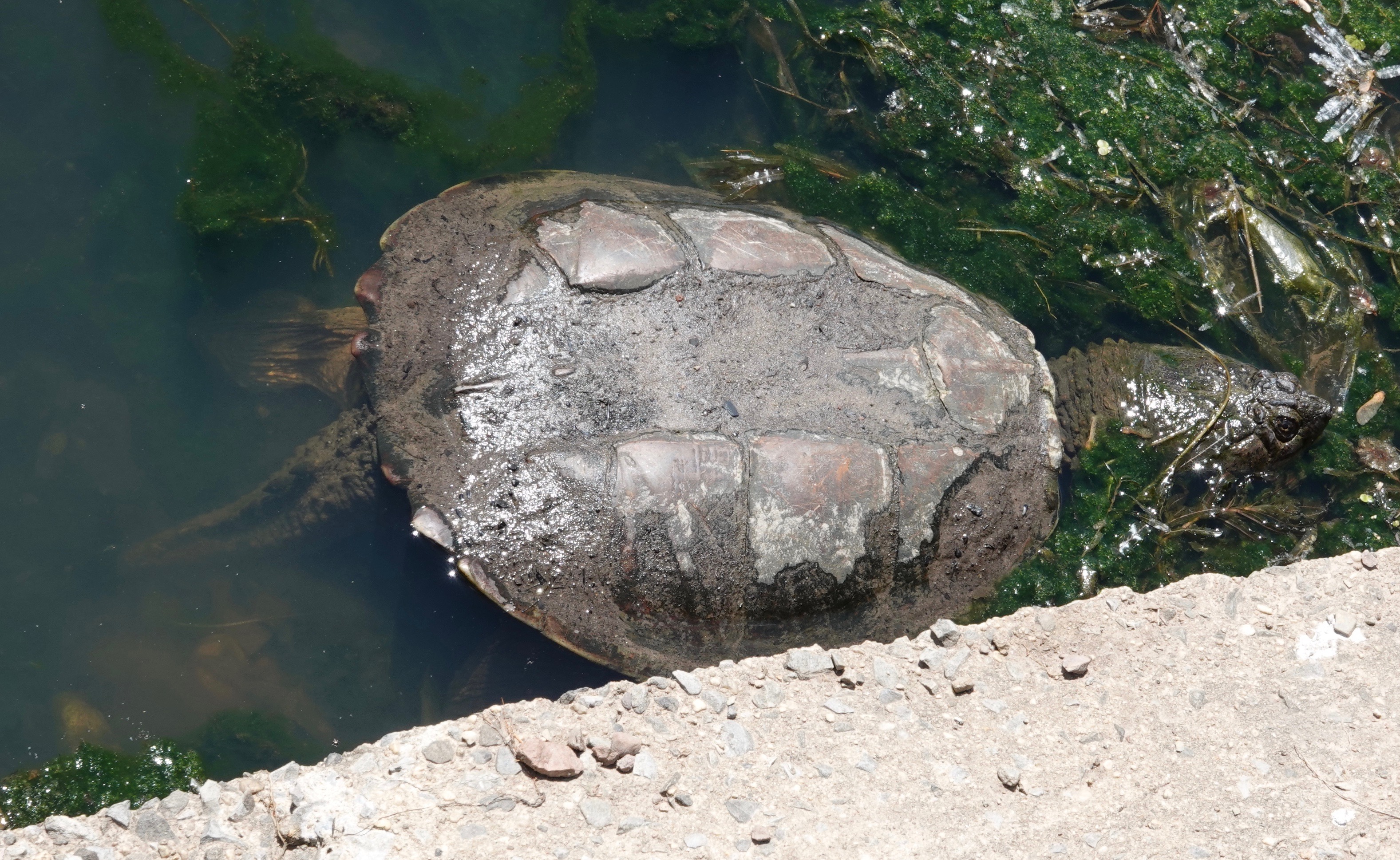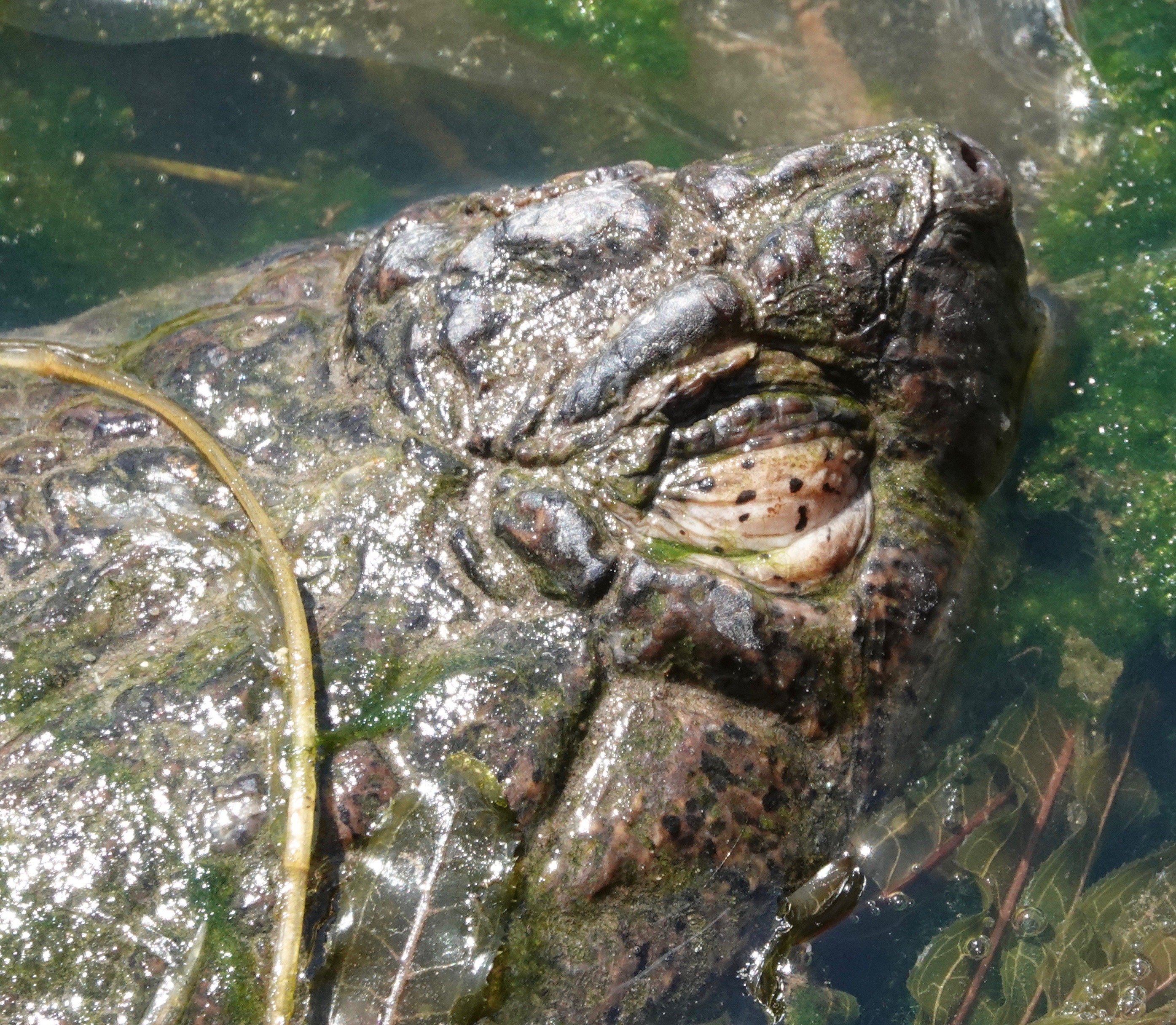 There are at least four Common Snappers in Green-Wood’s largest water body. This one is third-largest, the shell being about 18″ long. The creature’s neck is perhaps twice as thick as my wrist.