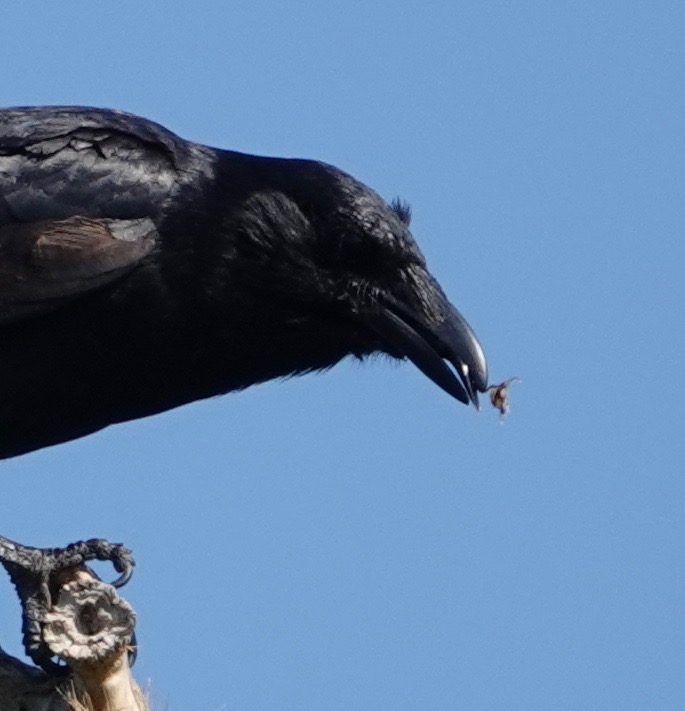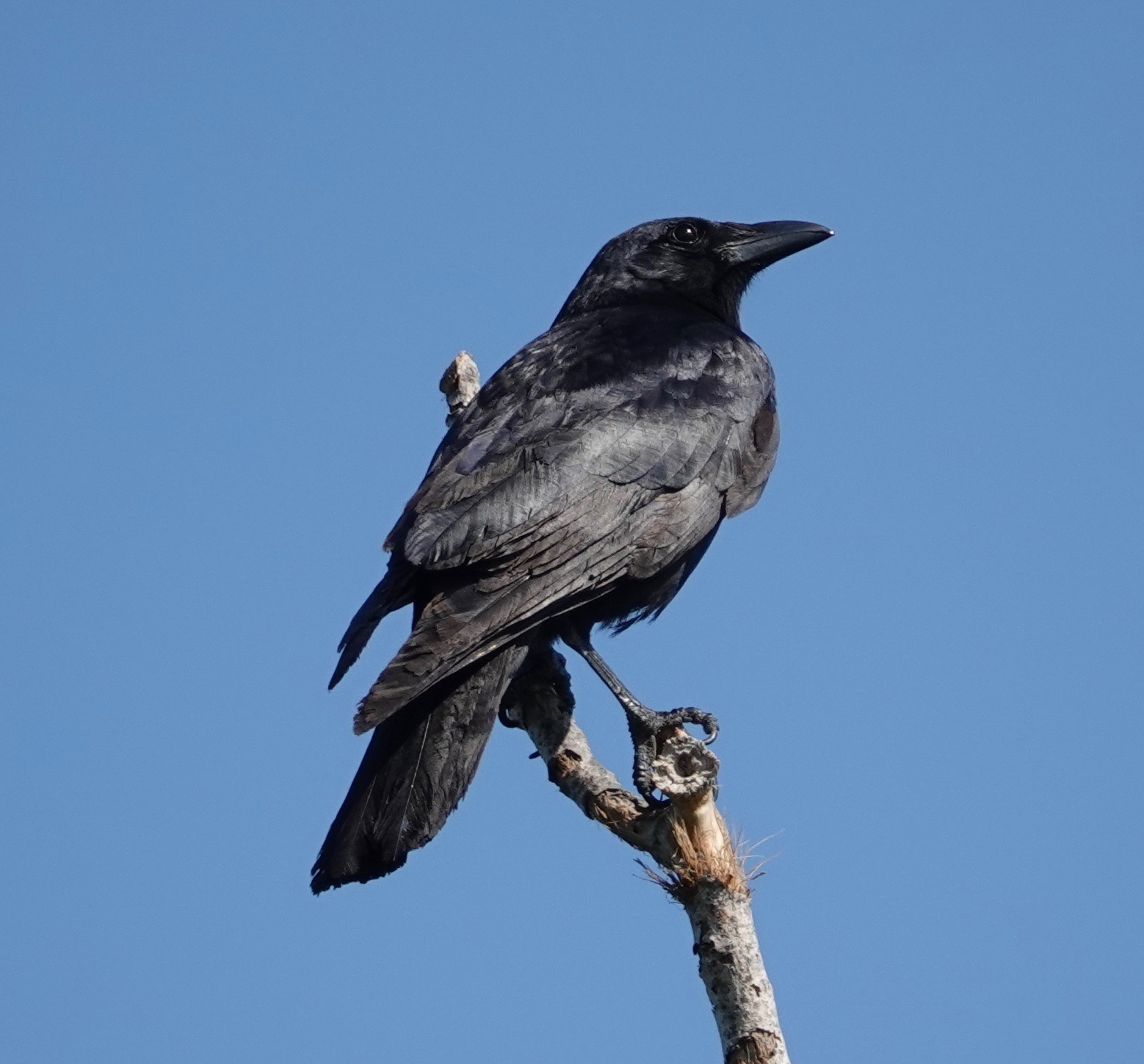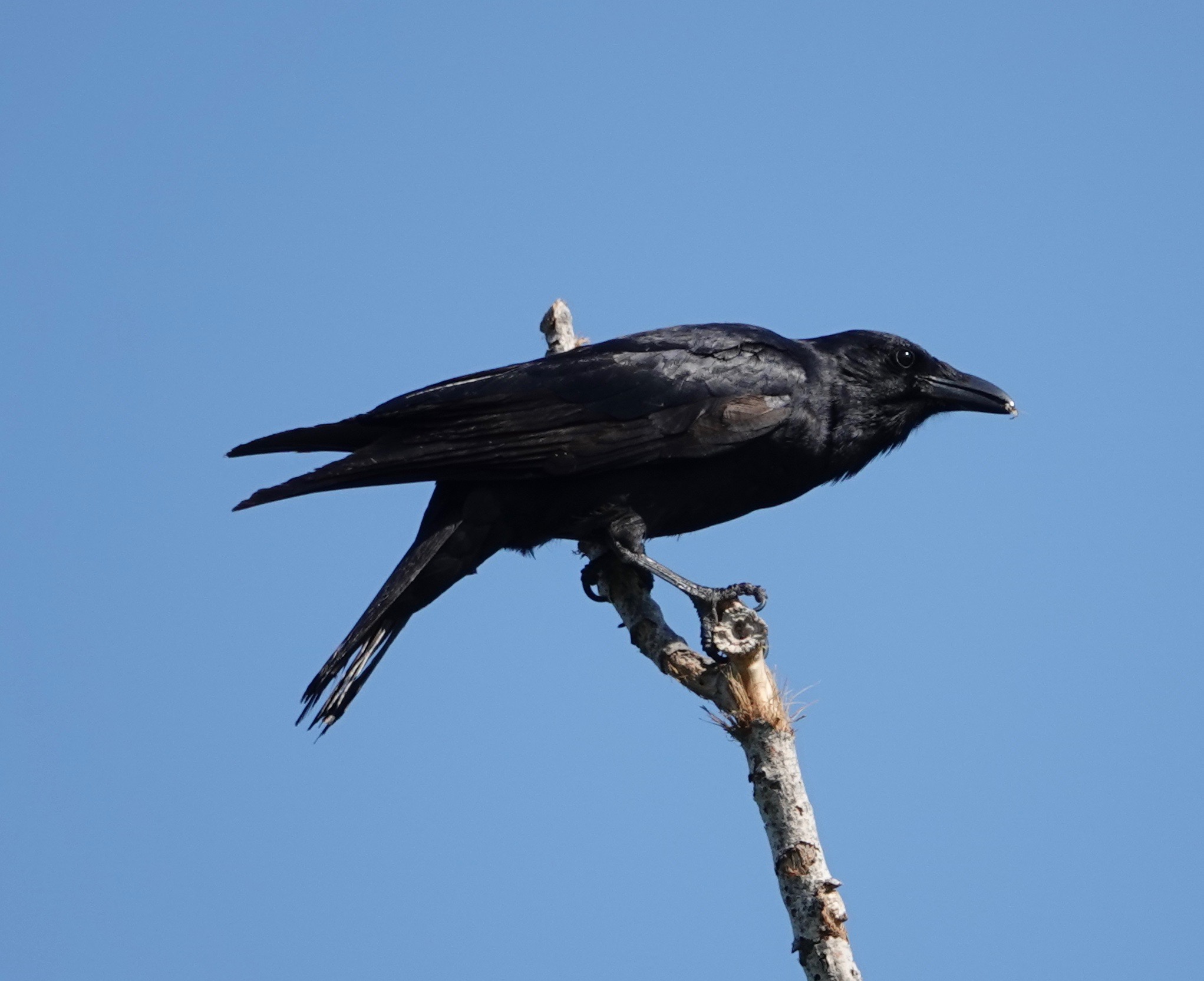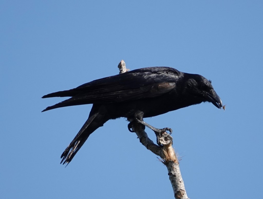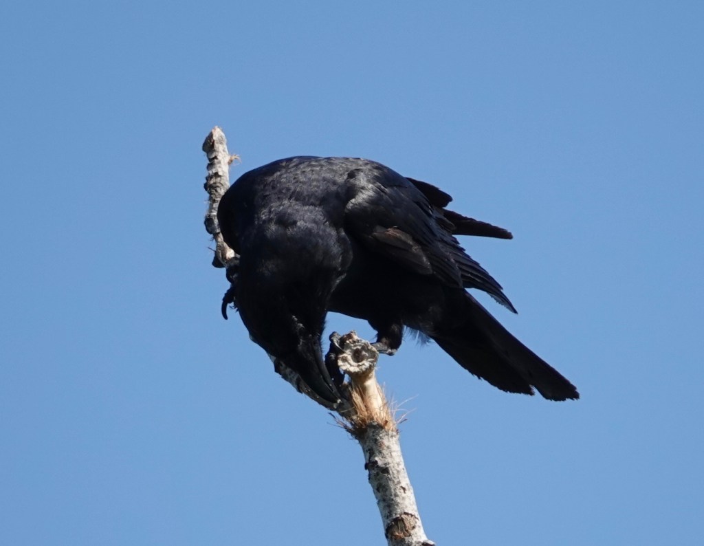 This Fish Crow, identified by voice, repeatedly picked something off or out of this dead branch of an Eastern Cottonwood.