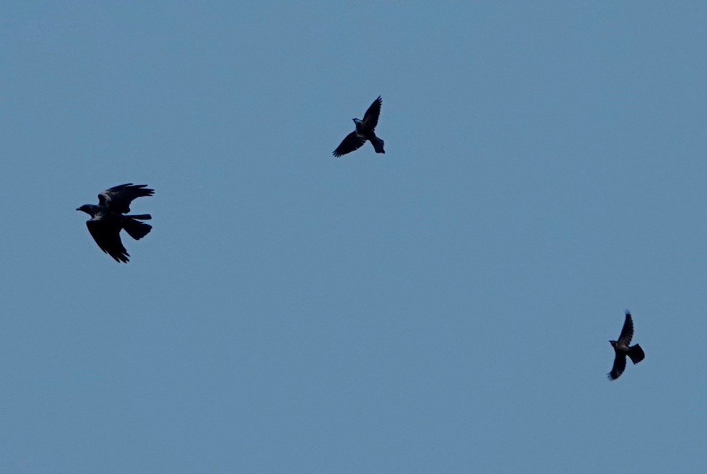 Shall we make this a Corvid 2021 weekend? Here’s a Fish Crow being chased by Common Grackles, who are probably defending their nest space.