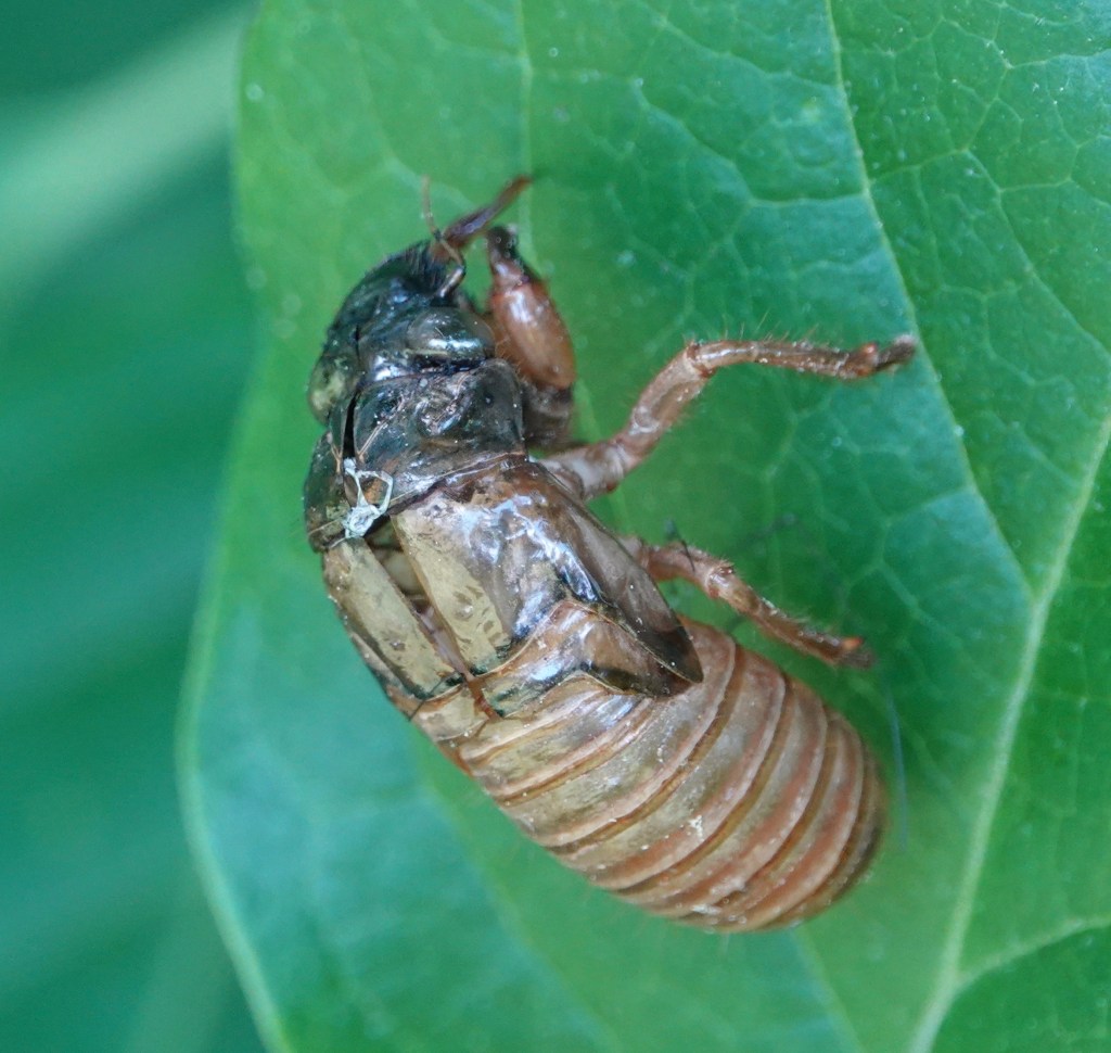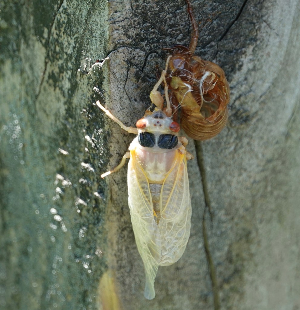 The newly emergent adult cicada has to harden off and darken over a few hours before getting down to business. Most of them do this at night, but there are sooo many that you can find them in this soft, vulnerable stage during the day, too.