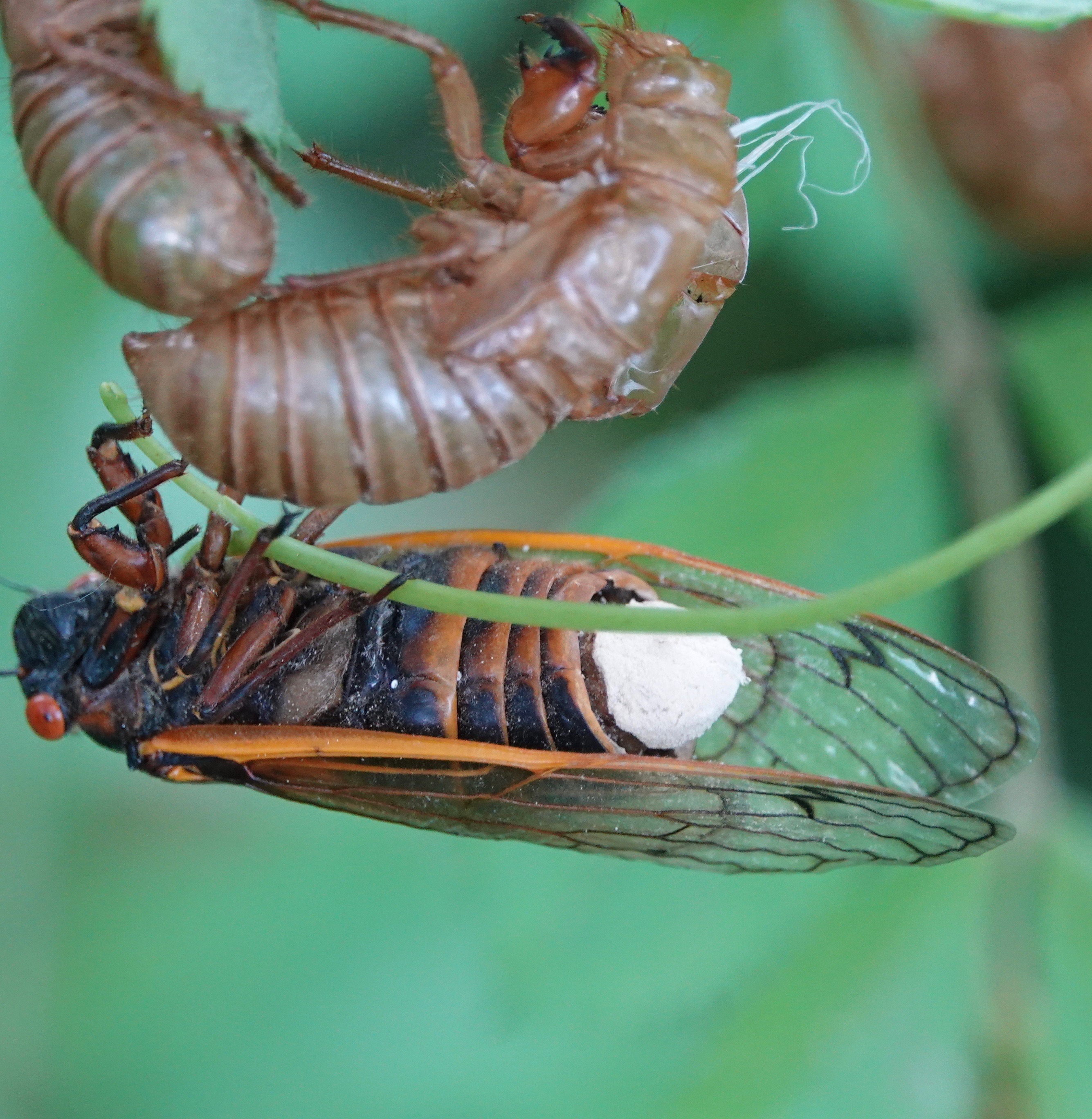 Massospora cicadina, a deadly fungus, claims many of the cicadas, rotting the abdomen out. This is one of those “zombie” pathogens that take control of the animal, as detailed here.