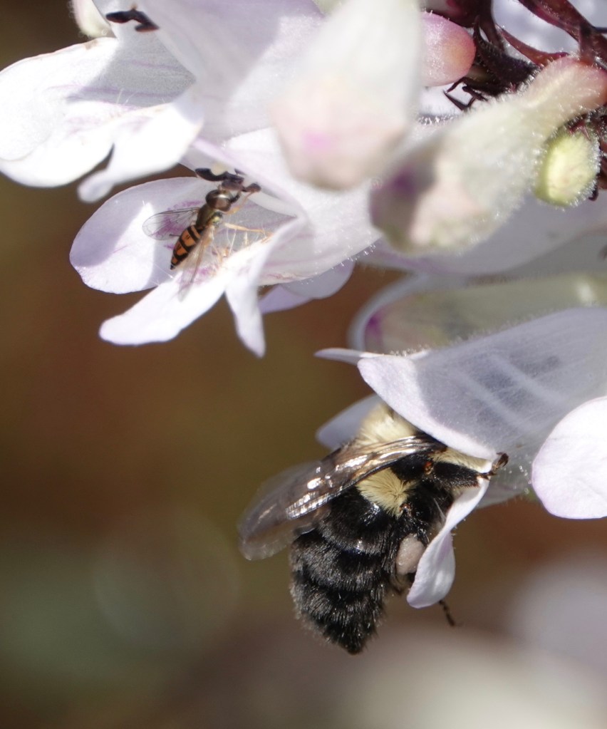 Is the small winged insect found on the petal between the wasp’s antennae also a wasp? It’s incredibly small, but looks like it might be. The disparity in sizes is stunning.