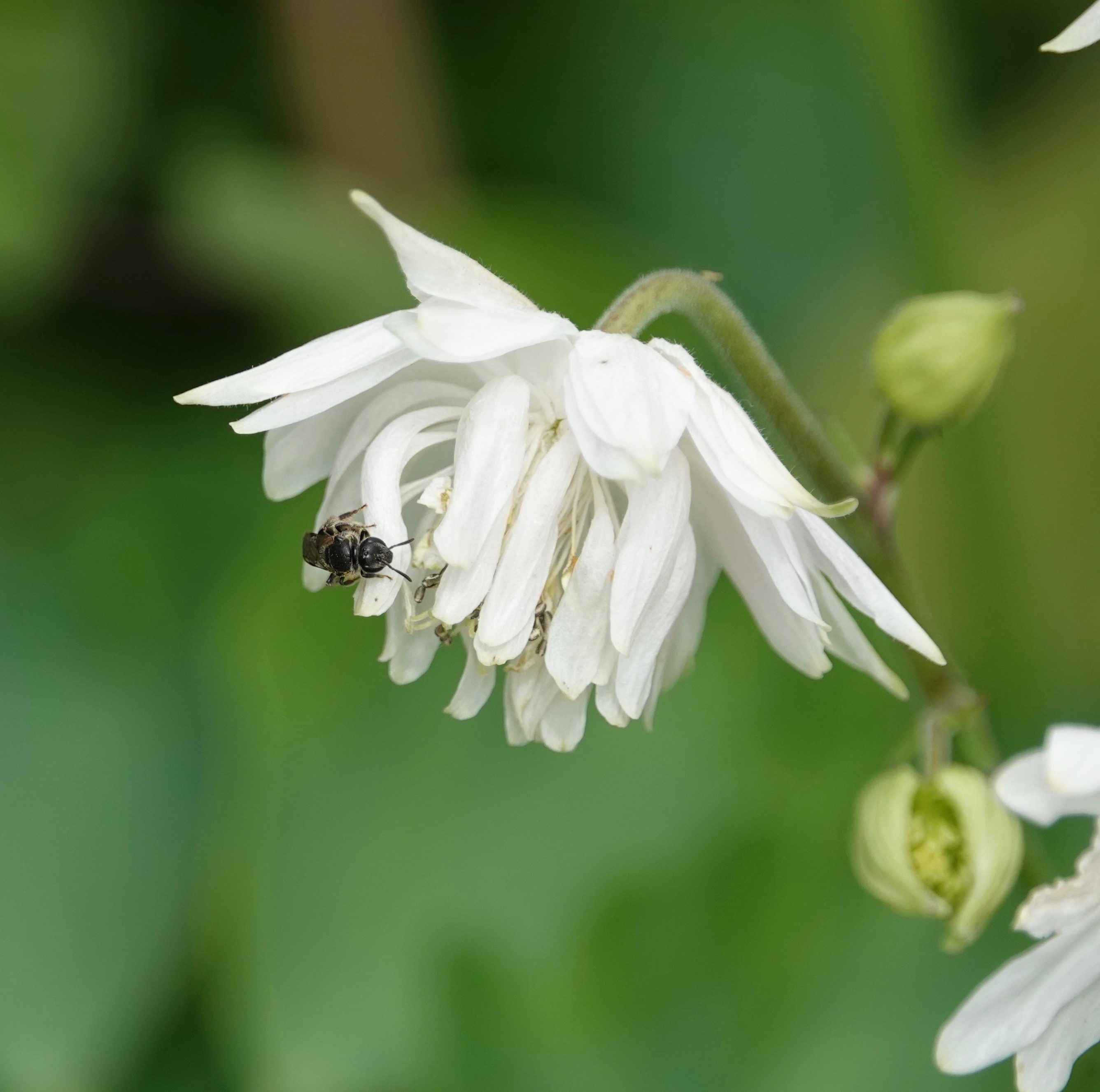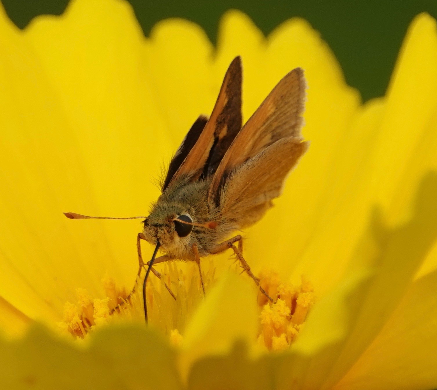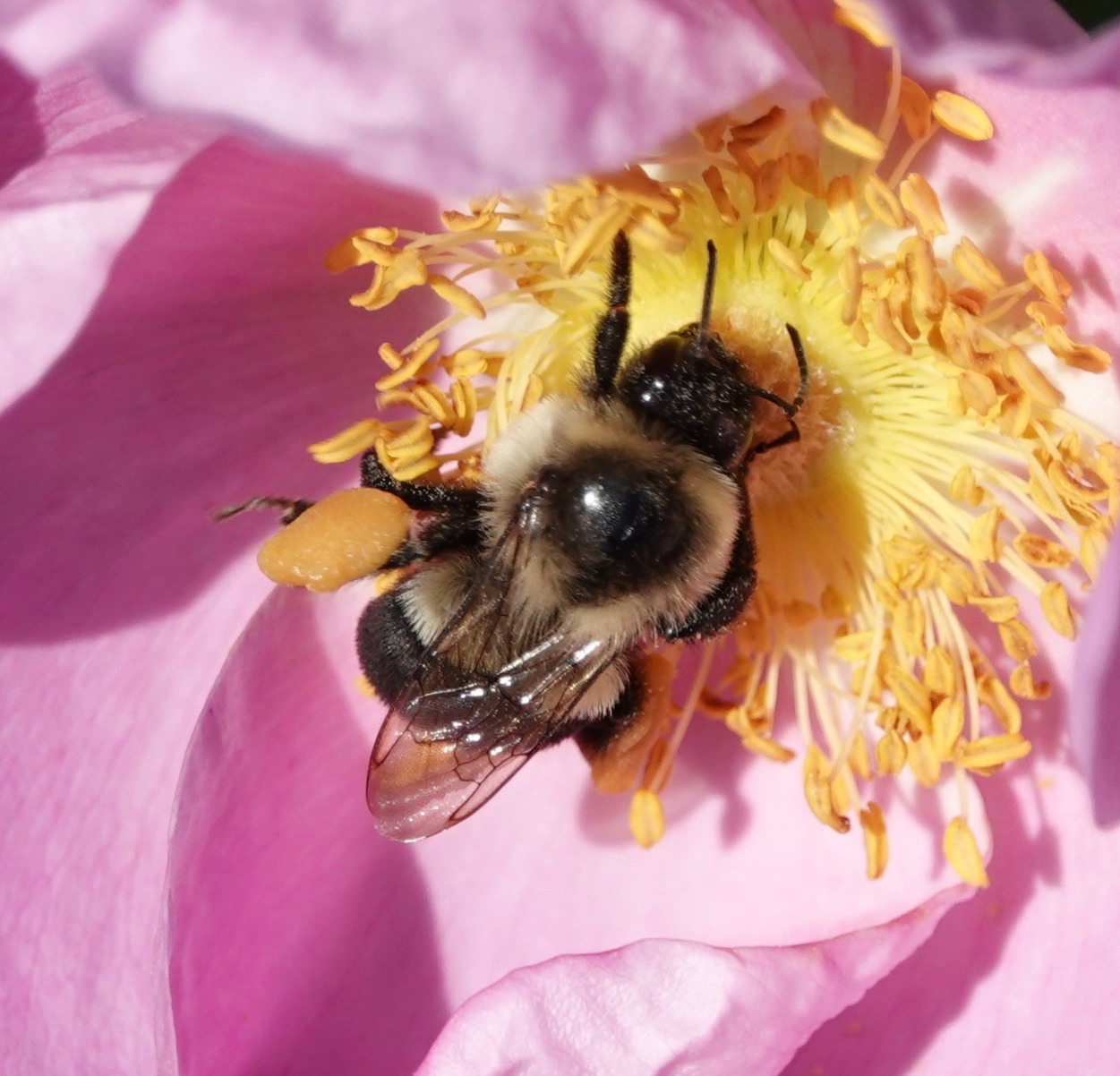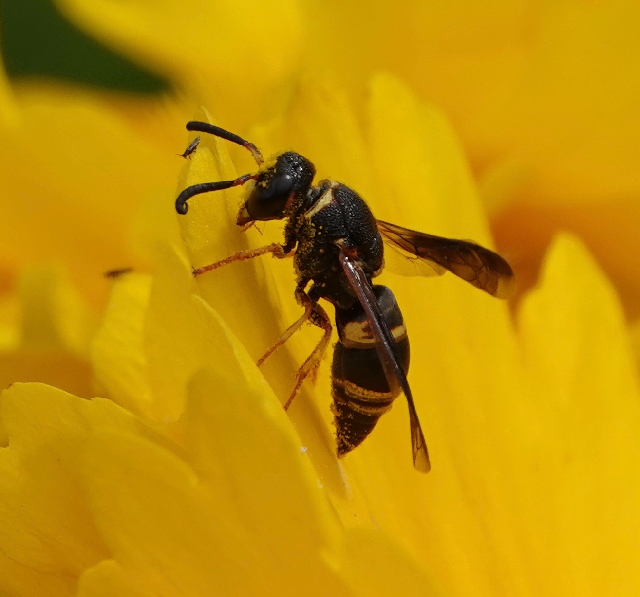 Is the small winged insect found on the petal between the wasp’s antennae also a wasp? It’s incredibly small, but looks like it might be. The disparity in sizes is stunning.