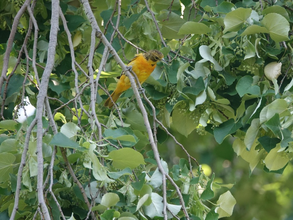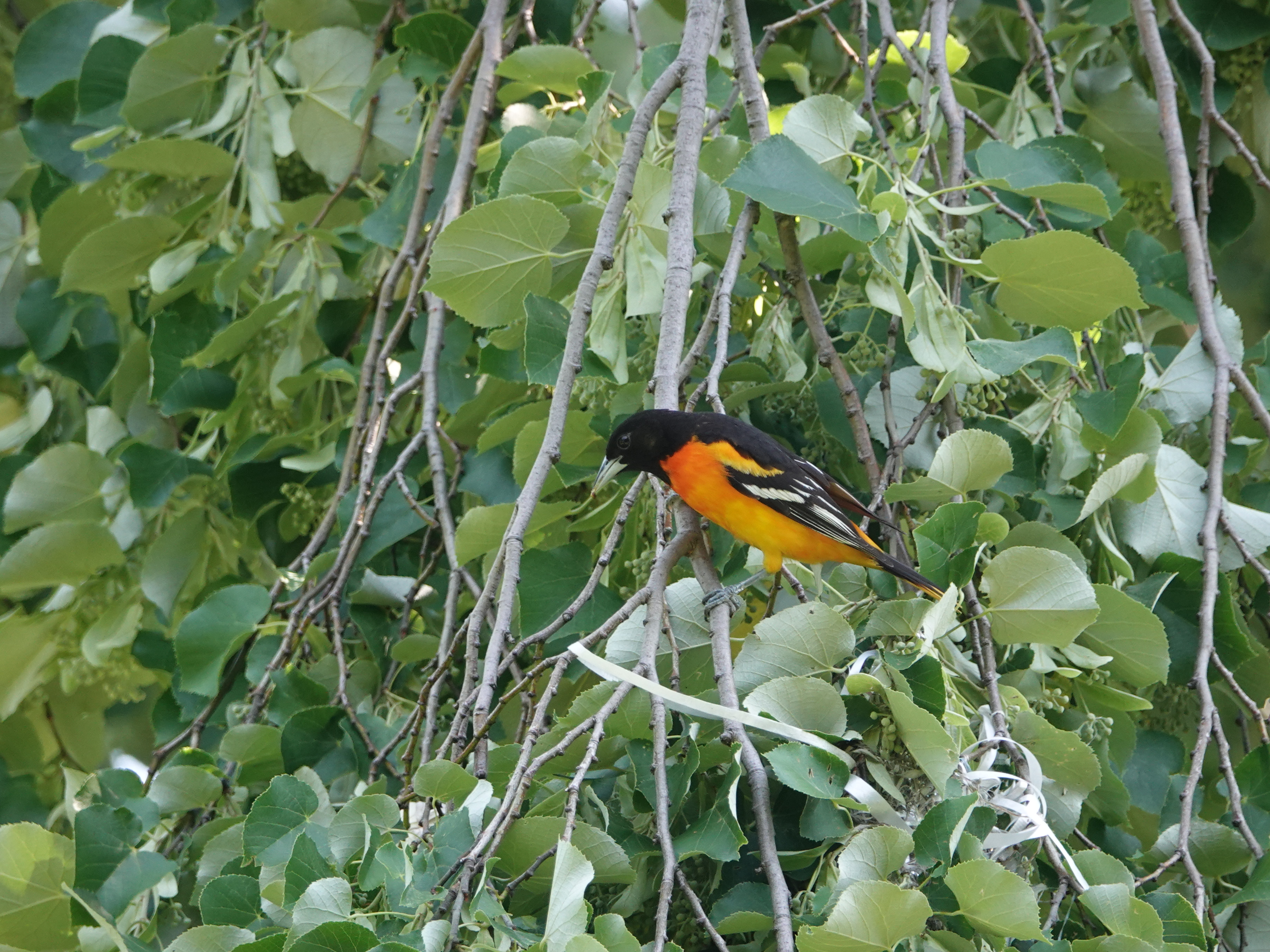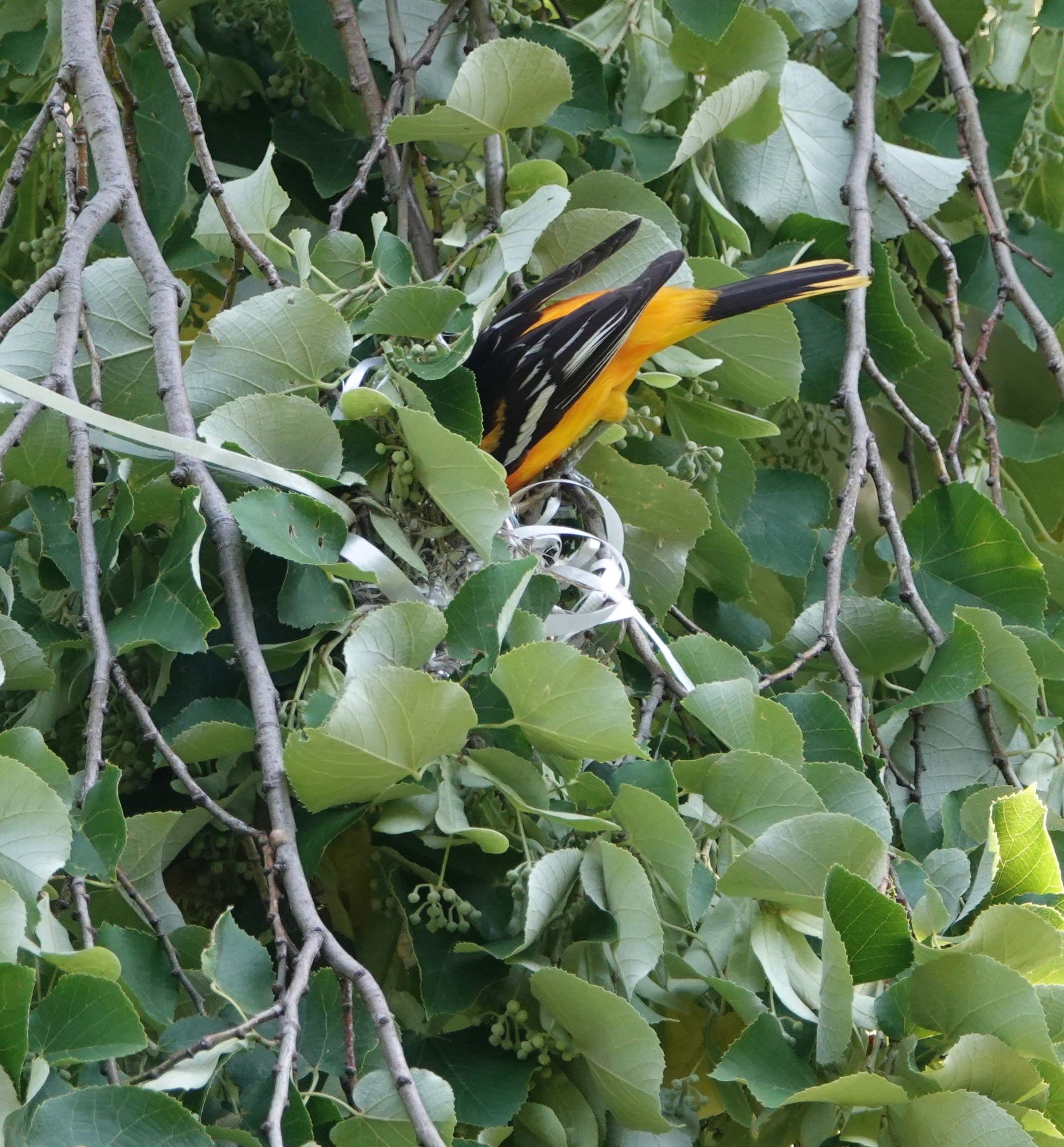 Baltimore Orioles have nested in this linden tree for at least two previous breeding seasons. Do they ever recycle their old nests? Or the materials contained in them? There’s a lot of human-made material incorporated in their woven bag nests, including ribbon (many bunches of flowers in a cemetery…) and string. This stuff doesn’t break down as easily as the more traditional nesting material of grasses and plant fibers.