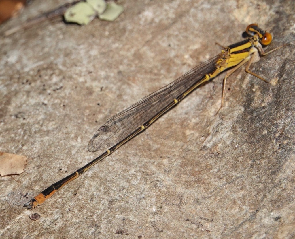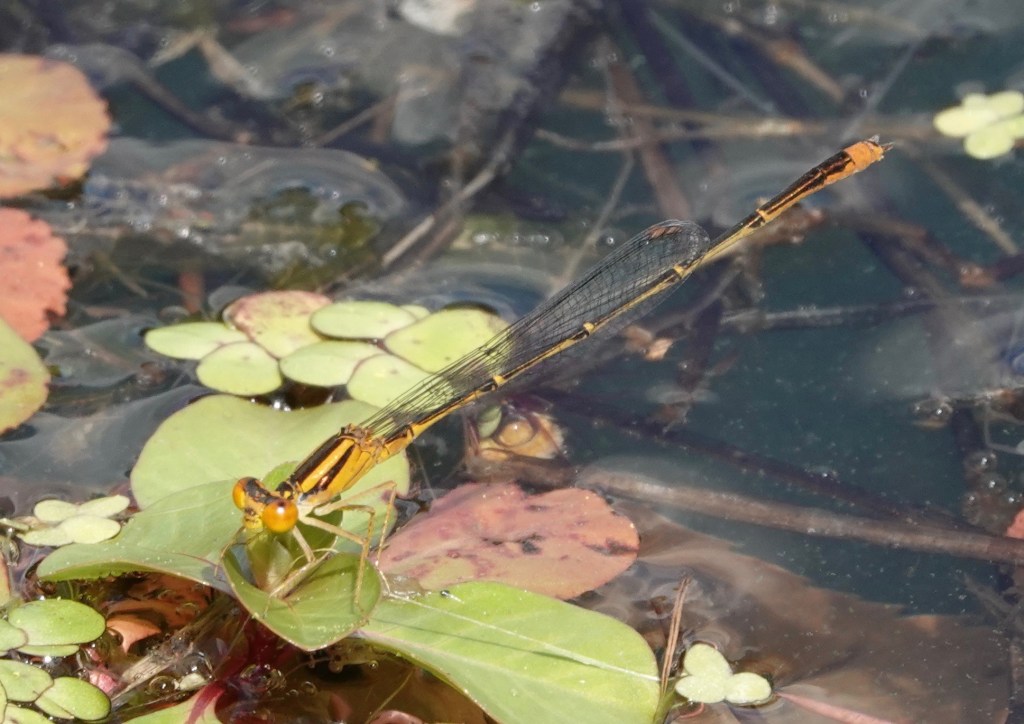 Hard to get damselflies in focus at this scale and angle. I usually get the face and thorax crisply focused. But here, the distinctive 9th segment, all orange, comes through the sharpest. There are ten abdominal segments on a damselfly, and patterning on them can be key to identification.