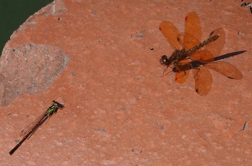 Fragile Forktail (Ischnura posita) and Eastern Amberwing (Perithemis tenera)
