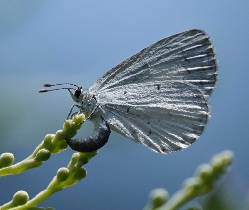Summer Azure (Celastrina neglecta) presumably. Ovipositing on sourwood (Oxydendrum arboreum).