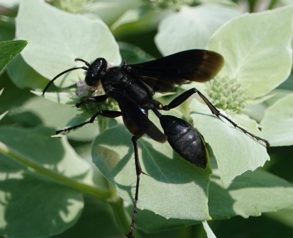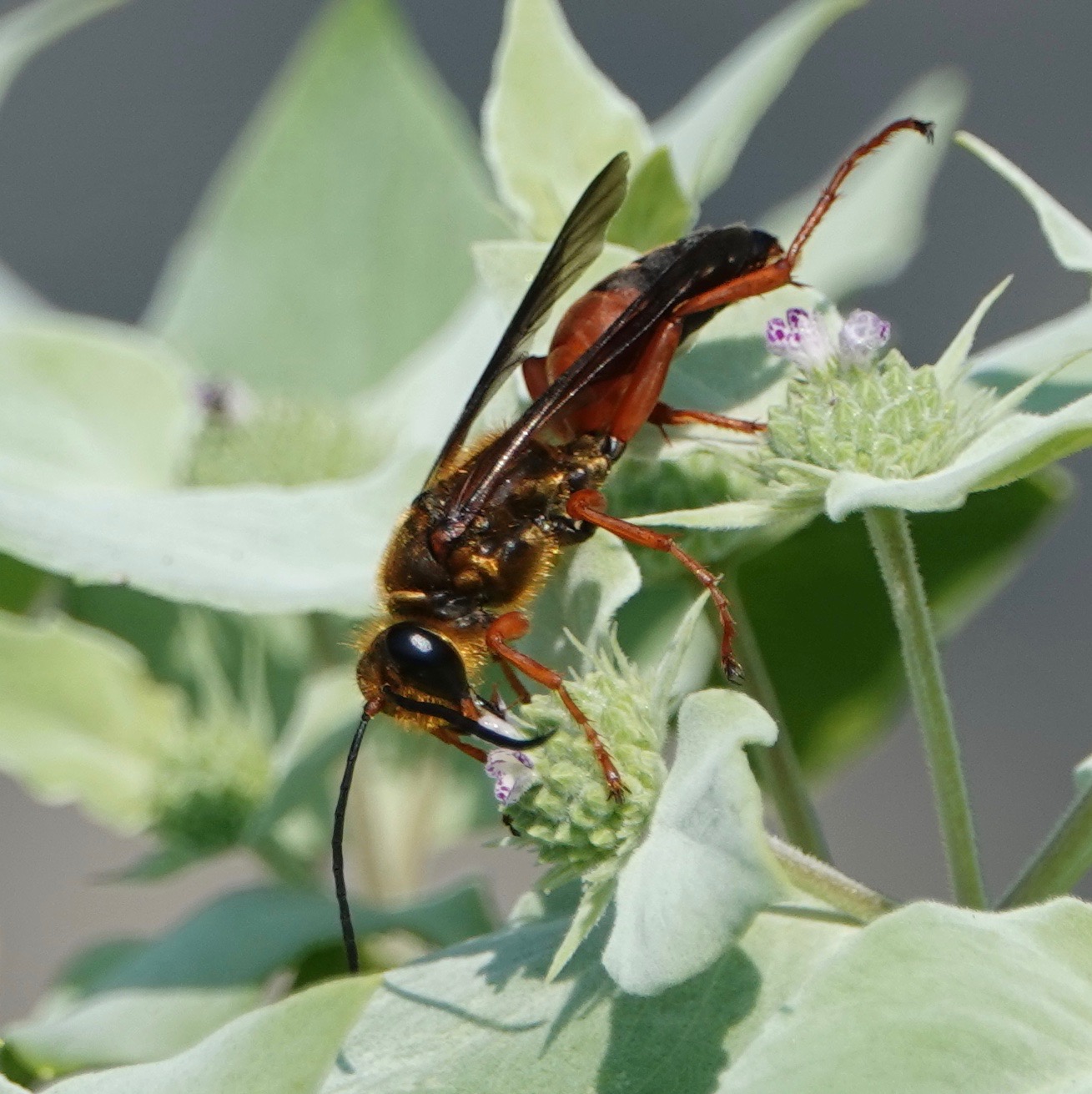 The mountain mint is starting to bloom. This is a pollinator attractor like few others. On this day, there were a few blooms and a trio of wasps:Sphexichneumoneus, or the Great Golden Digger. I usually see the golden hairs on these obscured with pollen.Sphex pensylvanicus, the Great Black Digger. The female is one of our largest wasps, in terms of length. A lot less hair than the Golden, so probably less efficient in picking up pollen. Both of these Sphex wasps hunt katydids for their young.Tachytes genus sand-loving wasp. Very hard to to get to species level through photos. They’re mostly grasshopper-hunters. Notably, as you can see, these three wasps eat nectar and pollen themselves. It’s their larva who are the meat-eaters.