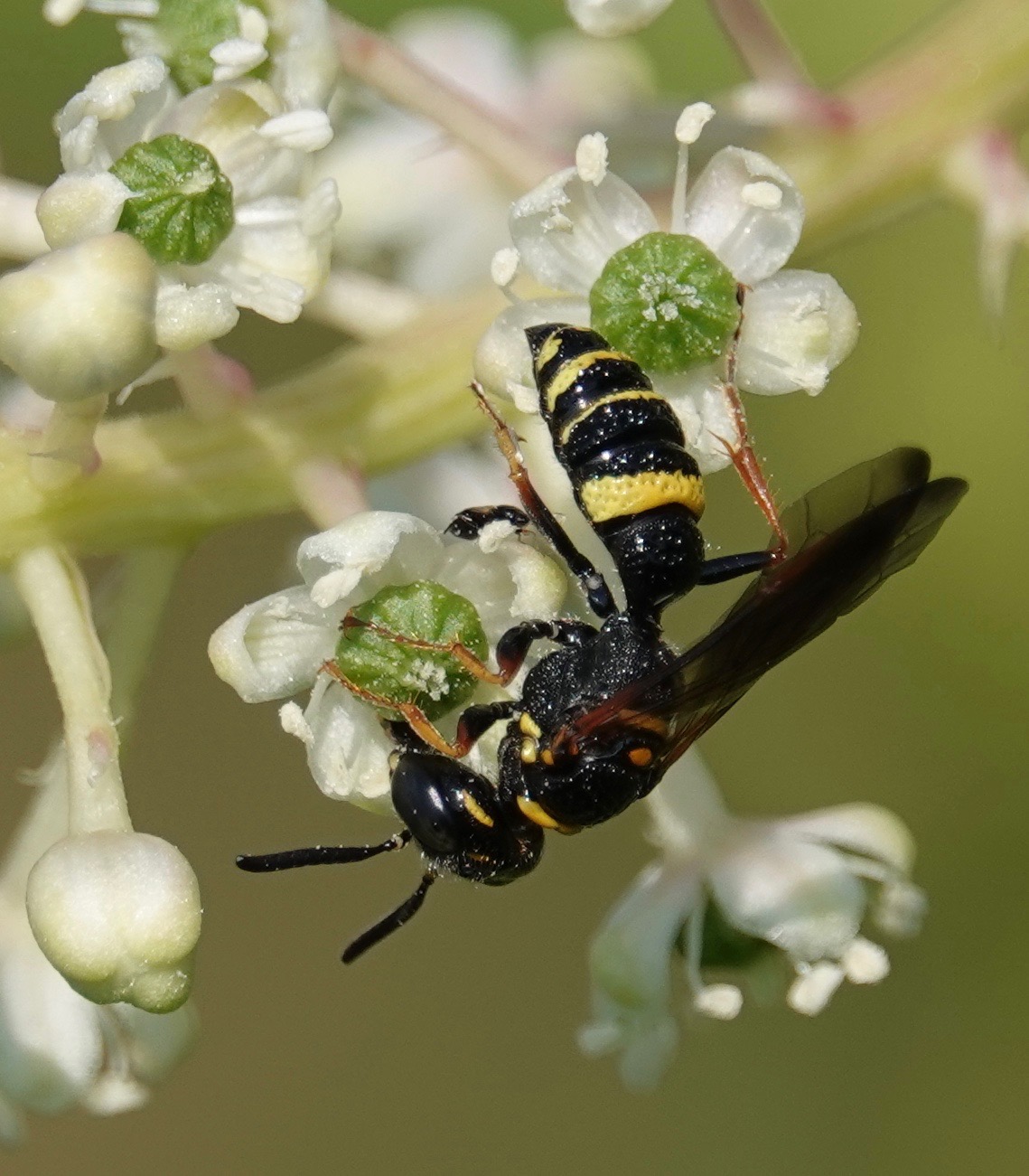 Got to confirm that this is a Hump-backed Beewolf. Philanthus gibbosus hunts ground-nesting bees to provision her own ground nest. This one is slurping away at some American Pokeberry, btw. This is a rather small predatory wasp, but then plenty of ground nesting bees are rather smaller than the ubiquitous honeybee.