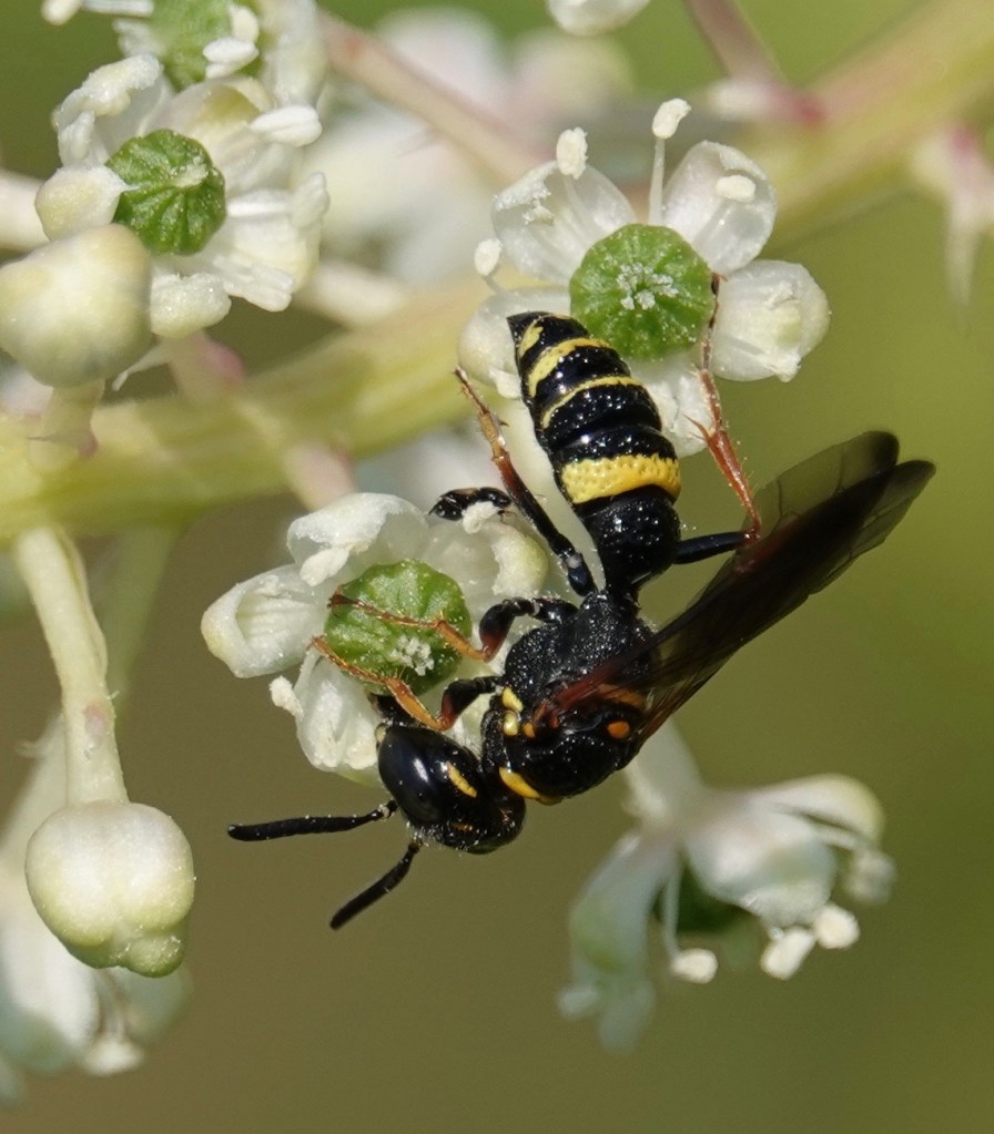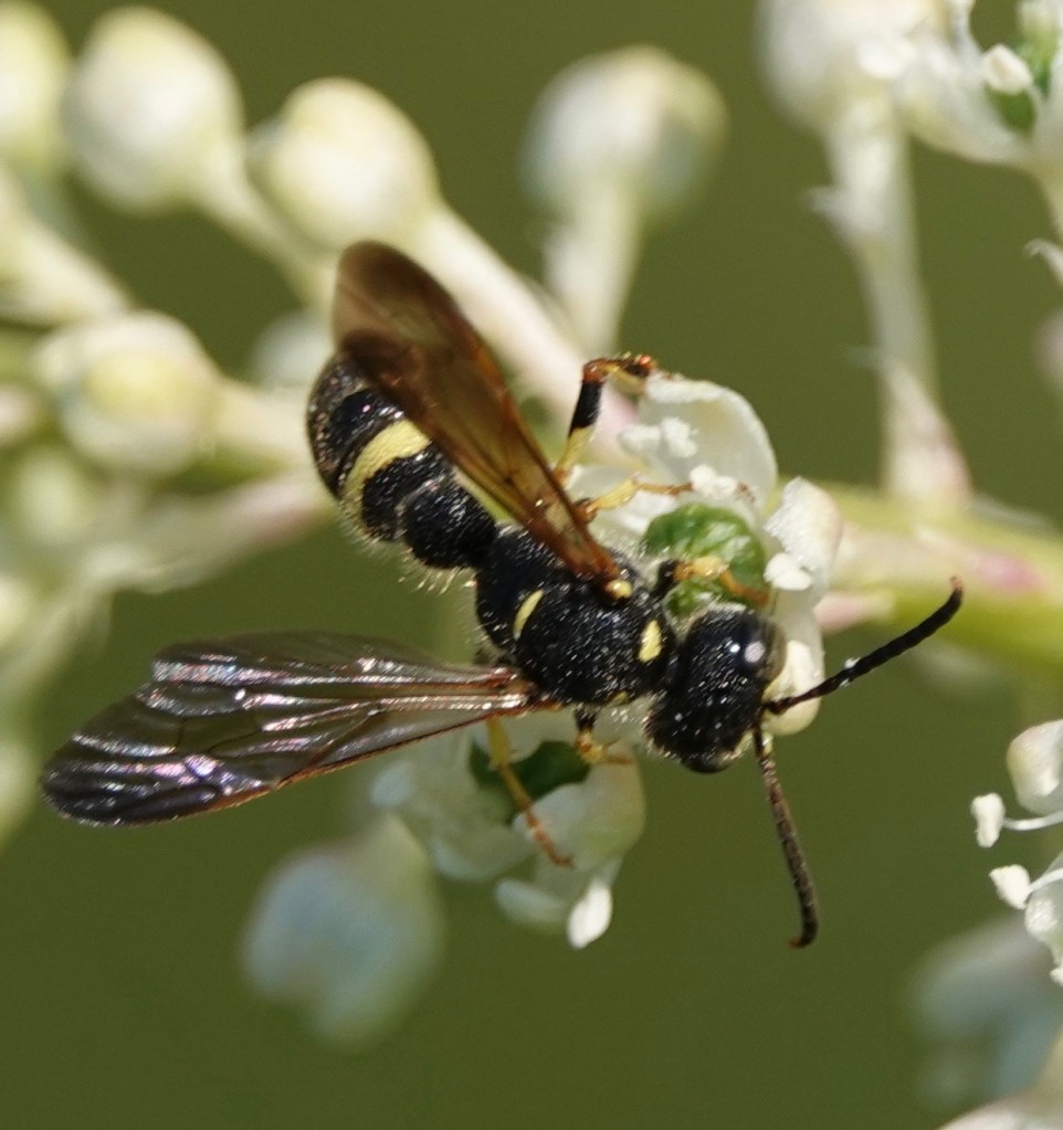 A little different, on the same plant. This is, I think, a Smoky-winged Beetle Bandit Wasp, Cerceris fumipennis. (Some of these common names are exhausting…). Even with a guide, it can sometimes to be hard to be exact on all the species. The Smoky-winged, at any rate, preys on metallic wood-boring beetle species. This includes the Emerald Ash Borer, so researchers tracking its destructive expansion use these wasps as scouts.