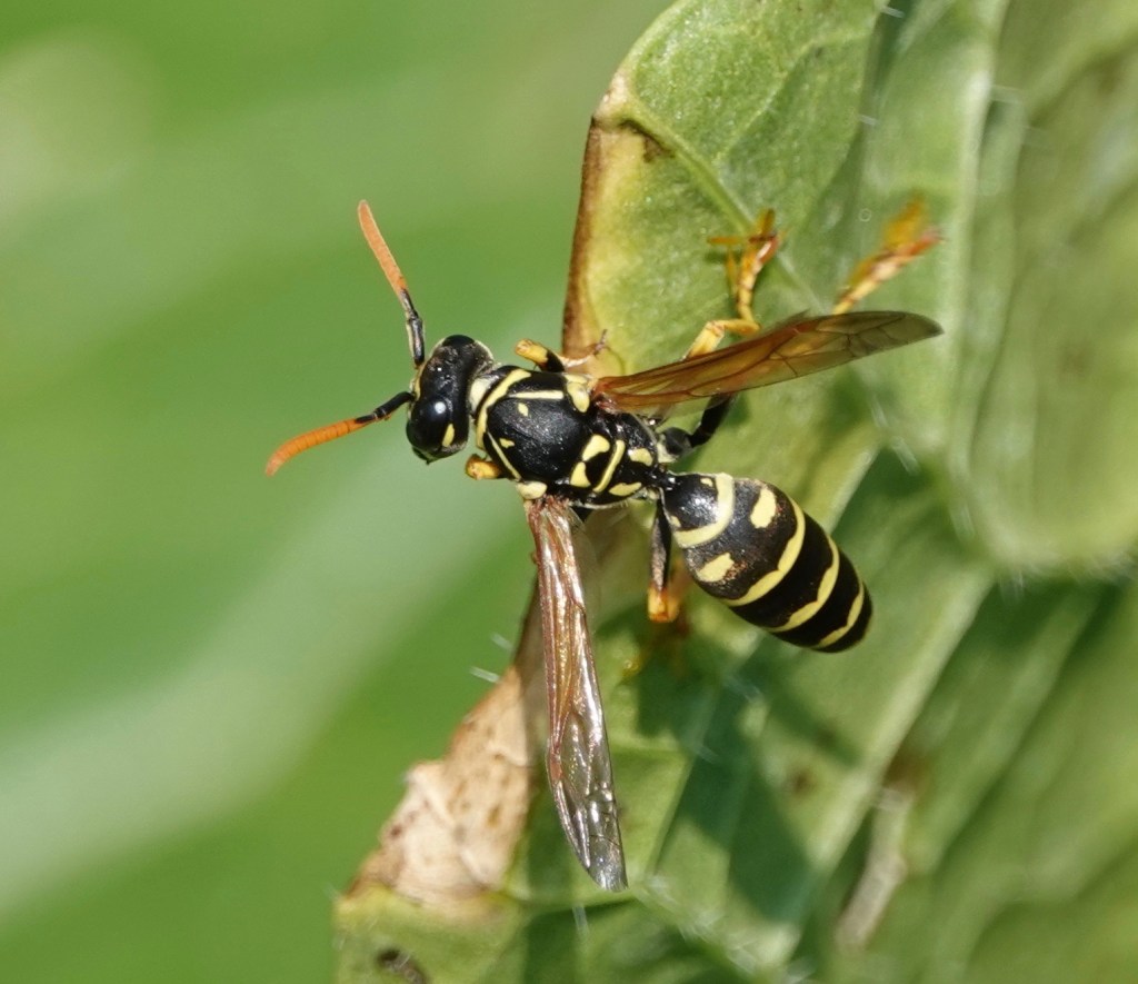 European Paper Wasp, Polistes dominula. Note the diagnostic orange antennas. It may look like a Vespula ground yellowjacket in its black and yellow finery, but these antenna instantly mark if off as something else.