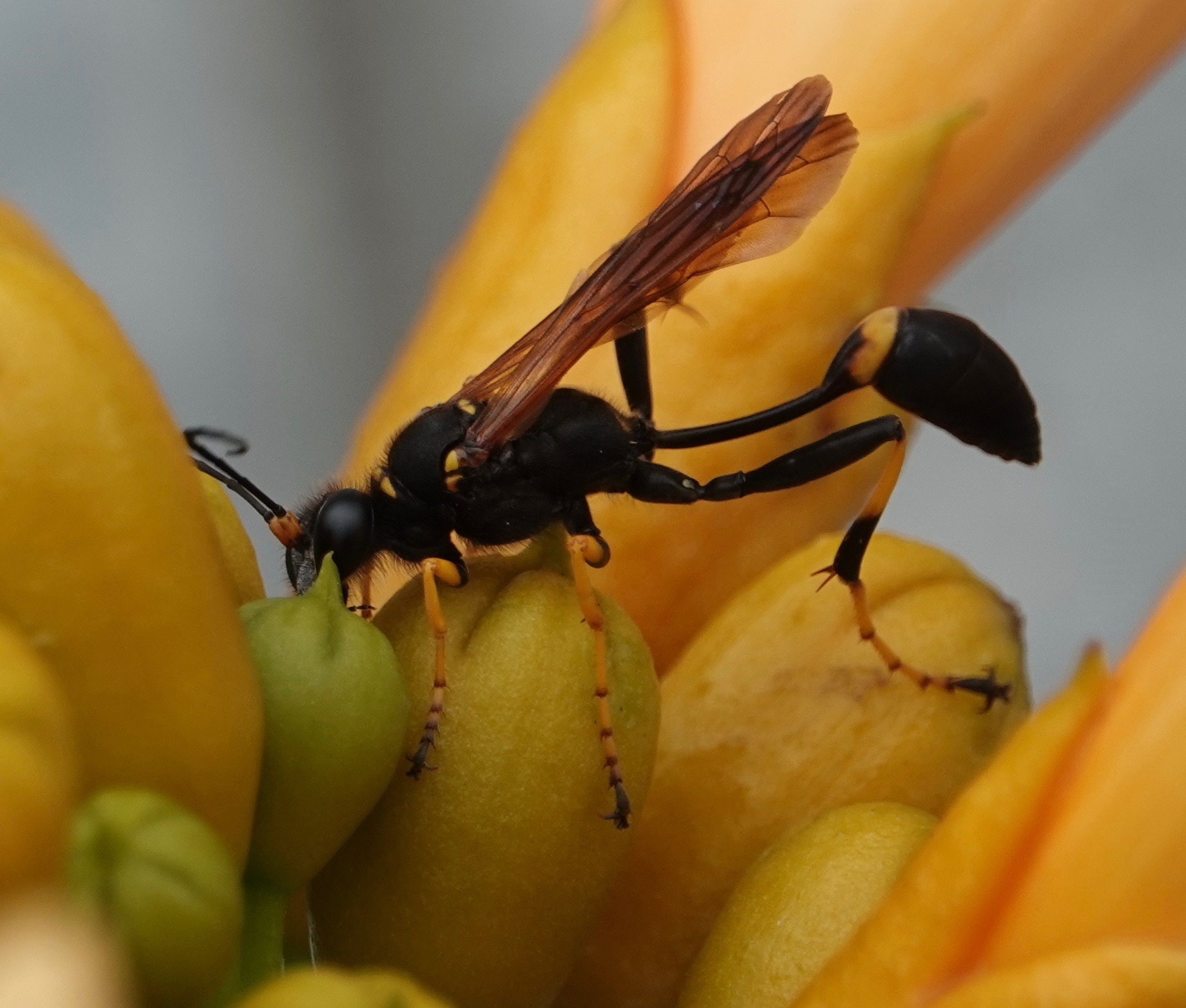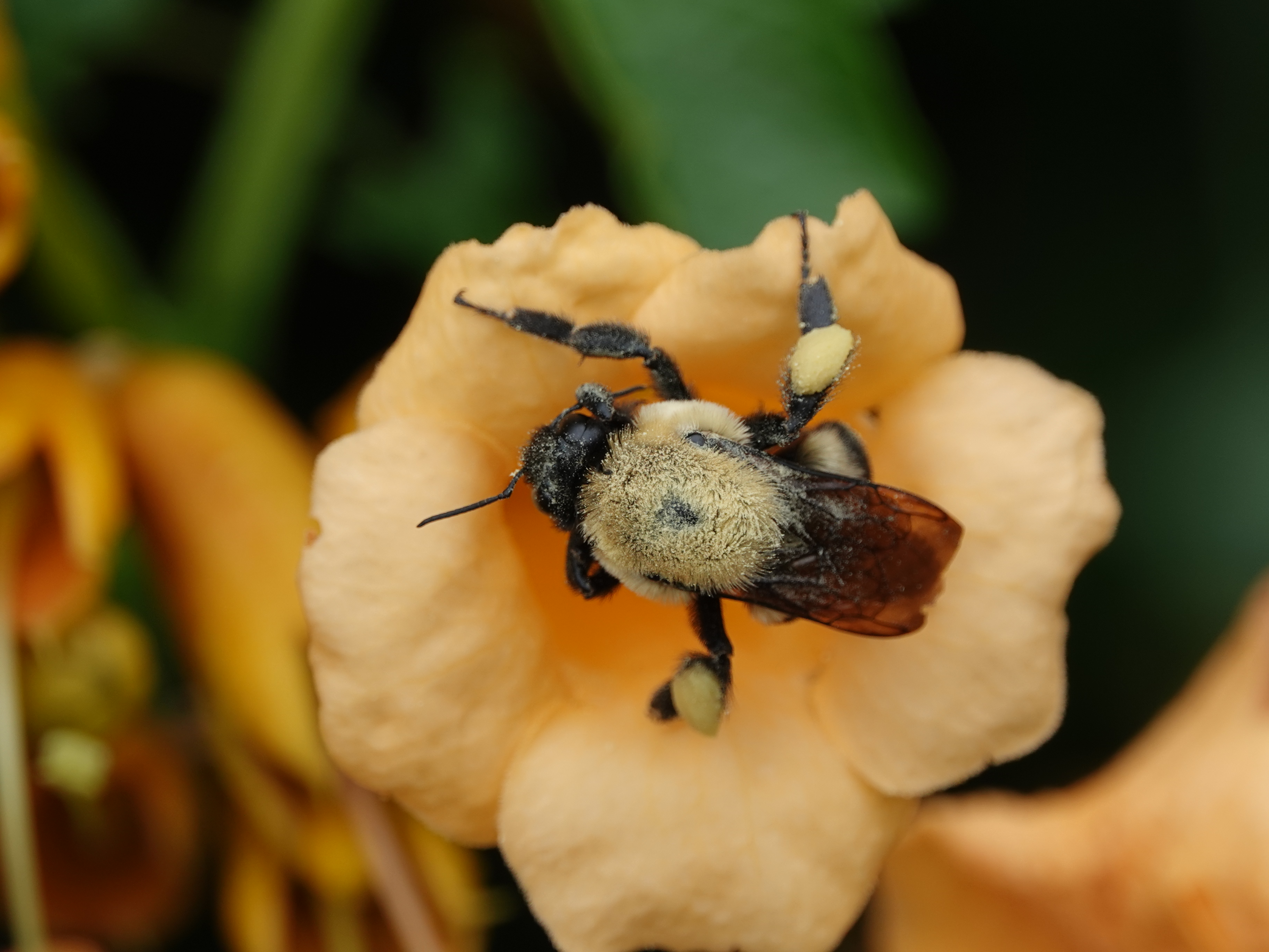 Aesthetically, I’m not so sure about this yellowy-orange version of trumpet vine. But we have to abandon our perspectives. This messy, sprawling vine attracts insects with a vengeance.