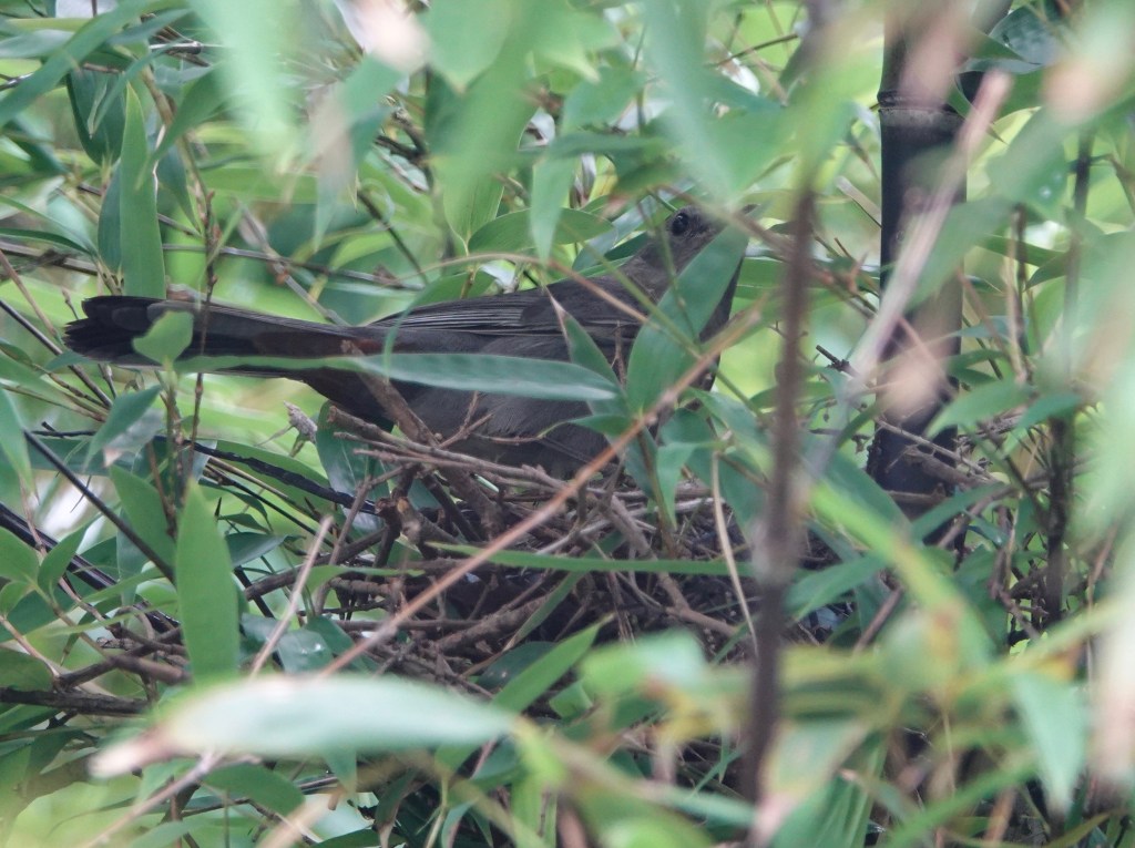 Back on the 12th, I spotted my first Gray Catbird nest. A pair were flying in nest-lining material. Sure seems late in the season, but they could be working on a second brood. This nest is about 10-15 feet up in a small bamboo grove, which is no place I ever thought to look.