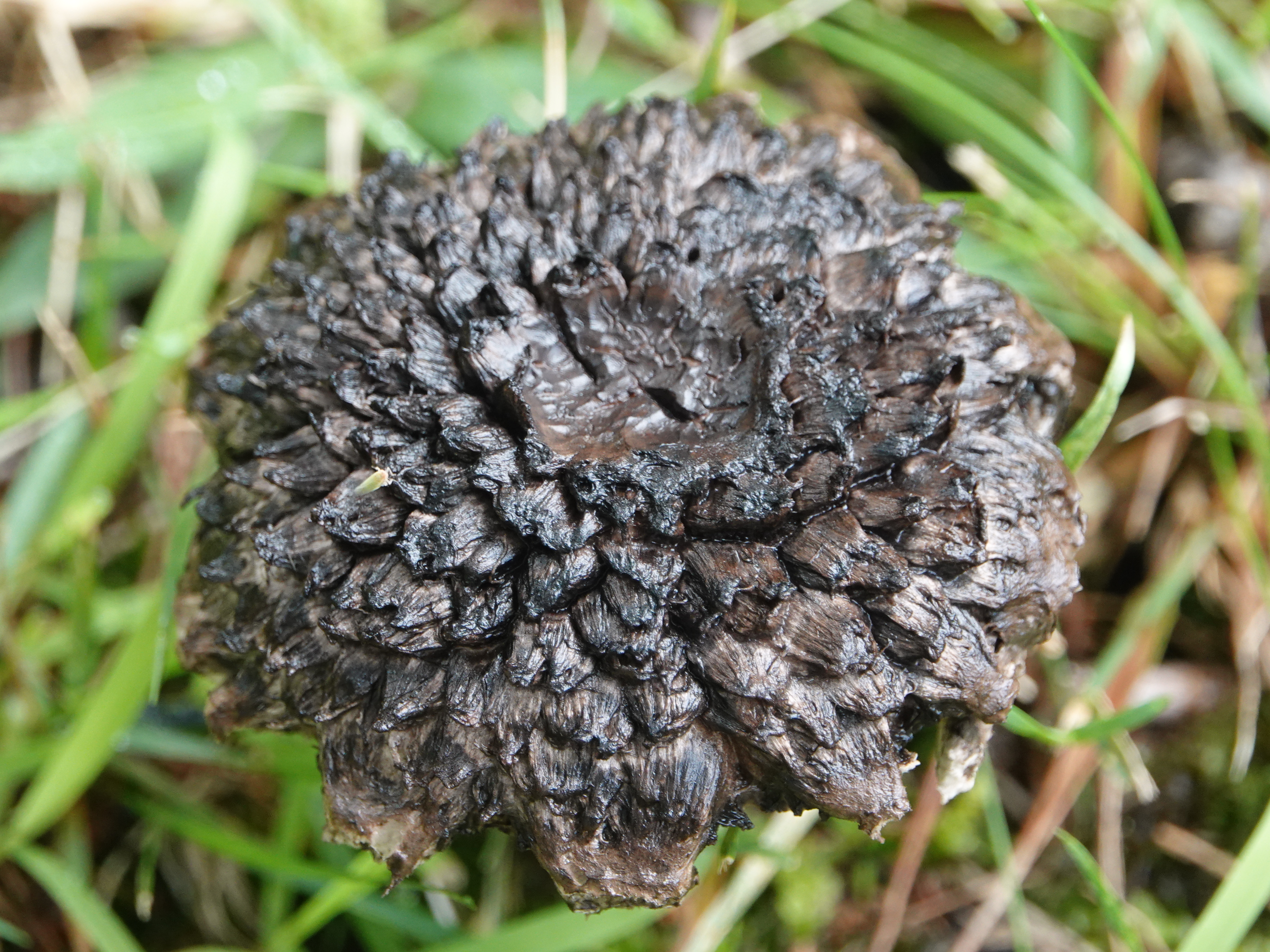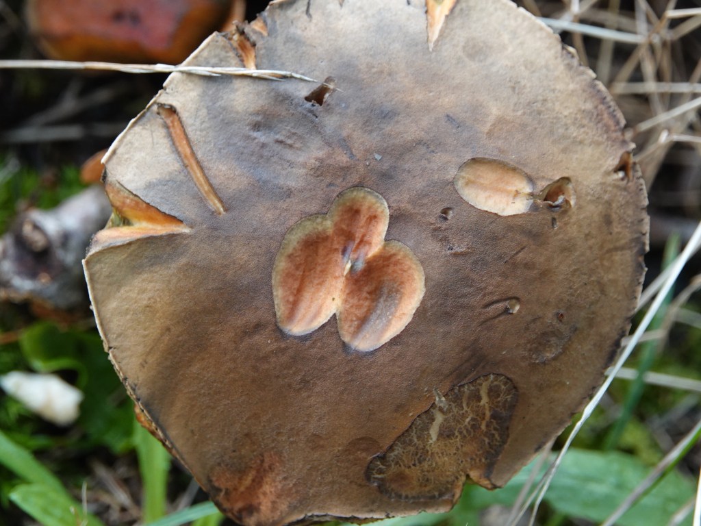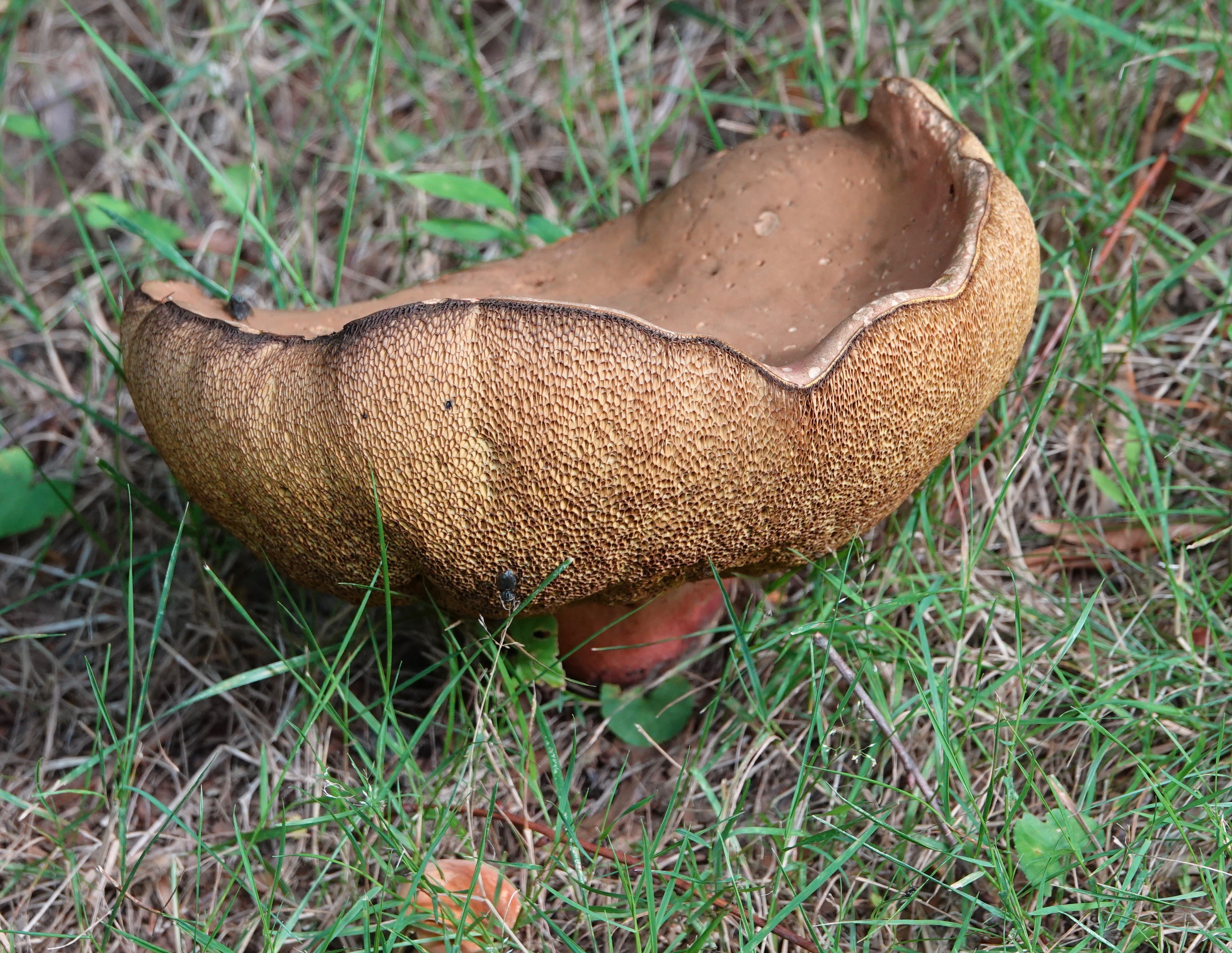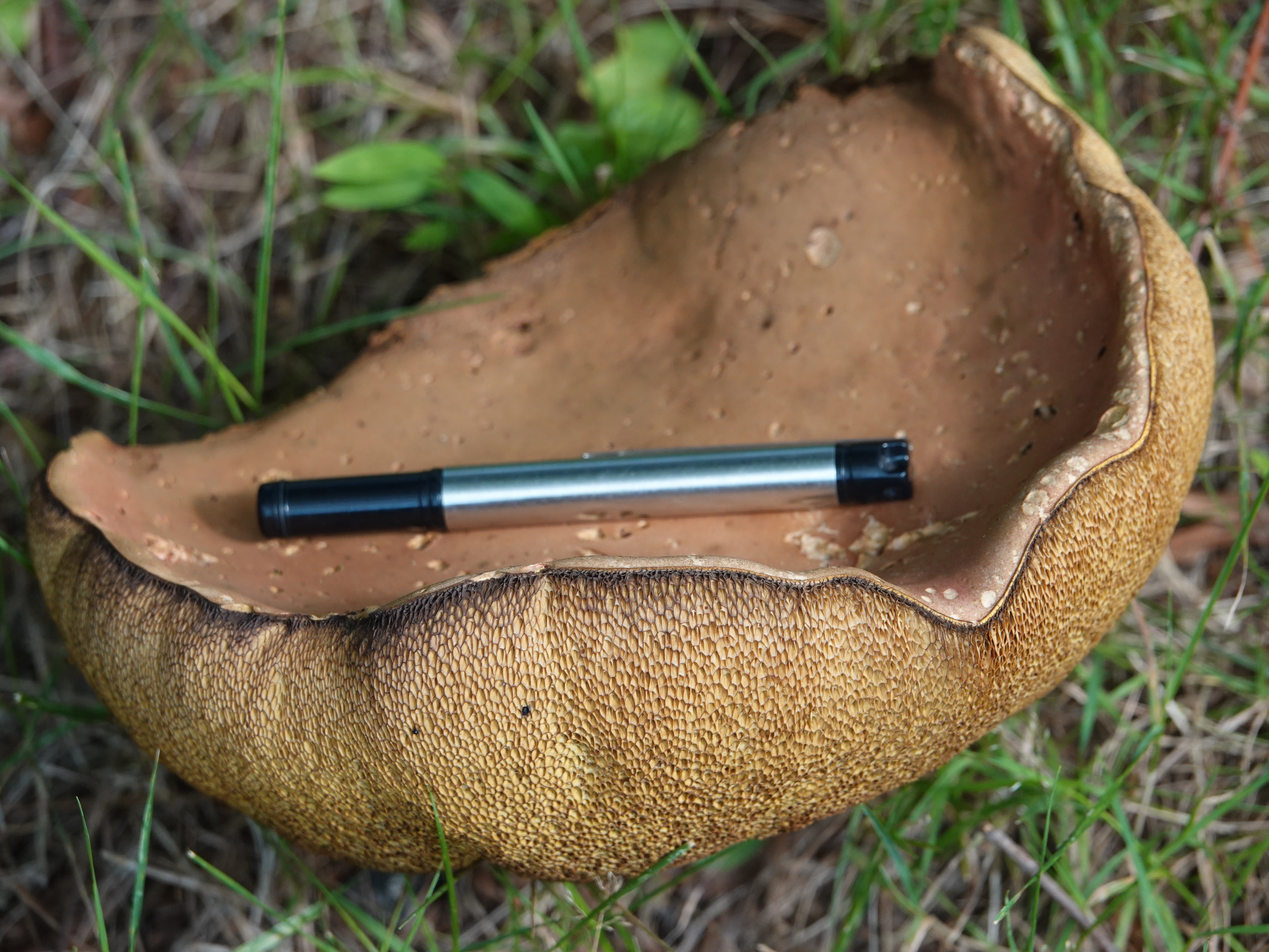Another enormous specimen. A bolete this time. The pen is 3.75″ or 9.5cm long.The next day, tiny orange-eyed flies were all over this.