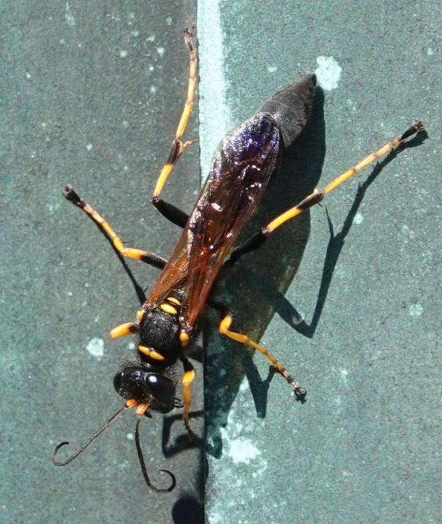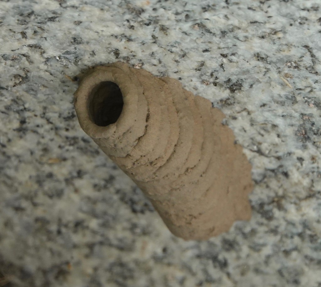 As is often the case with these scales, I didn’t notice the webbing and small spider, much smaller than the type hunted by these wasps, until I looked at this photo.