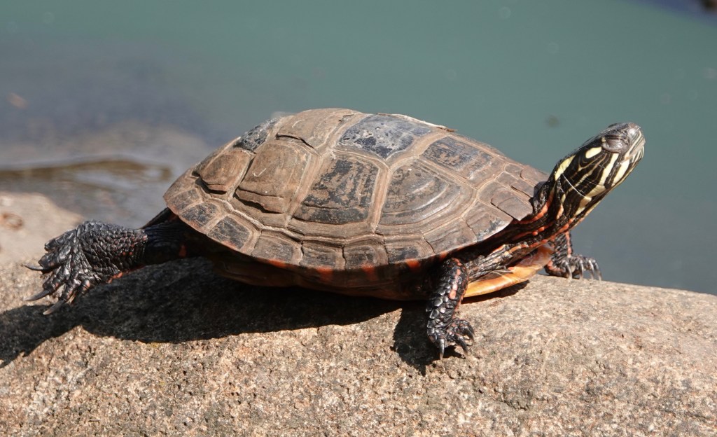 A piece of turtle carapace found along the edge of Valley Water.This is keratin, the same material found in nails/claws, hooves, hair, horns. In turtles, these horny plates cover the bone of the shell.Here’s a Painted Turtle with some exfoliation of the scutes or plates visible. My sample above looks too big for this Painted, the only one I’ve seen Valley Water, so it probably came from a Red-eared Slider.