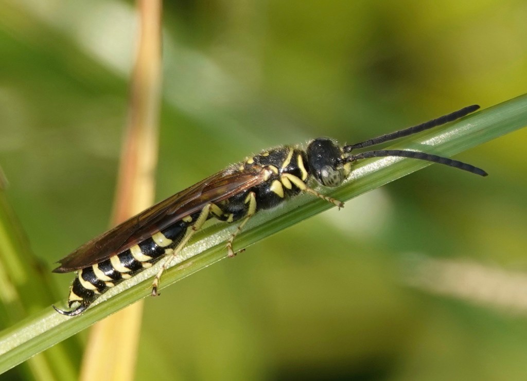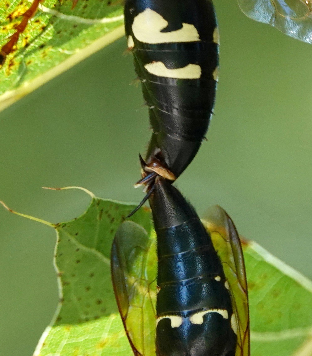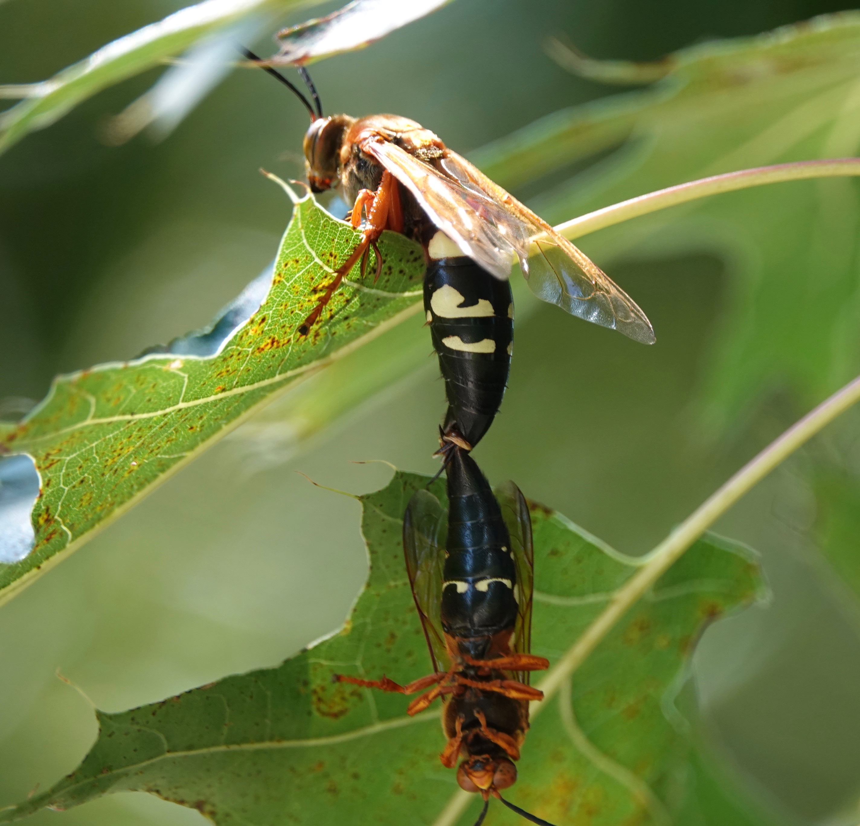 Eastern Cicada-killer Wasps (Sphecius speciosus) mating.The larger female is holding onto the leaf, the smaller male dangling.Obviously a strong bond. A different kind of wasp entirely, but note that back end…This is a Five-banded Thynnid Wasp (Myzinum quinquecinctum). But, because this is a male, this isn’t a stinger. Stingers in the Hymenoptera are modified ovipositors: only females can sting. On the male, this is described as a pseudostinger.