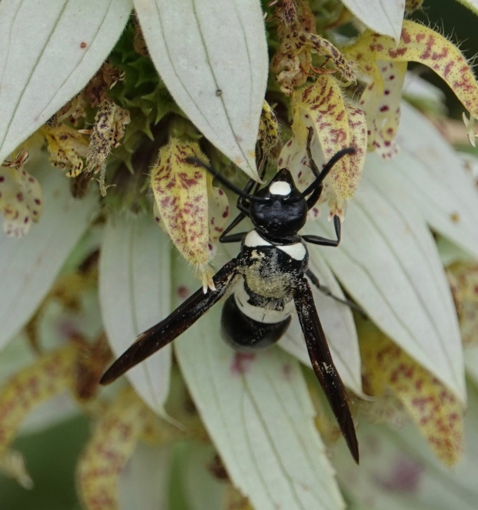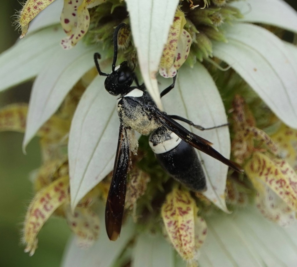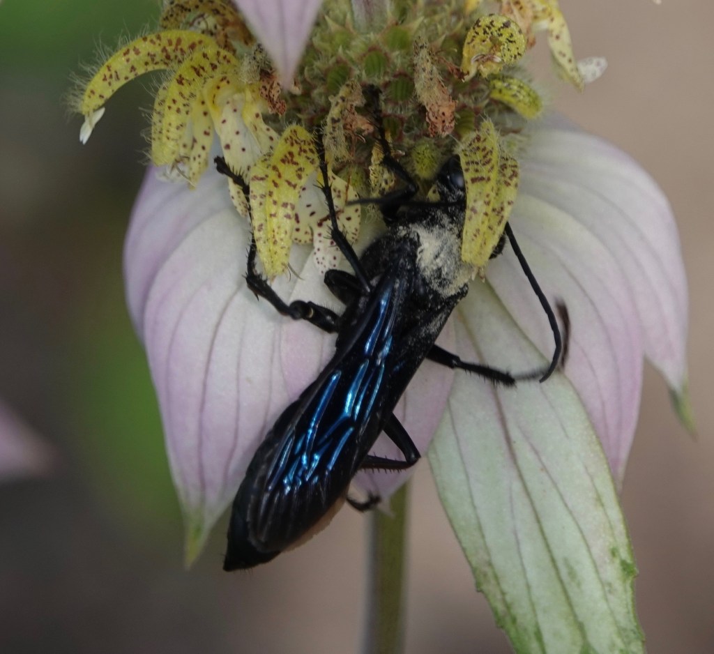 Wasps don’t get much credit for pollinating flowers, but there’s no escaping the pollination-reach of Spotted Horse Mint (Monarda punctata) A Four-toothed Mason Wasp (Monobia quadridens), above, shows pollen on wings, thorax, and even some of the abdomen.