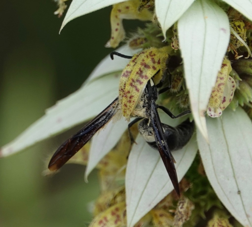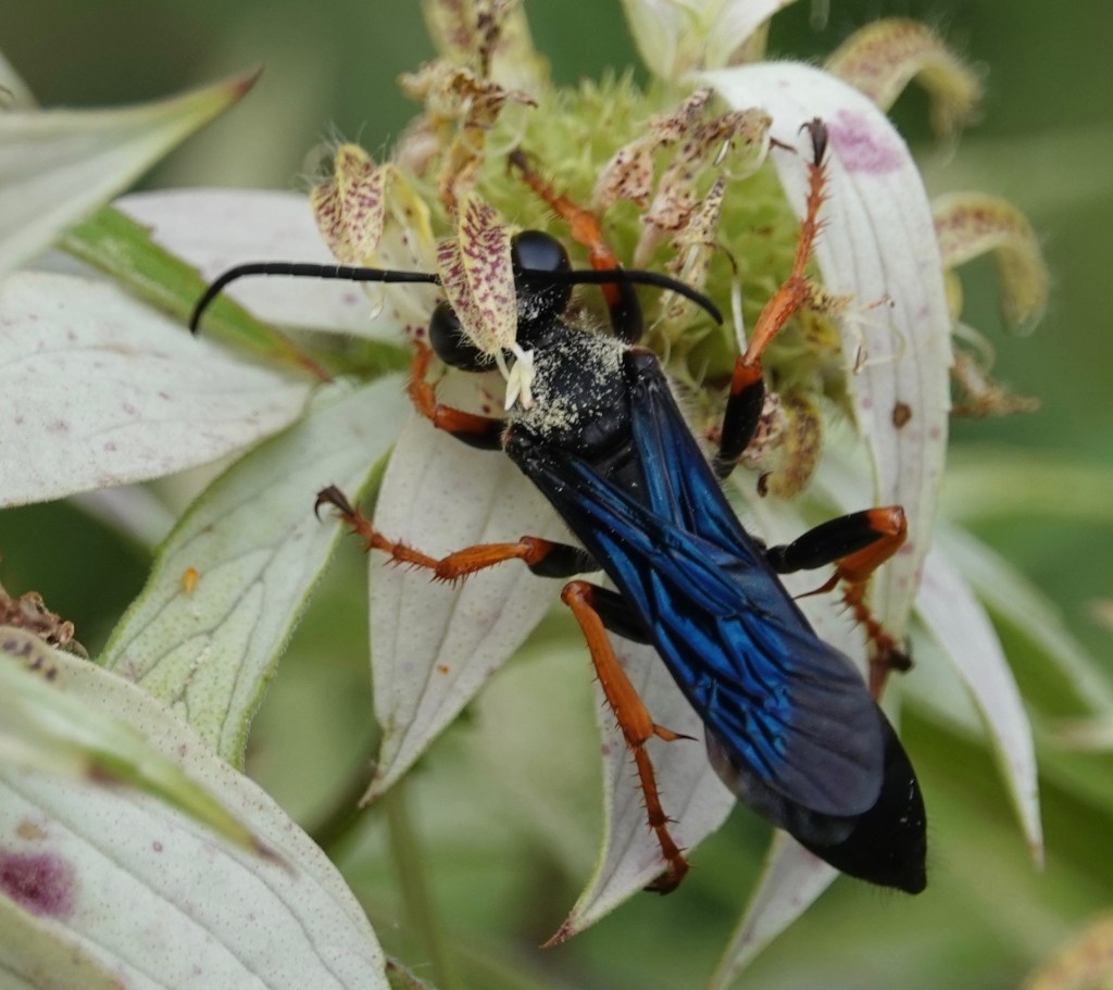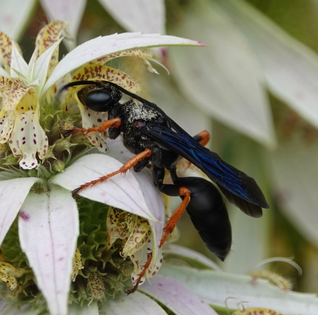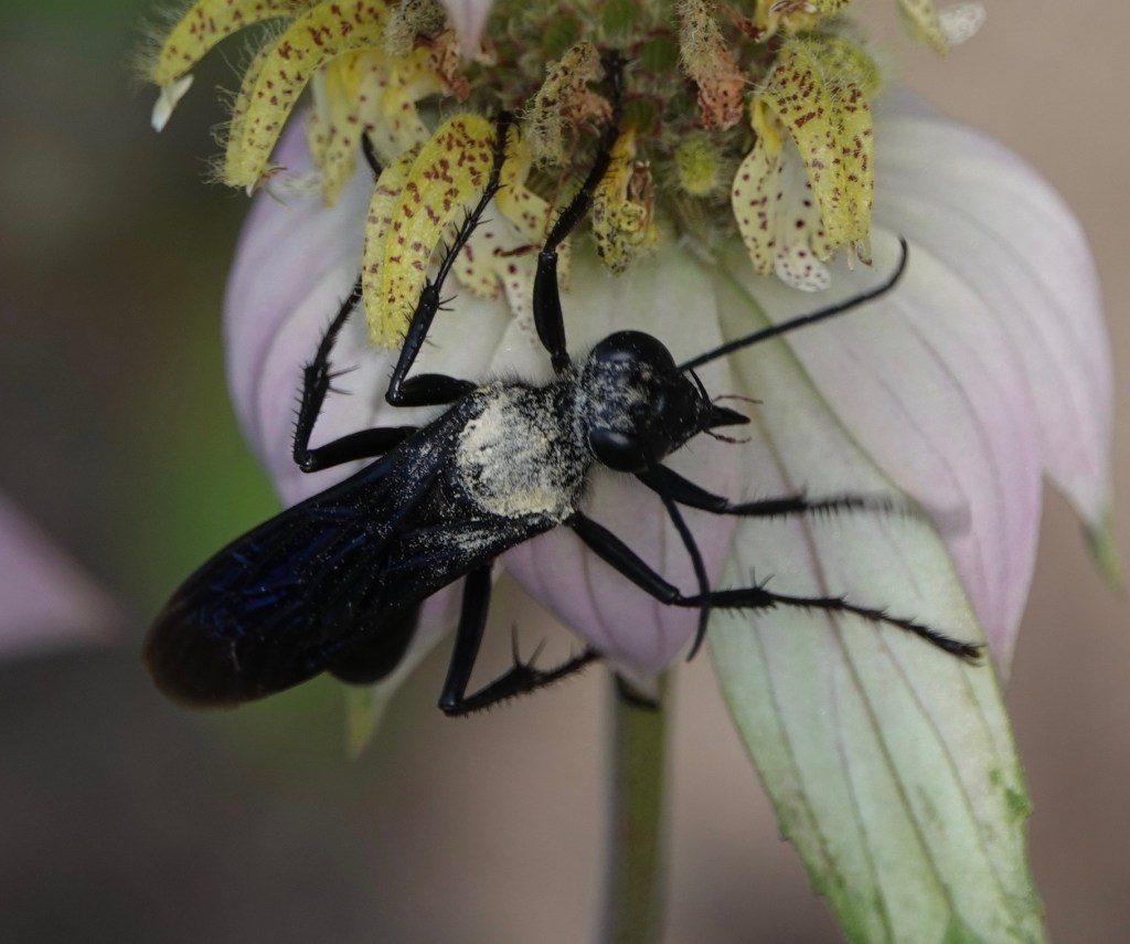 Great Black Digger Wasp (Sphex pensylvanicus). When I first saw one of these flitting rapidly between these flowers, I thought it was white on the thorax. But that’s all pollen.