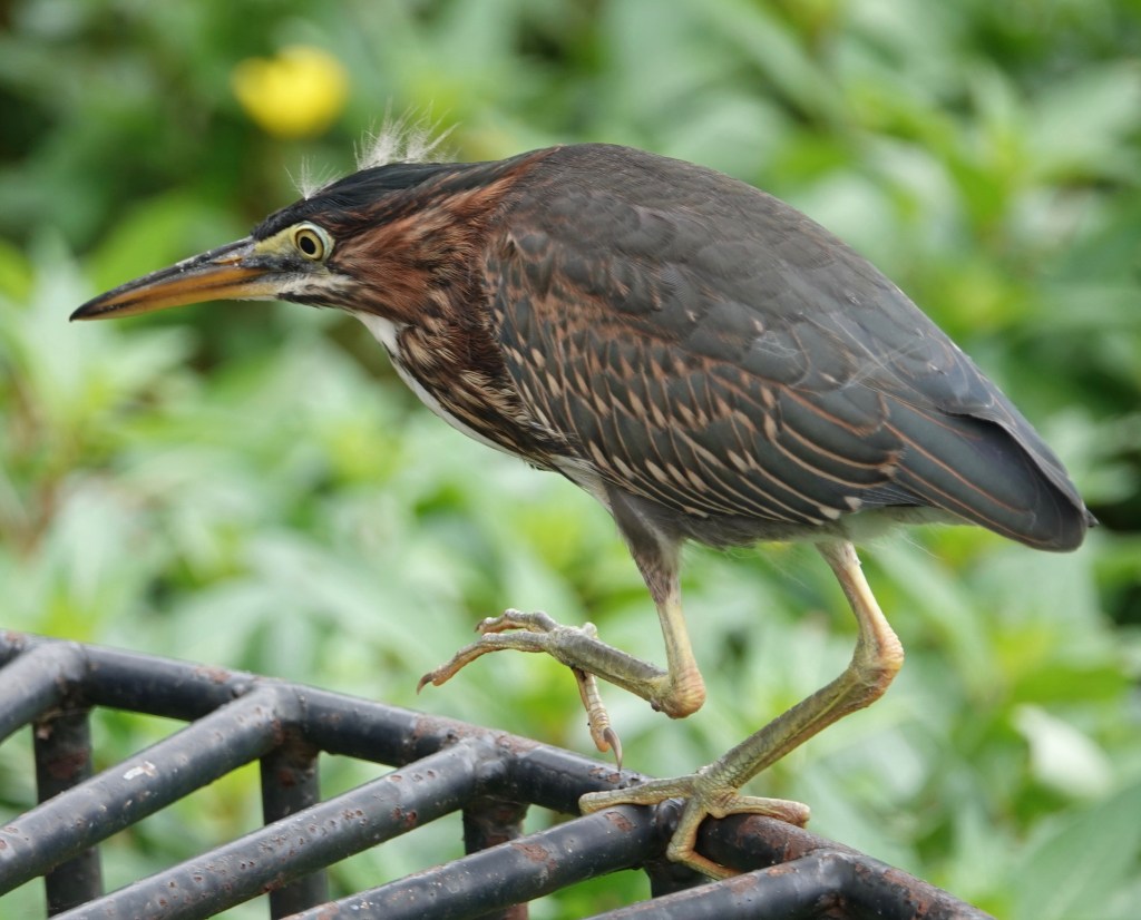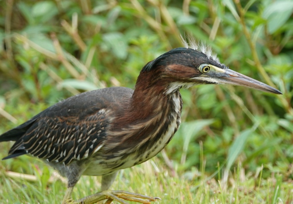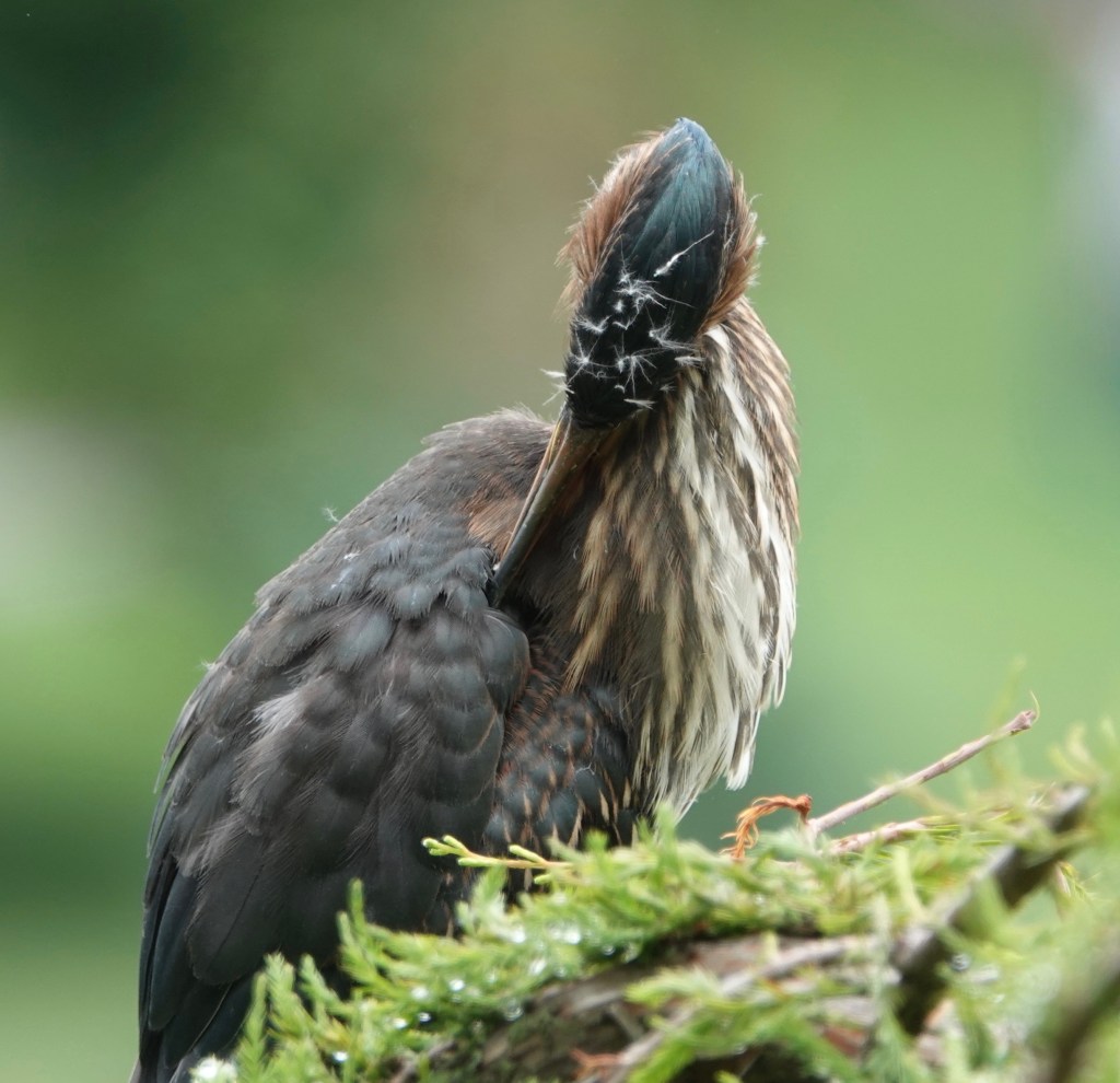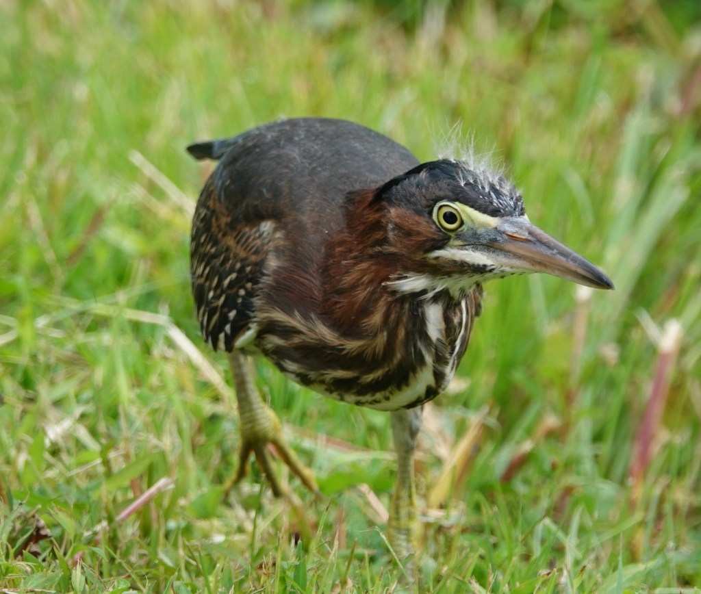 Nine days between sighting a trio of Green Heron fledglings in Green-Wood Cemetery and then re-seeing of all three of them together again. In between, there were a few days of seeing two of the fledglings at the same time. A fraught time that was! Did one not make it? But they’re still a triumvirate, and still a bit fuzzy on the head. Both of the adults have also been seen from time to time in the interim.
