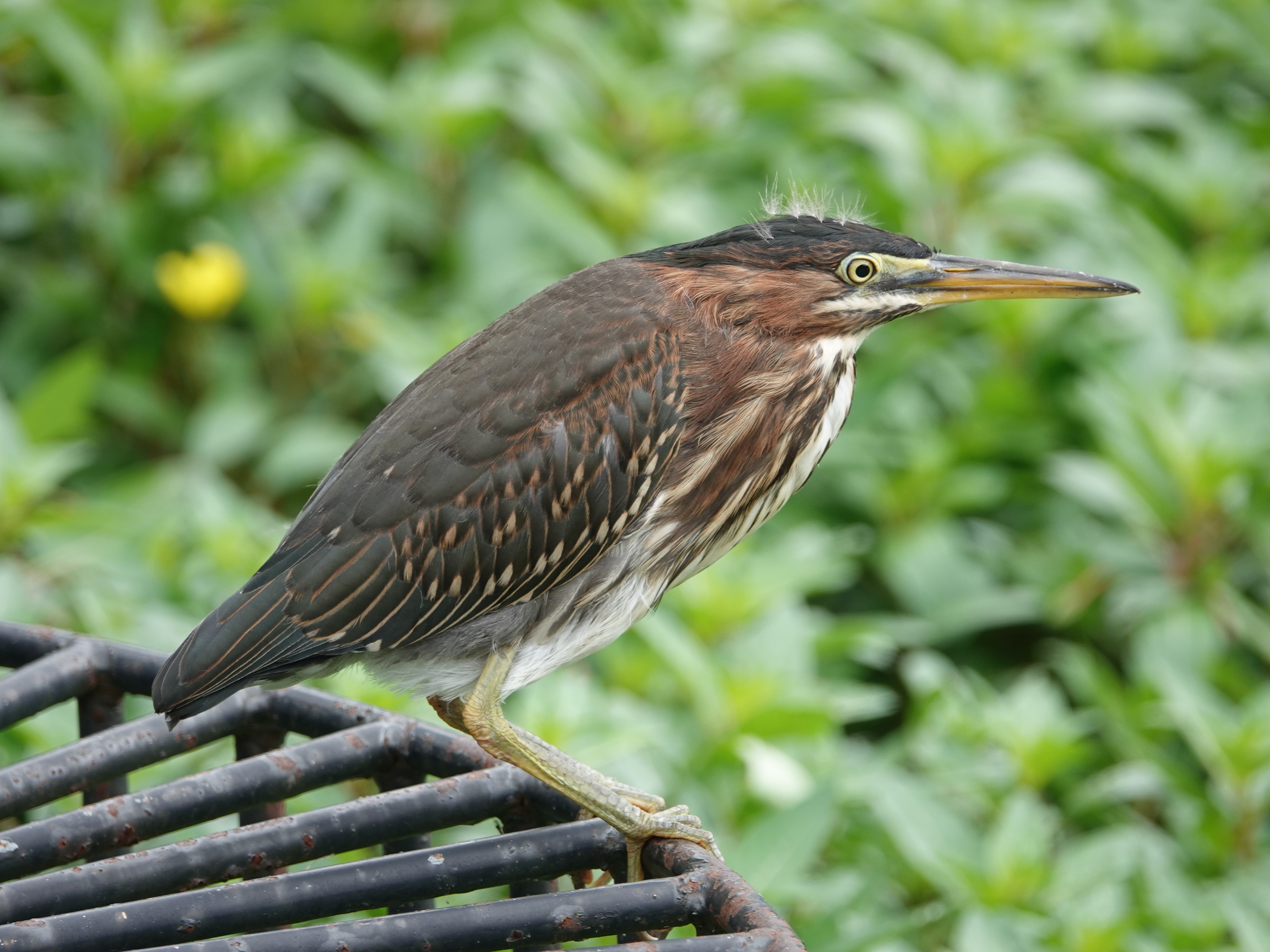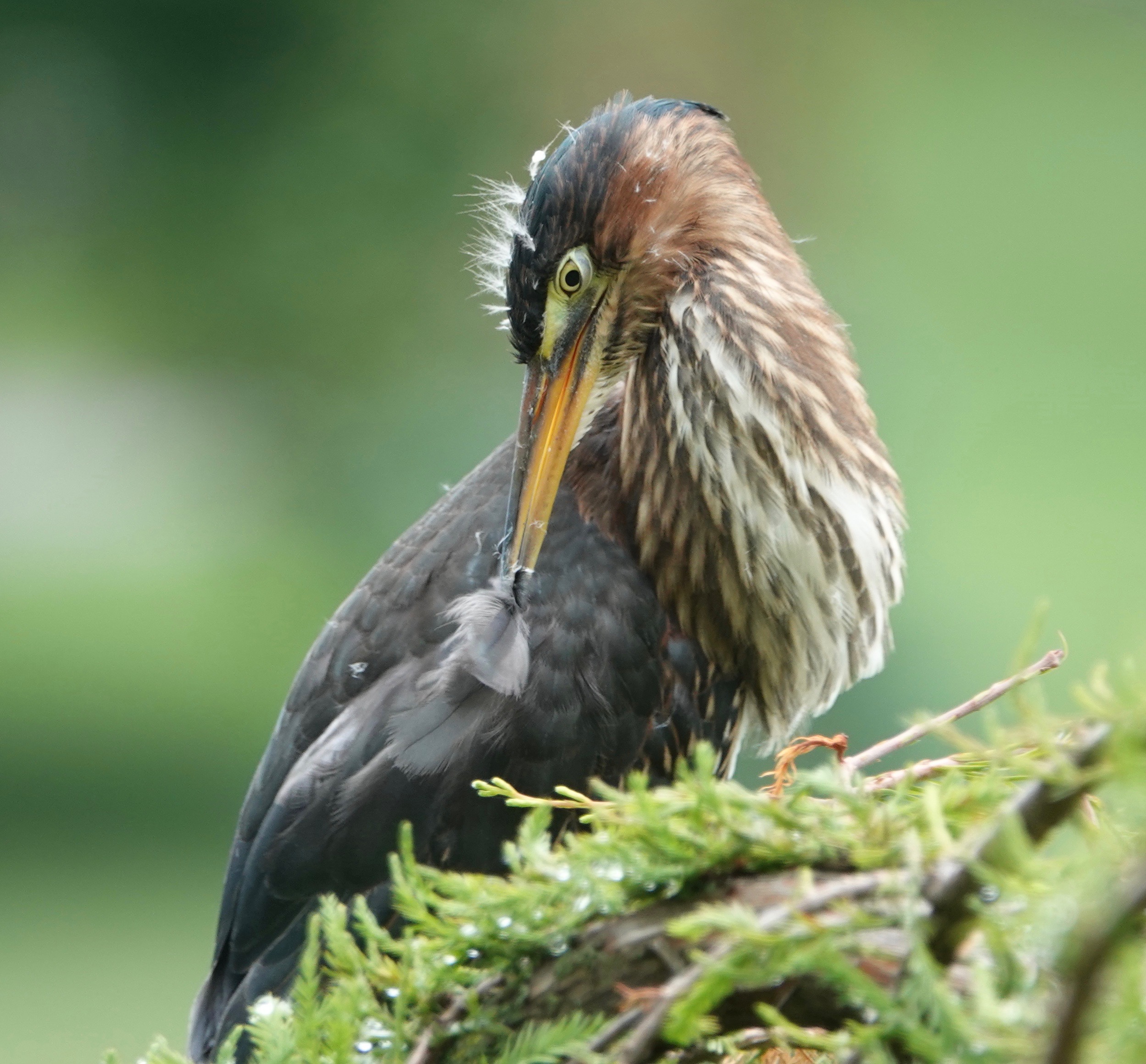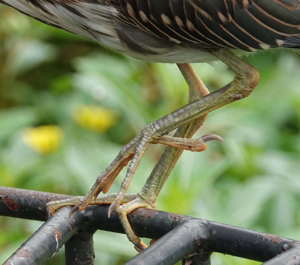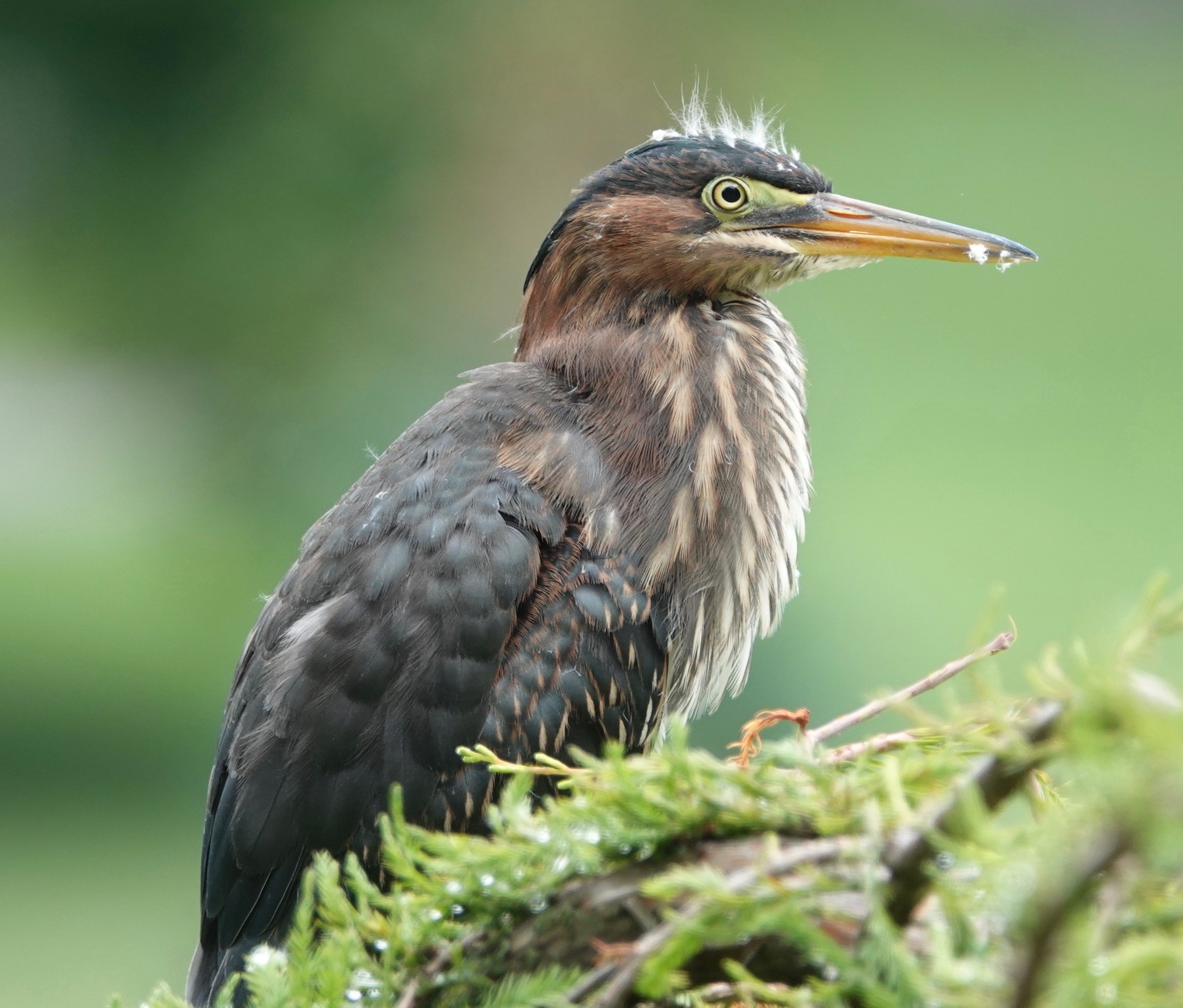 Nine days between sighting a trio of Green Heron fledglings in Green-Wood Cemetery and then re-seeing of all three of them together again. In between, there were a few days of seeing two of the fledglings at the same time. A fraught time that was! Did one not make it? But they’re still a triumvirate, and still a bit fuzzy on the head. Both of the adults have also been seen from time to time in the interim.