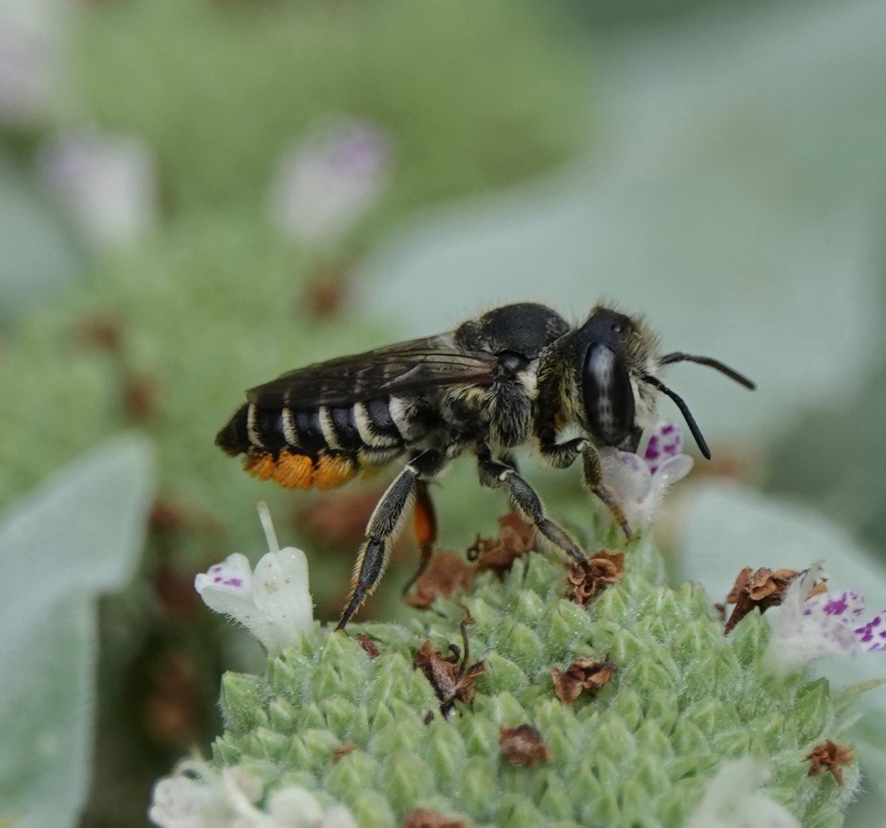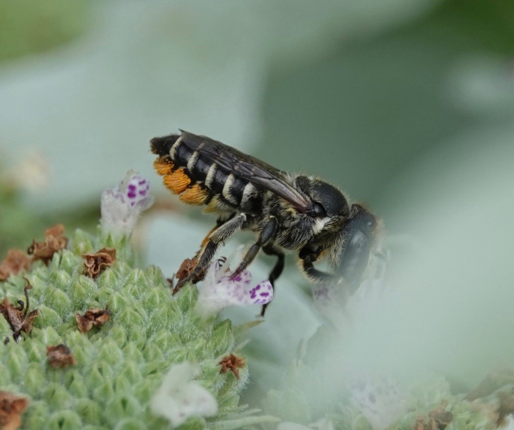 Another characteristic of this huge genus is that they carry pollen on the underside of their abdomen. So that glow you see is actually pollen in the hairs. Honey bees, bumble bees, and other bee species typically pack it around their hind legs.