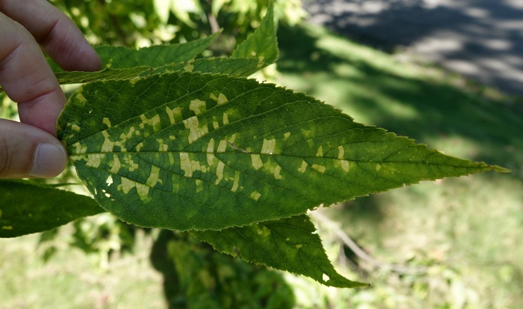 Hackberry Mosaic Virus. Also called island chlorosis. Not much explication of this, probably because the damage is cosmetic. I’d wager the genus is even in question. Viruses, people, are strange.