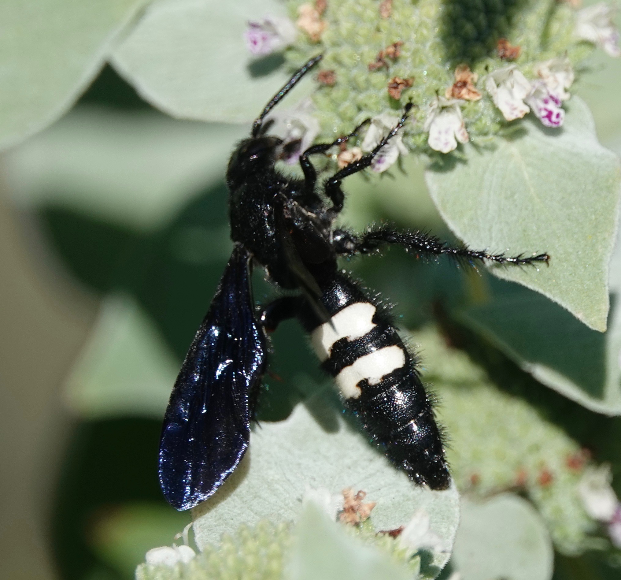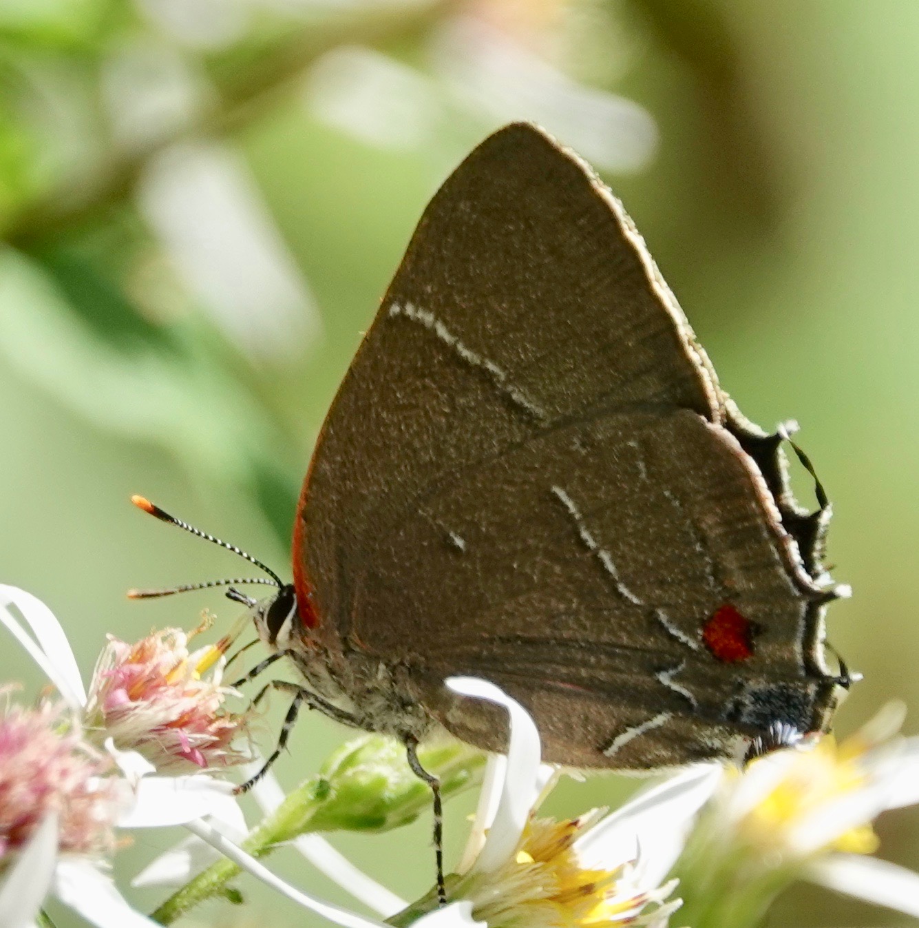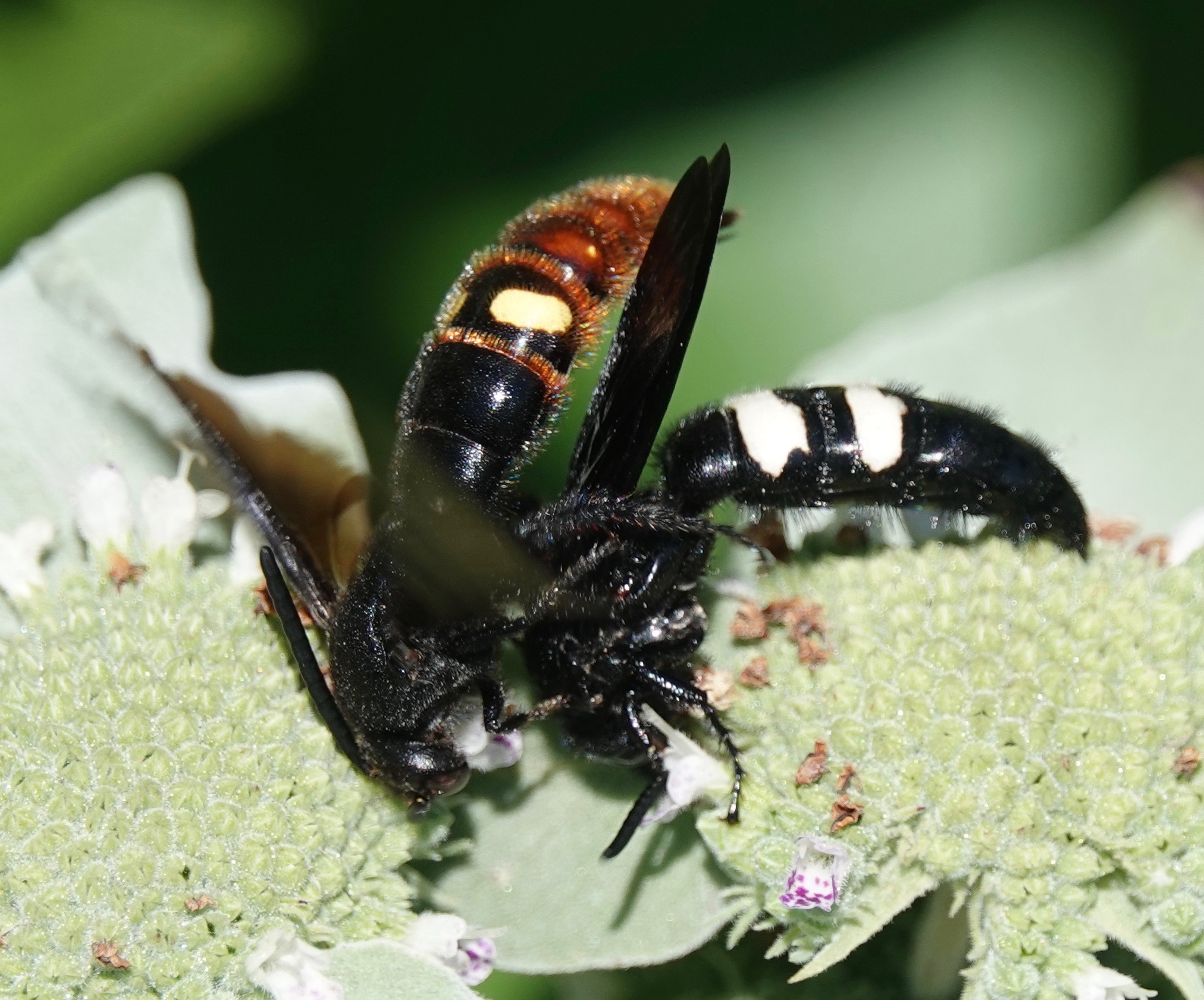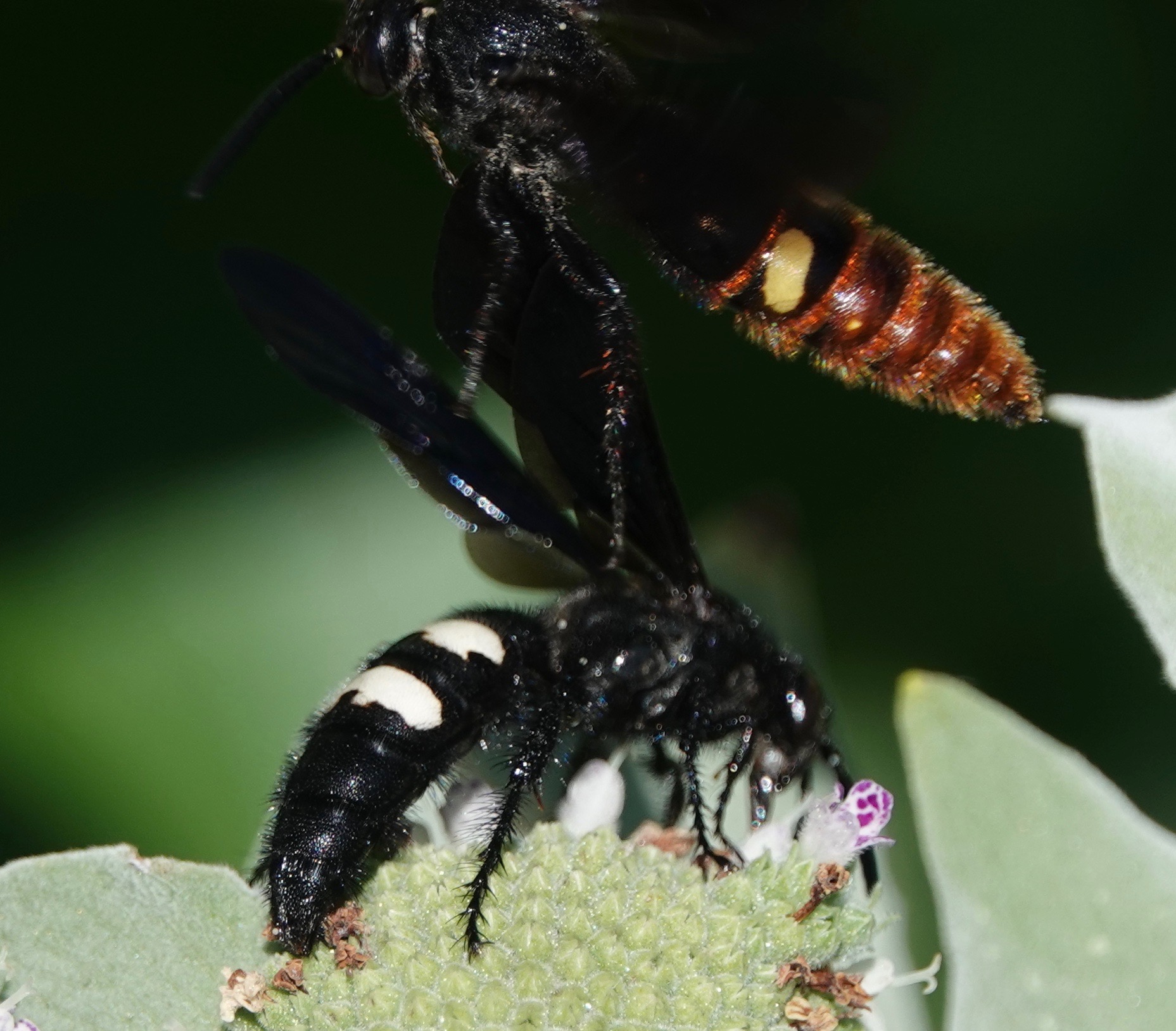 New, that is, to me. White M Hairstreak (Parrhasius m-album).Double-banded Scoliid Wasp (Scolia bicincta).This is the first iNaturalist record for Brooklyn, Kings Co., and Long Island as a whole. Interestingly, the common Two-Spotted Scoliid Wasp (Scoliadubia dubia) was NOT happy to see this genus-mate. The Two-spotteded went after the Doble-banded several times. Both Scolia wasps lay their eggs on scarab beetle larvae, so this may be competition.Sweetheart Underwing (Catocala amatrix).Spotted Grass Moth (Rivula propinqualis).